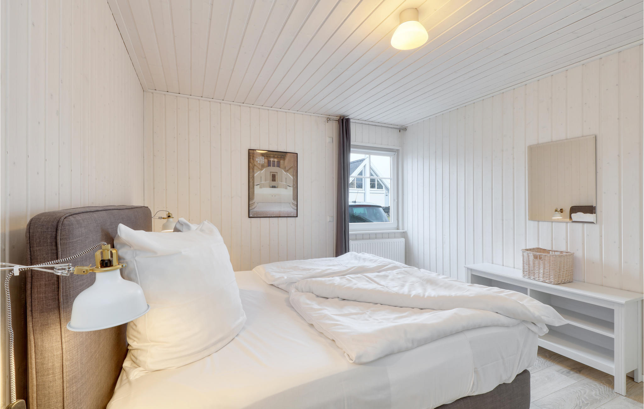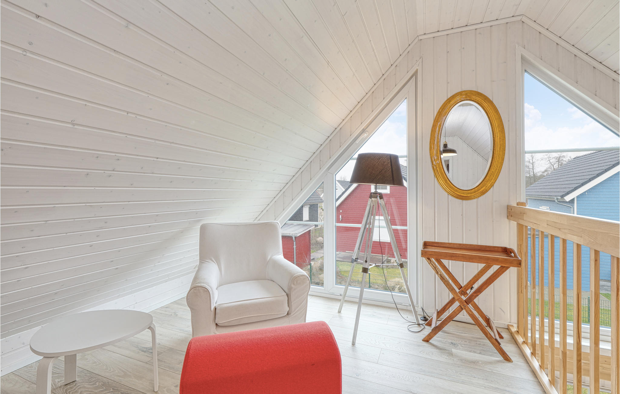Dank der galerieartig angelegten ersten Etage und der riesigen Panoramafenster, die sich vom Boden bis zum Dach erstrecken, ist das Haus besonders hell und freundlich. Der Blick fällt immer wieder und von überall her auf die bezaubernde Landschaft, das Wasser und das bunte Treiben rundum. Von der Terrasse aus haben Sie einen Blick auf die Landschaft.