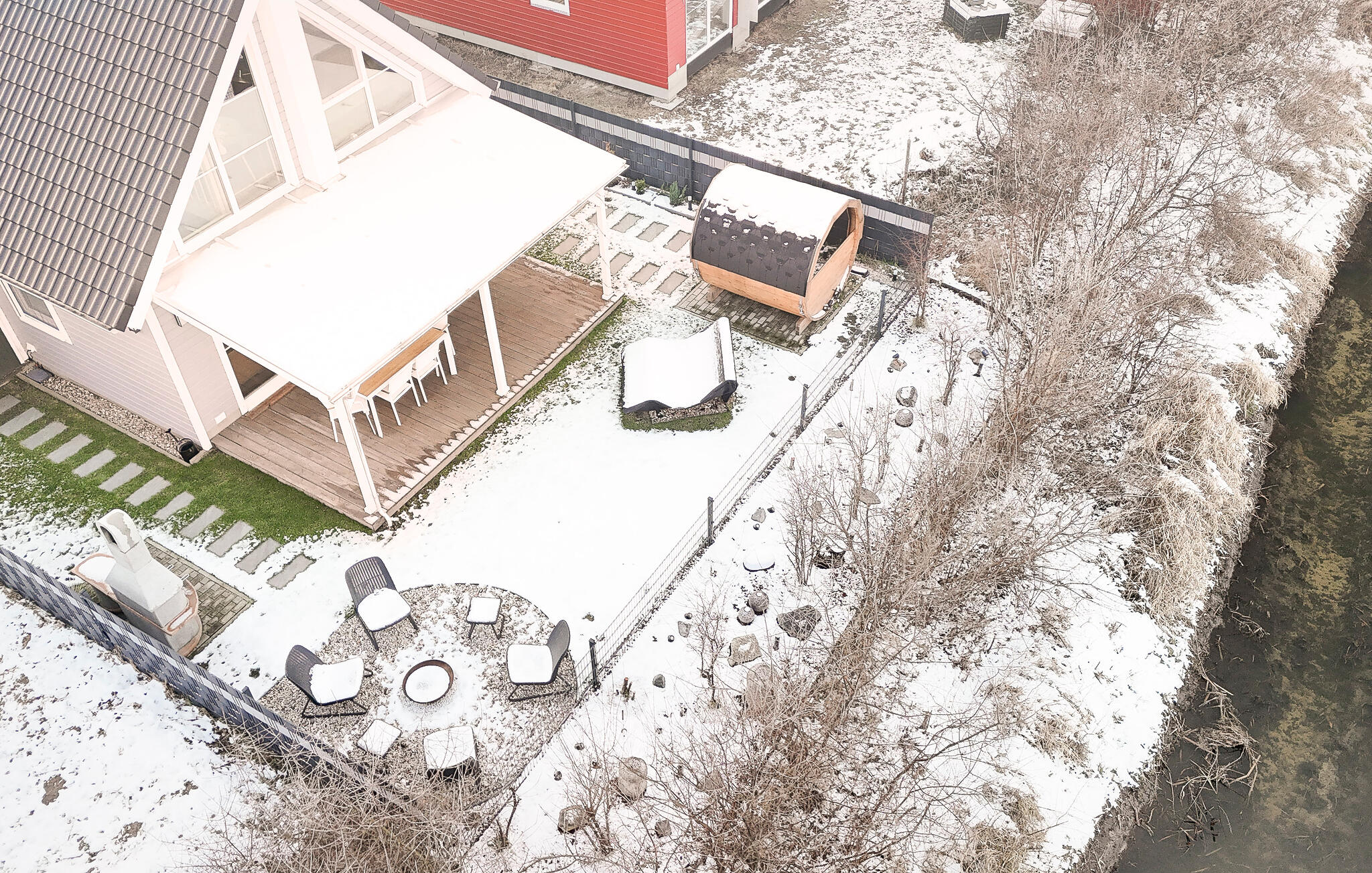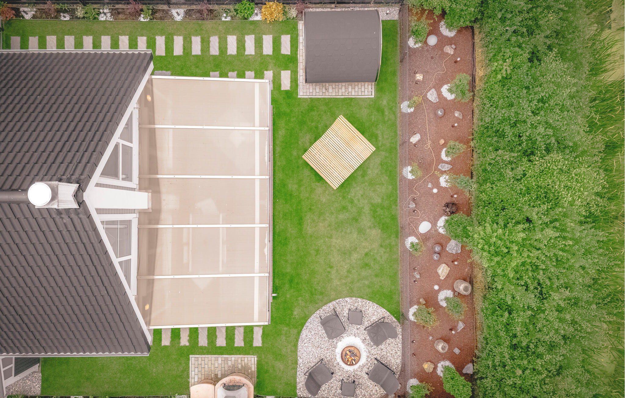 Der liebevolle Garten mit einer großen, überdachten Holzterrasse ist der perfekte Ort für laue Abende oder den funkelnden Sternenhimmel an der Feuerstelle zu beobachten. In der privaten, elektrischen Sauna können Sie bei auswählbaren Aufgüssen entspannen um anschließend unter freiem Himmel köstliche Grillgerichte zu genießen.