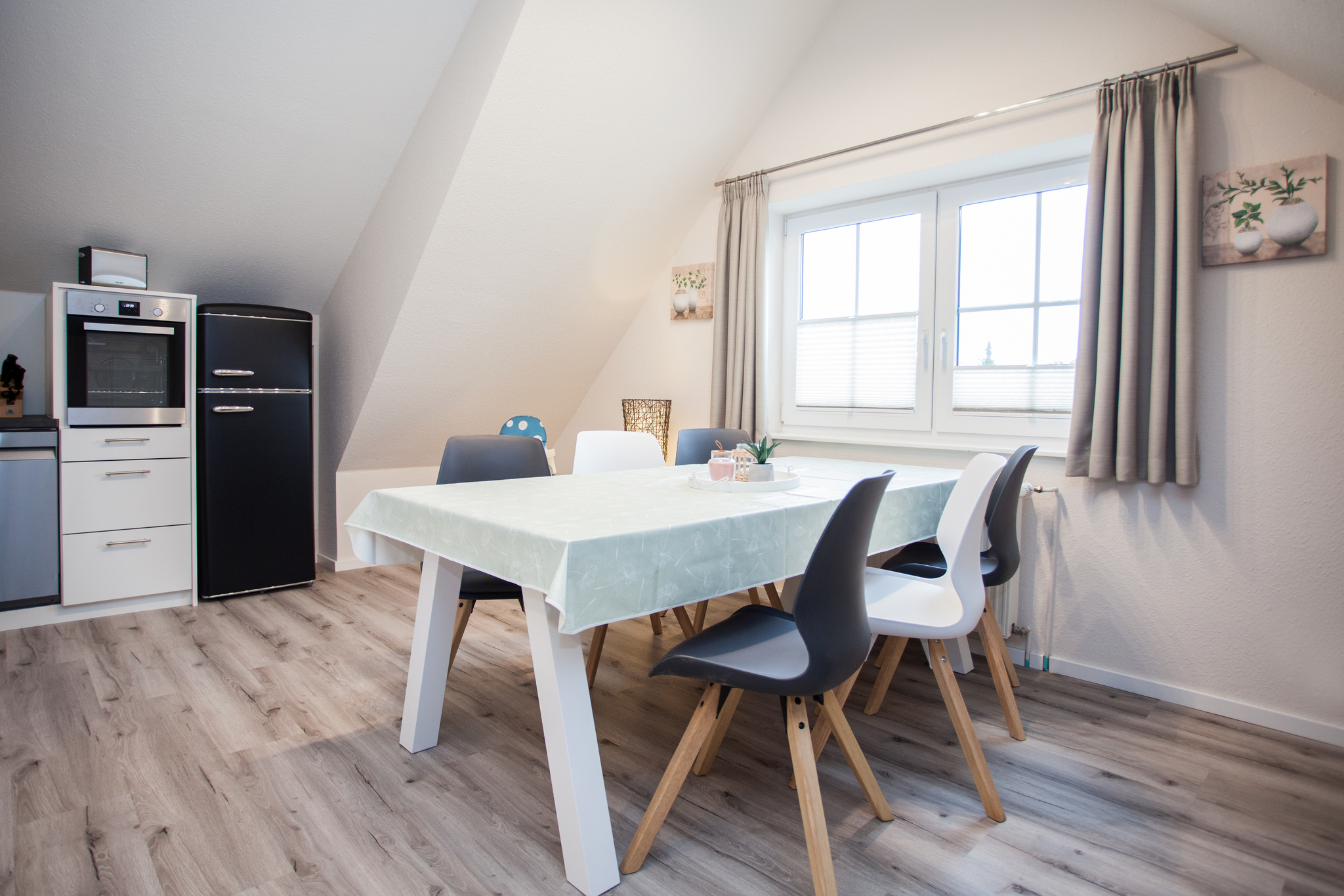 Eine Etage höher befindet sich das große Wohnzimmer mit Küche und Essbereich. Die Kombination aus Wohnzimmer und Esszimmer schafft eine gemütliche, heimelige Atmosphäre. Hier können Sie es sich auf dem Sofa gemütlich machen und Smart TV schauen oder am Esstisch ein Gesellschaftsspiel spielen. In diesem Zimmer gibt es auch einen Hochstuhl. Die offene Küche ist mit Mikrowelle, Herd, Kühlschrank mit Gefrierfach, Toaster, Wasserkocher und (Filter-) Kaffeemaschine ausgestattet.