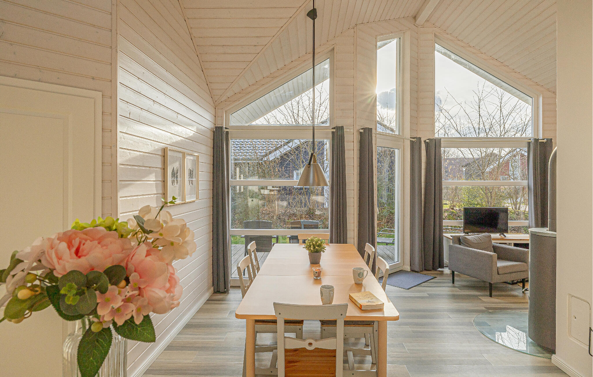 Dieses moderne Holzhaus liegt besonders nah an der Badebucht, nur ca. 50 m vom Wasser entfernt. Hier können Sie an warmen Sommertagen den See vor der Haustür genießen. Das Haus überzeugt durch den skandinavischen Stil und bietet ausreichend Platz für Ihren Urlaub. Aufgrund der firsthoch offenen Decke genießen Sie hier ein angenehmes Raumgefühl und lichtdurchflutete Zimmer. Die maritime Einrichtung in hellen Tönen trägt zur Gemütlichkeit bei.