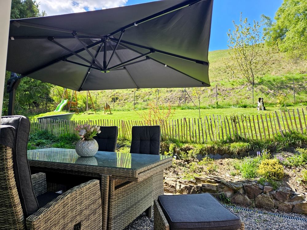 •  Terrasse mit ausziehbaren Tisch für bis zu 9 Personen