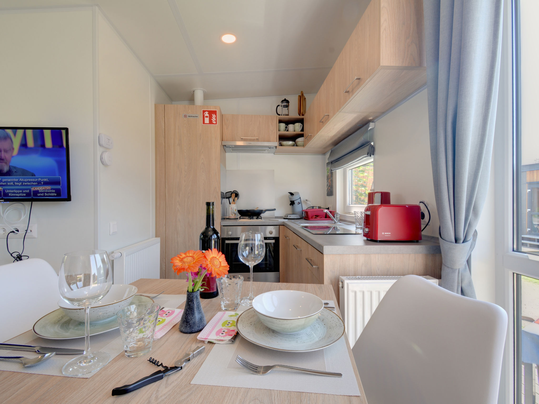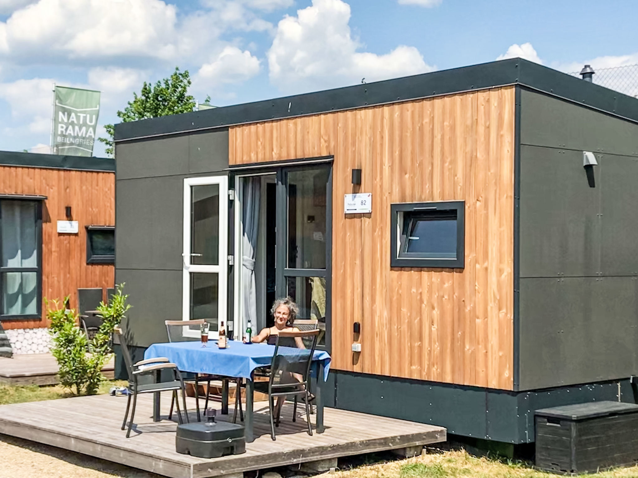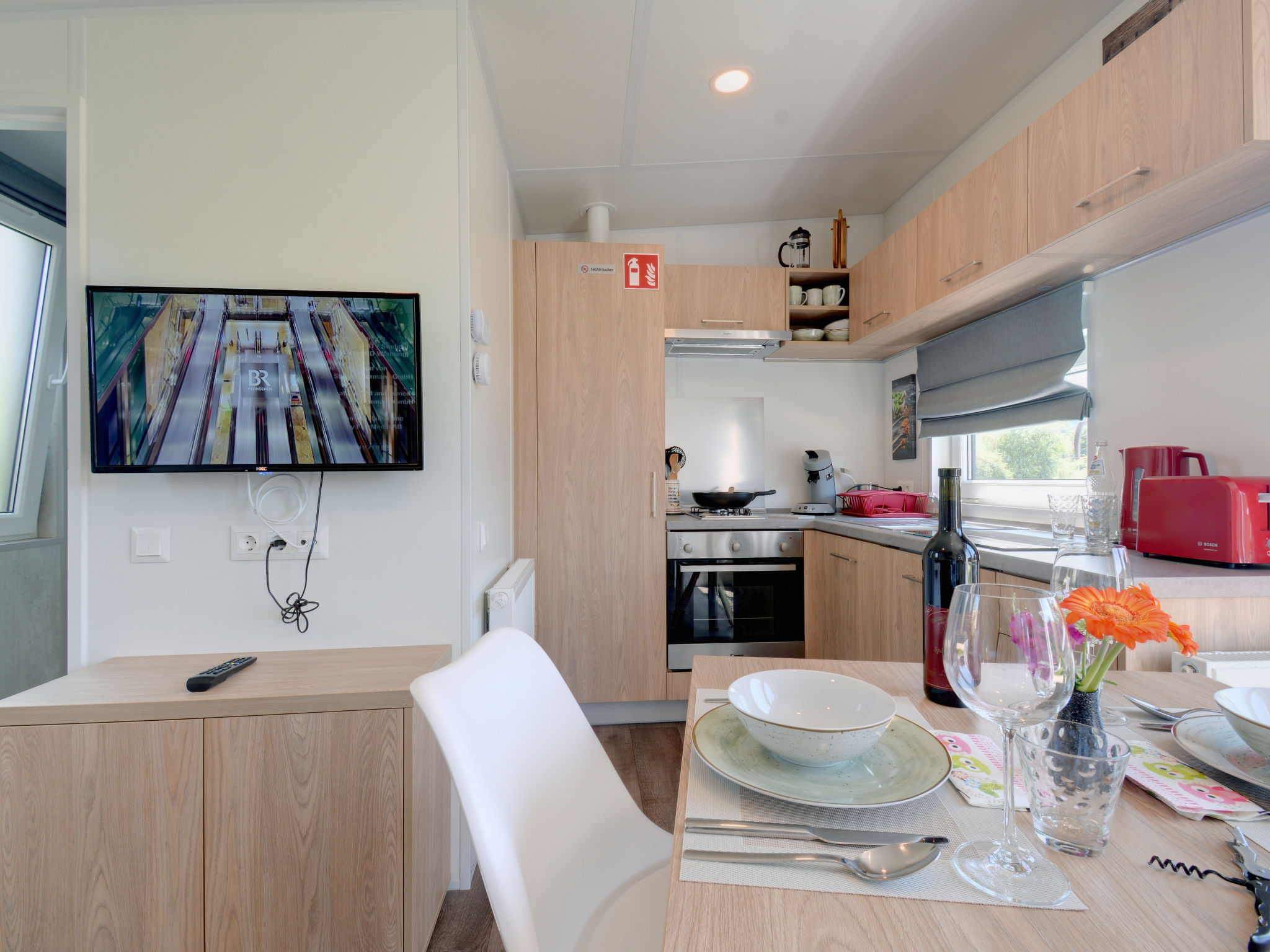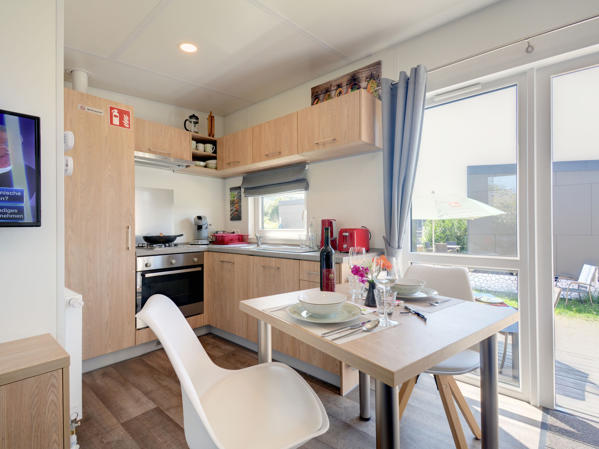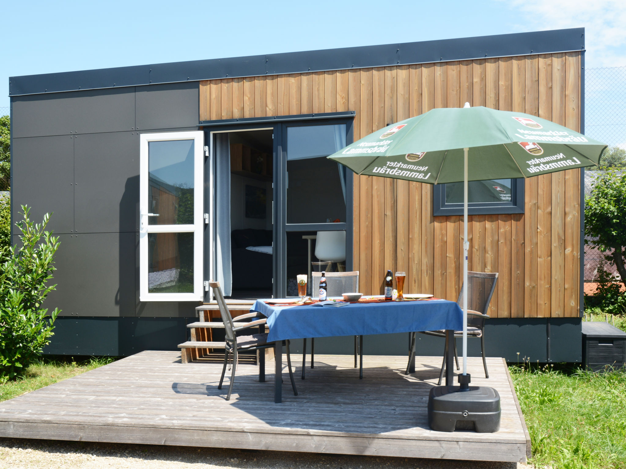 "Tiny Haus Andreas", 2-Zimmer-Mobilheim 25 m2. Objekt geeignet für 2 Erwachsene + 2 Kinder. Gemütlich eingerichtet: Wohn-/Schlafzimmer mit 1 Diwanbett (120 cm, Länge 170 cm), Sat-TV. 1 Zimmer mit 1 franz. Bett (140 cm, Länge 200 cm). Offene Küche (Backofen, Gasherd, 2 Flammen, Wasserkocher, elektrische Kaffeemaschine). Dusche/WC. E-Heizung. Kleine Terrasse. Terrassenmöbel. Parkplatz in 50 m. Bitte beachten: Nichtraucher-Haus. Maximal 1 Haustier/Hund erlaubt.