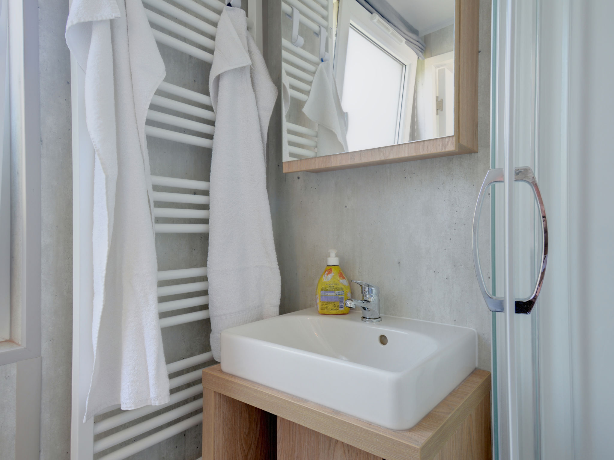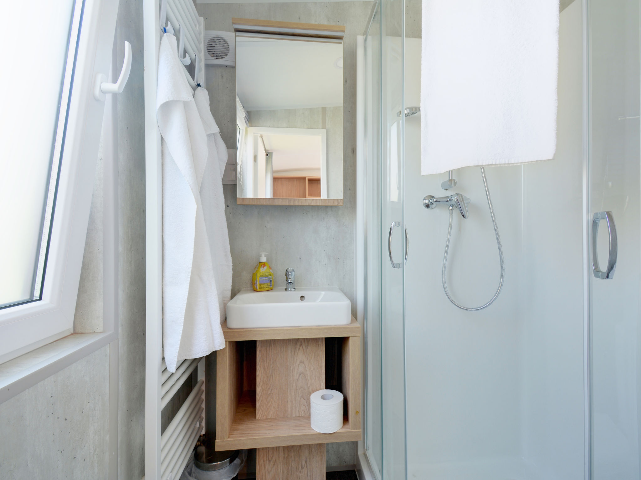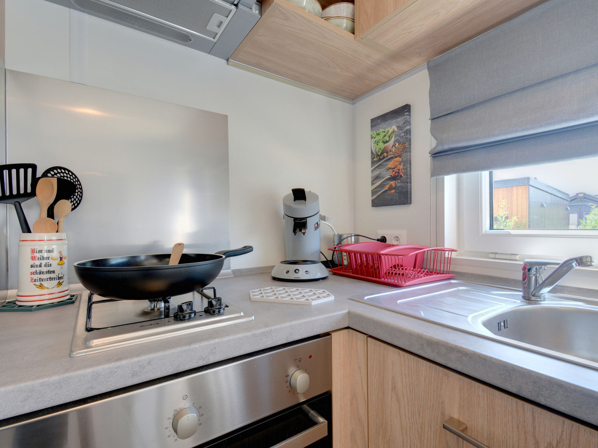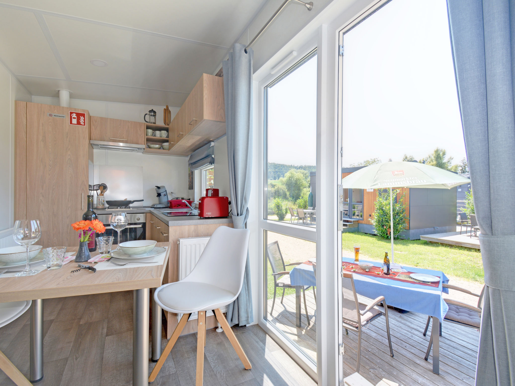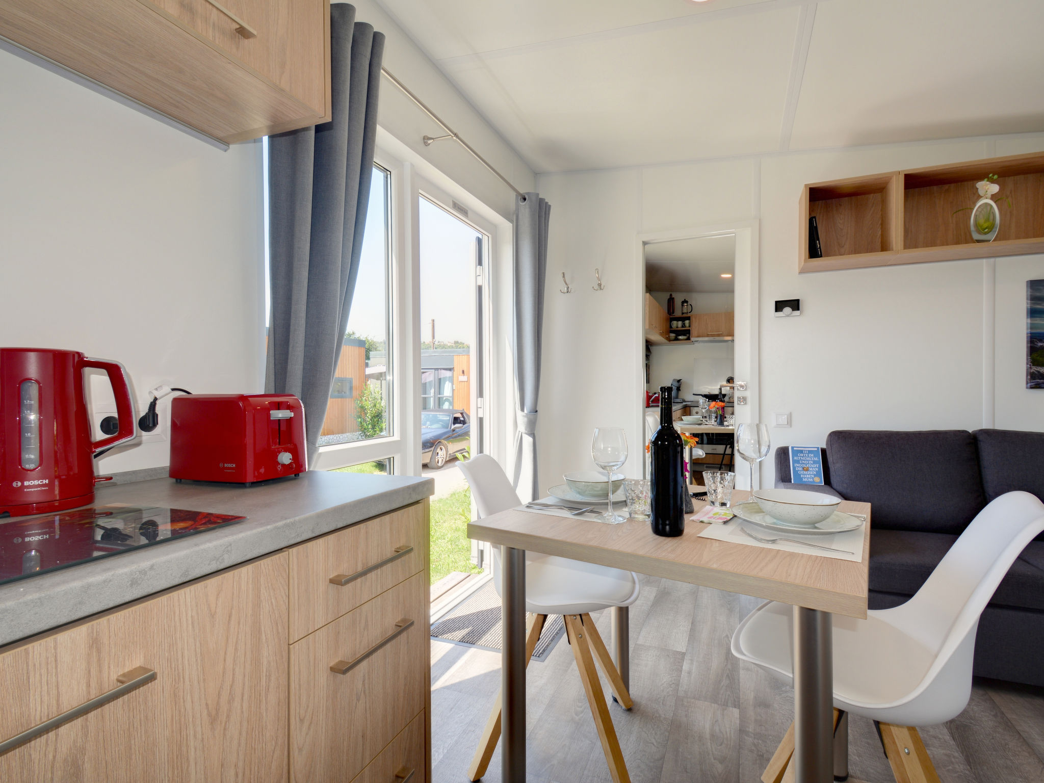 "Tiny Haus Andreas", 2-Zimmer-Mobilheim 25 m2. Objekt geeignet für 2 Erwachsene + 2 Kinder. Gemütlich eingerichtet: Wohn-/Schlafzimmer mit 1 Diwanbett (120 cm, Länge 170 cm), Sat-TV. 1 Zimmer mit 1 franz. Bett (140 cm, Länge 200 cm). Offene Küche (Backofen, Gasherd, 2 Flammen, Wasserkocher, elektrische Kaffeemaschine). Dusche/WC. E-Heizung. Kleine Terrasse. Terrassenmöbel. Parkplatz in 50 m. Bitte beachten: Nichtraucher-Haus. Maximal 1 Haustier/Hund erlaubt.