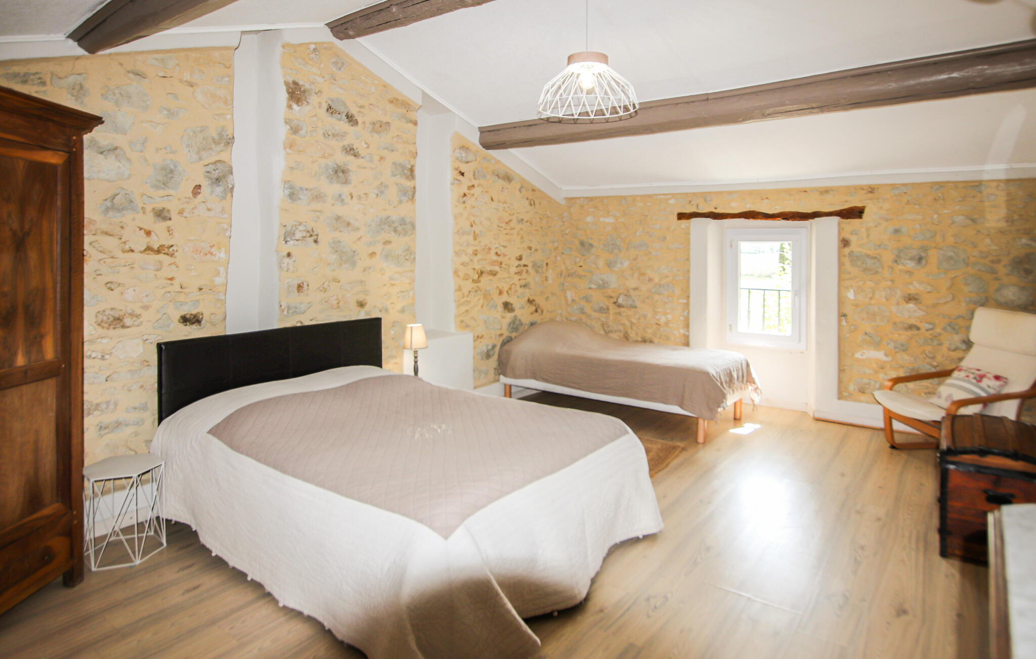 Schlafzimmer(1x Doppelbett(en)), Schlafzimmer(2x Einzelbett(en)), Schlafzimmer(1x Einzelbett(en)), Wohnraum, Esszimmer, Küche, Offener Schlafboden, Toilette(WC.Ohne Waschbecken), Badezimmer(WC. Warmes und kaltes Wasser, Dusche), Terrasse oder Ähnliches(Überdachte Terrasse)