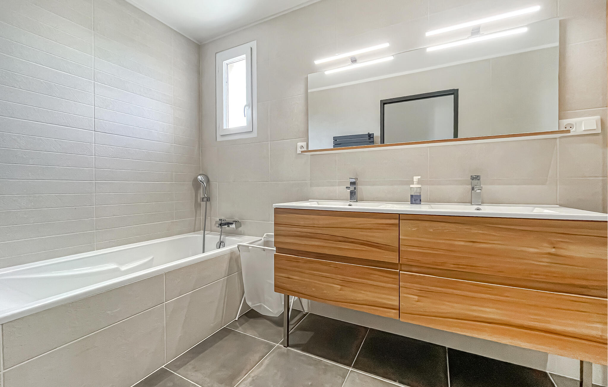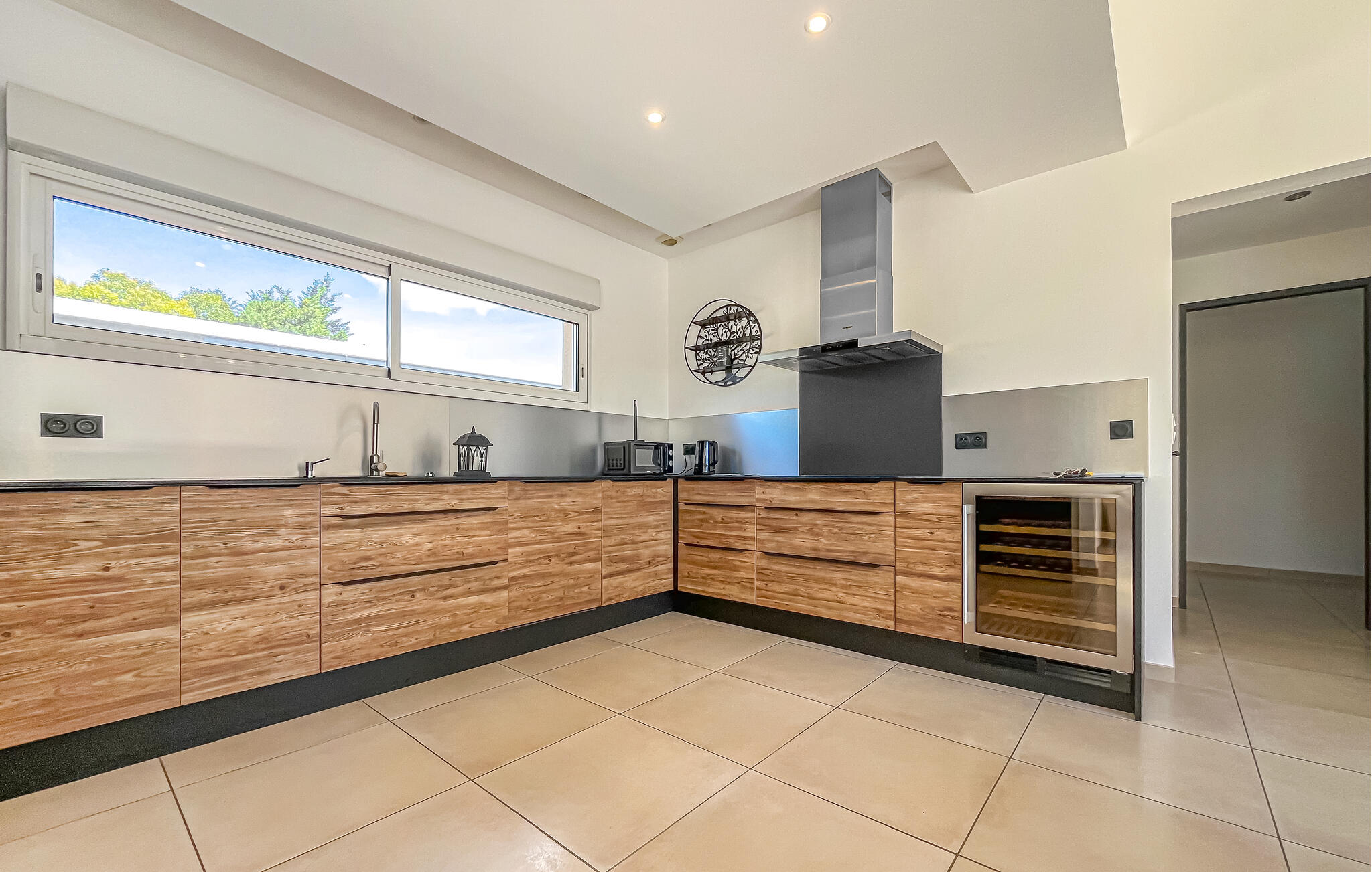 Dieses moderne Haus ist wie geschaffen für eine erholsame Auszeit vom Alltag. Durch die großen Fensterfronten fällt viel Licht, das den Wohnbereich freundlich und offen wirken lässt. Lehnen Sie sich hier entspannt auf dem Sofa zurück und genießen Sie den Blick ins Grüne. In der modern ausgestatteten Küche können Sie gemeinsam kochen und anschließend am Esstisch gemütliche Mahlzeiten genießen. Alles ist darauf ausgerichtet, Ihnen einen komfortablen und zugleich stilvollen Aufenthalt zu bieten.