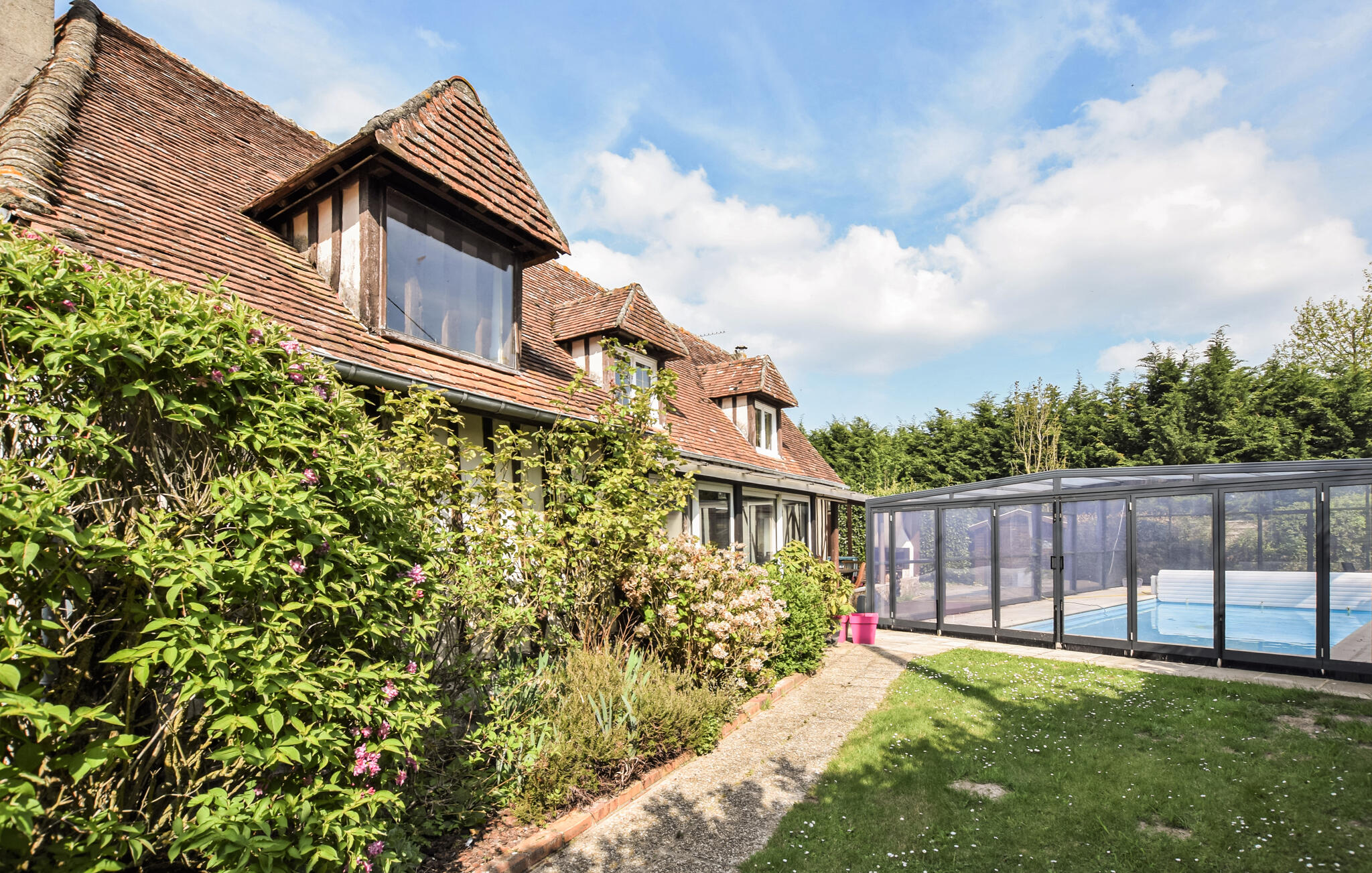 Nutzen Sie den Pool zu jeder Jahreszeit für unvergessliche Badeerlebnisse. Gönnen Sie sich wohlige Momente im Whirlpool und lassen Sie die Kinder durch den großen, idyllischen Garten toben, während Sie sich ein Glas Wein im Schatten genehmigen oder die Terrasse für einen stimmungsvollen Grillabend vorbereiten.