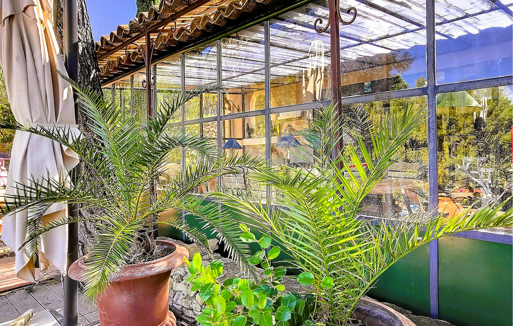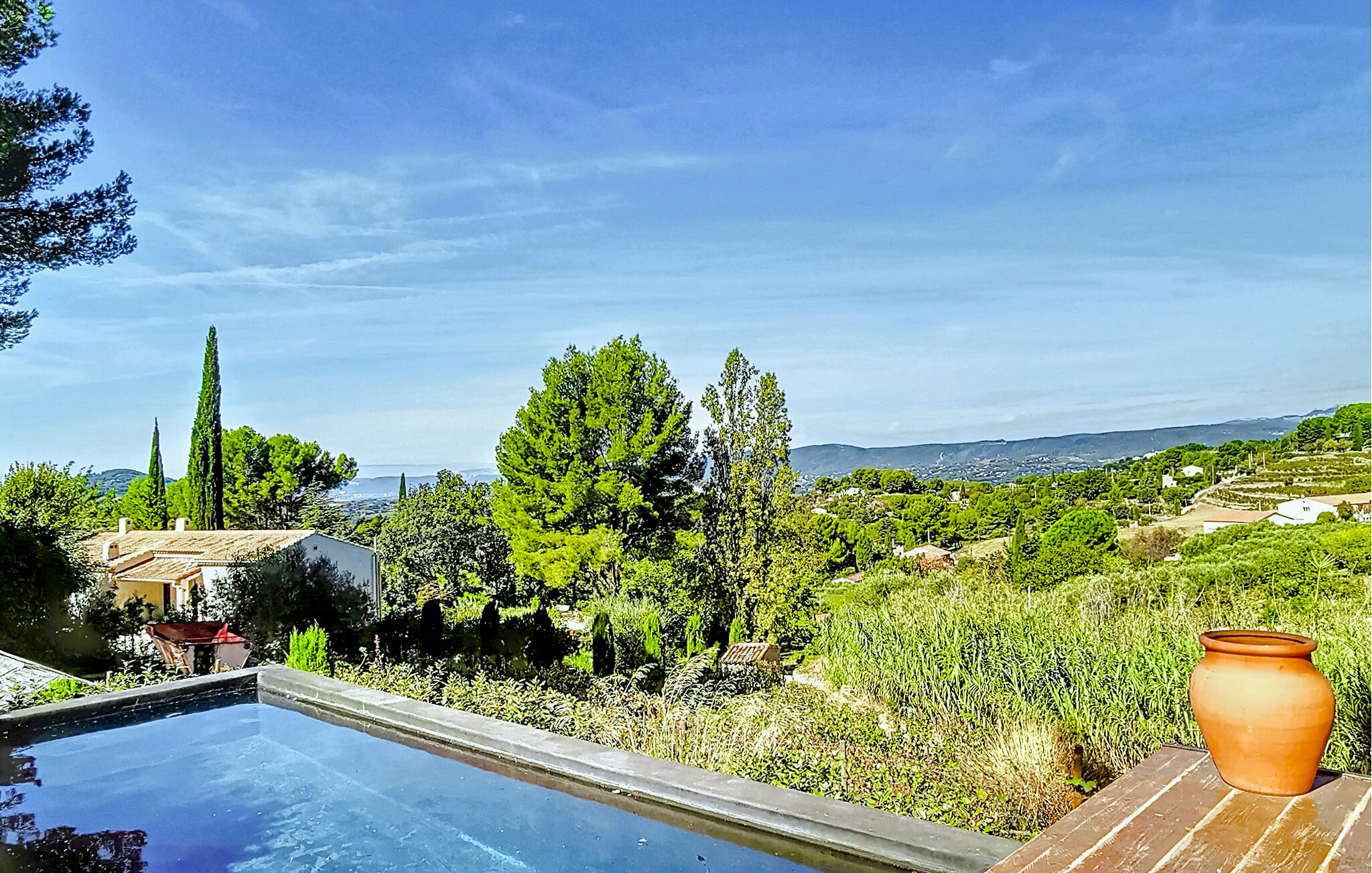Im Außenbereich laden weitläufige, sonnige Terrassen zum Speisen mit Landschaftsblick ein. Erfrischen Sie sich im Pool, entspannen Sie in der Sauna und genießen Sie ein Glas Roséwein aus der Region in der schattigen Veranda. Erkunden Sie das große, parkähnliche Grundstück und atmen Sie den Duft der provenzalischen Flora ein.
