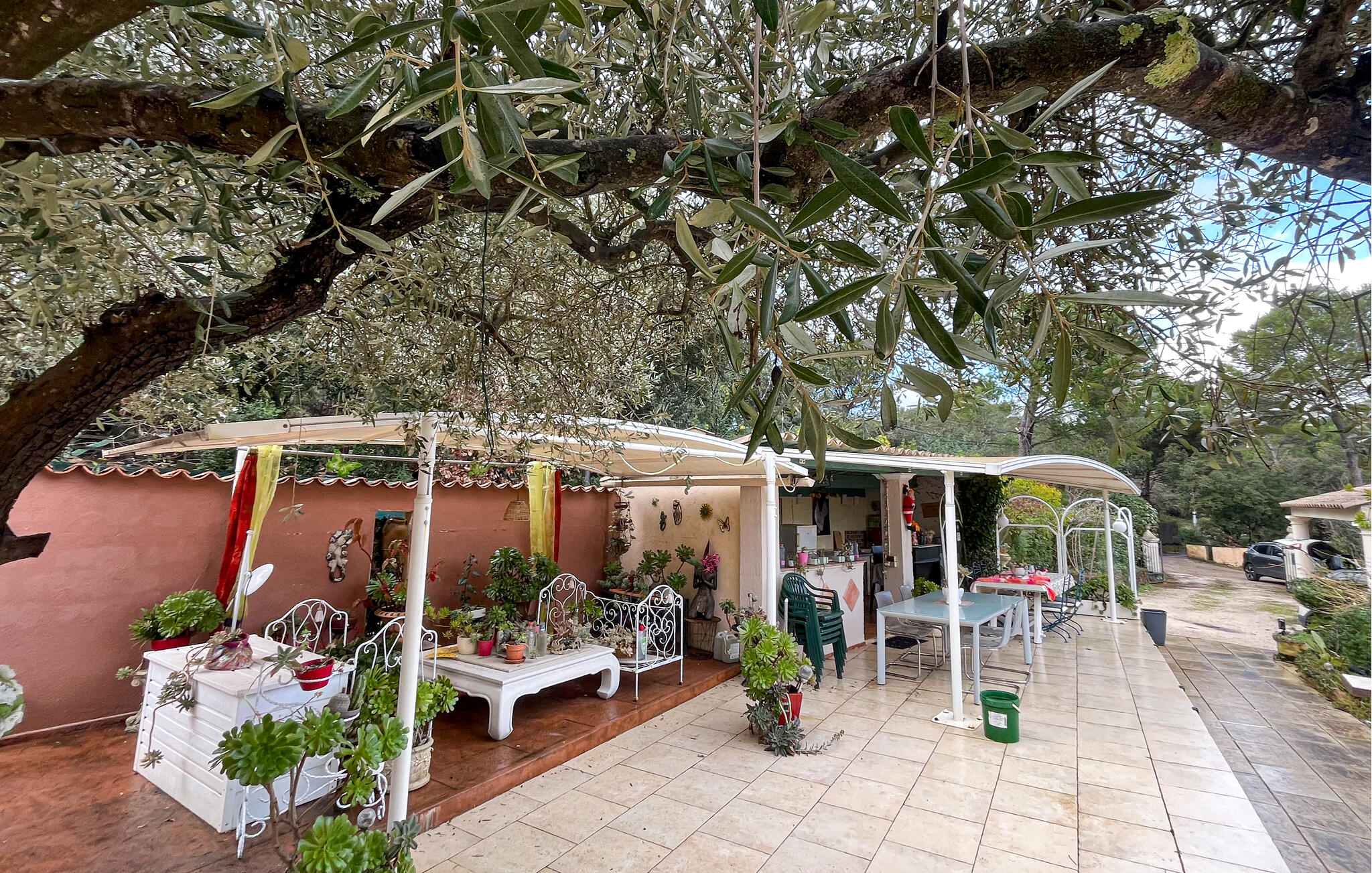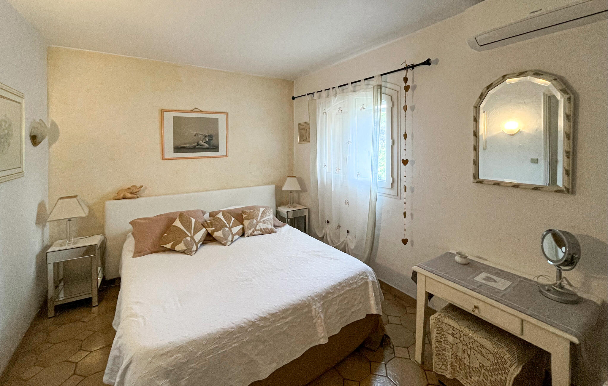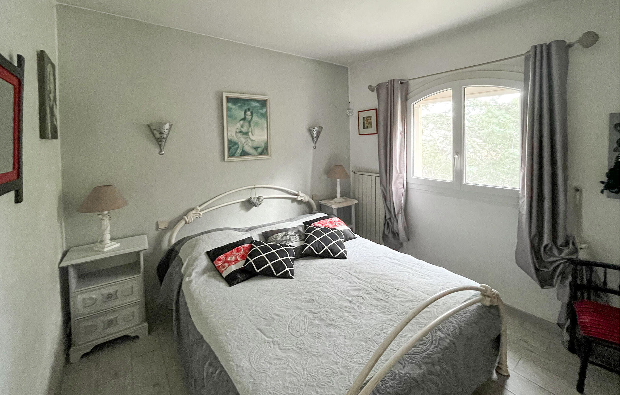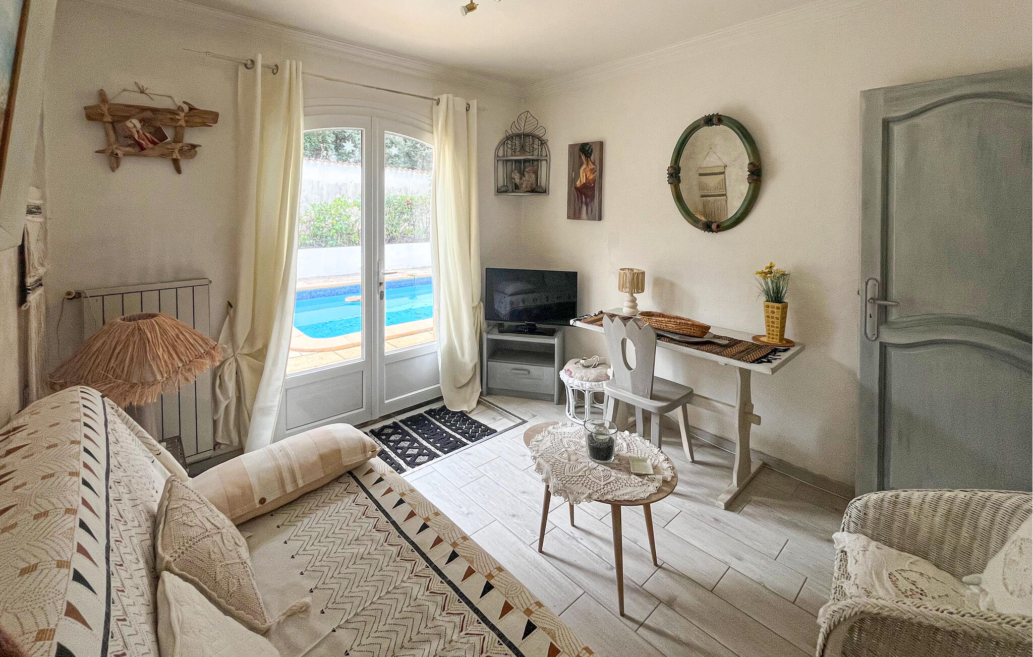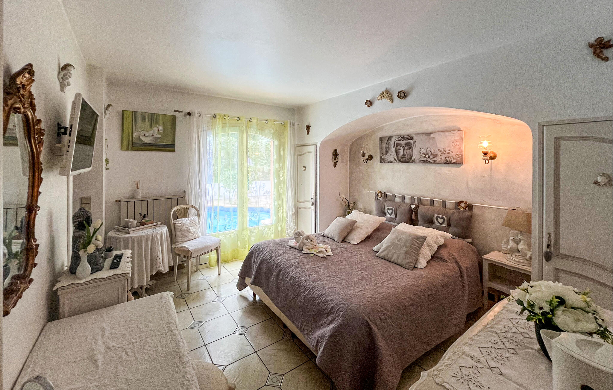 Draußen erwartet Sie ein glitzernder Pool, an dem Sie stundenlang die friedliche Atmosphäre auf sich wirken lassen können. Nutzen Sie die Terrasse für ein ausgedehntes Frühstück am Morgen und plaudern Sie bei einem Glas Wein bis in die stillen Sommernächte hinein.
