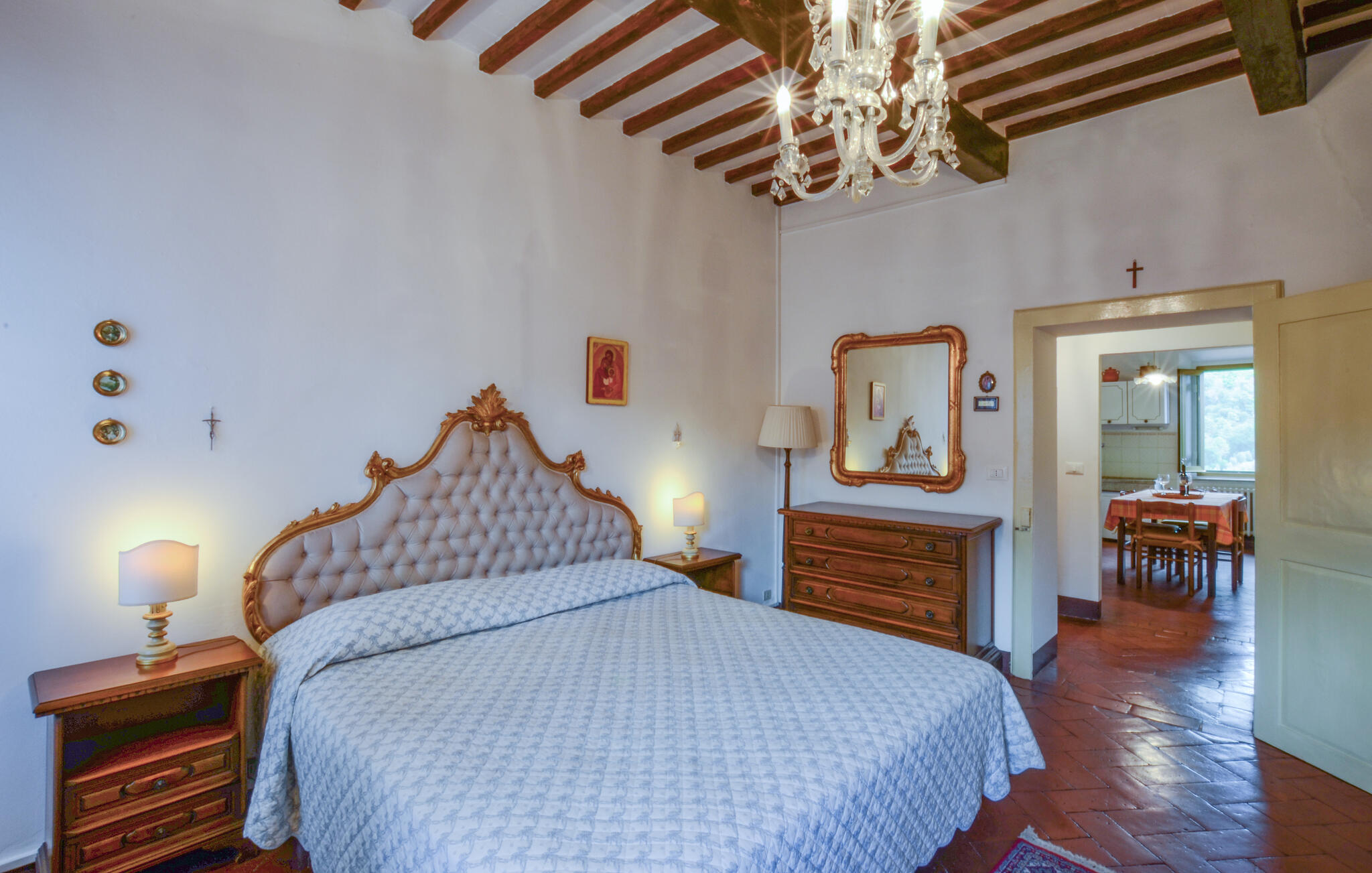 Diese Wohnung ist behaglich eingerichtet, mit dunklen Holzschränken, Teppichen und traditionellen Möbelstücken, die eine warme Atmosphäre schaffen. Helle Wände, große Fenster und dezente Details wie Bücher und Bilder verleihen dem Raum zugleich eine angenehme Leichtigkeit. Lehnen Sie sich entspannt mit einem Espresso auf dem bequemen Sofa zurück, genießen Sie den Blick in die schöne Landschaft oder probieren Sie in der modernen Küche neue Rezepte aus.