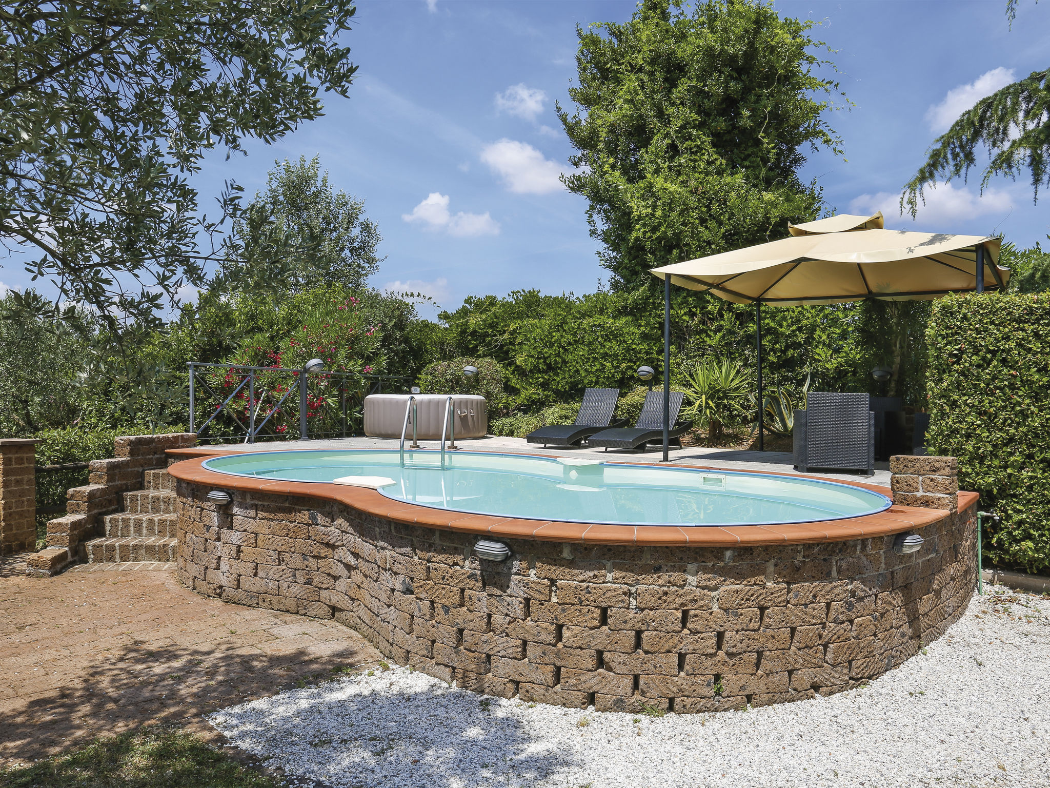 Der Pool ist nicht groß, reicht aber für eine Abkühlung und liegt nicht einsehbar auf dem Grundstück.