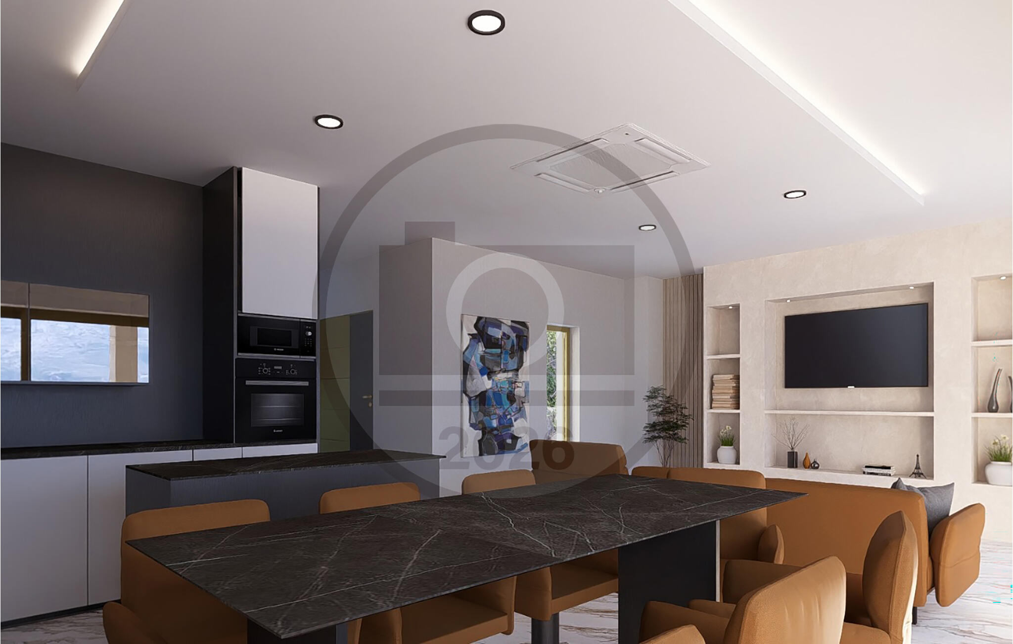 Warm-/Kaltwasser in der KücheElektroherd mit BackofenKühlschrankDunstabzugGefrierfachKaffeemaschineMikrowelleWaschmaschineTrocknerGeschirrspülerStaubsauger5 TVSatellitenschüsselWC. Warmes und kaltes Wasser