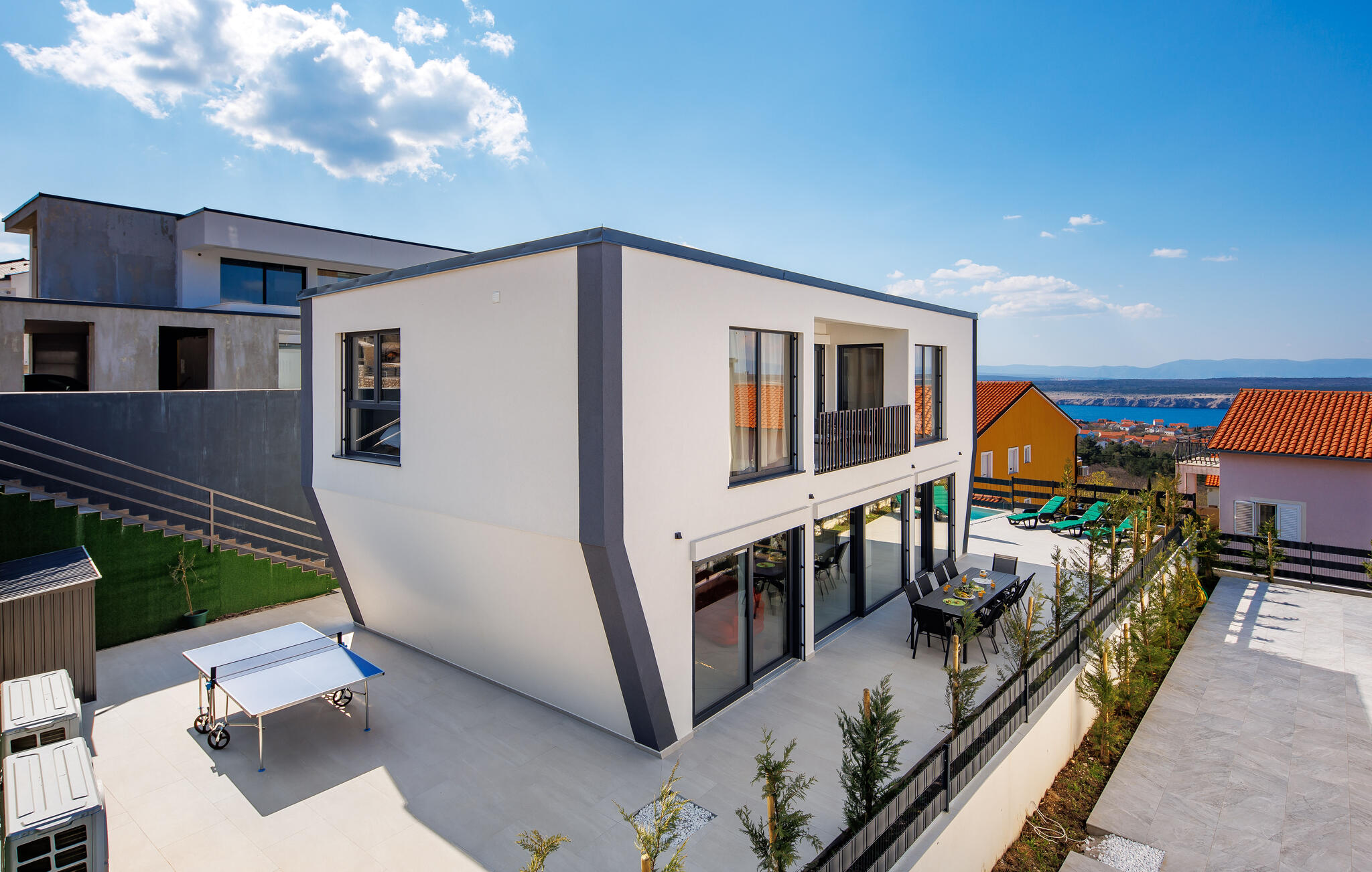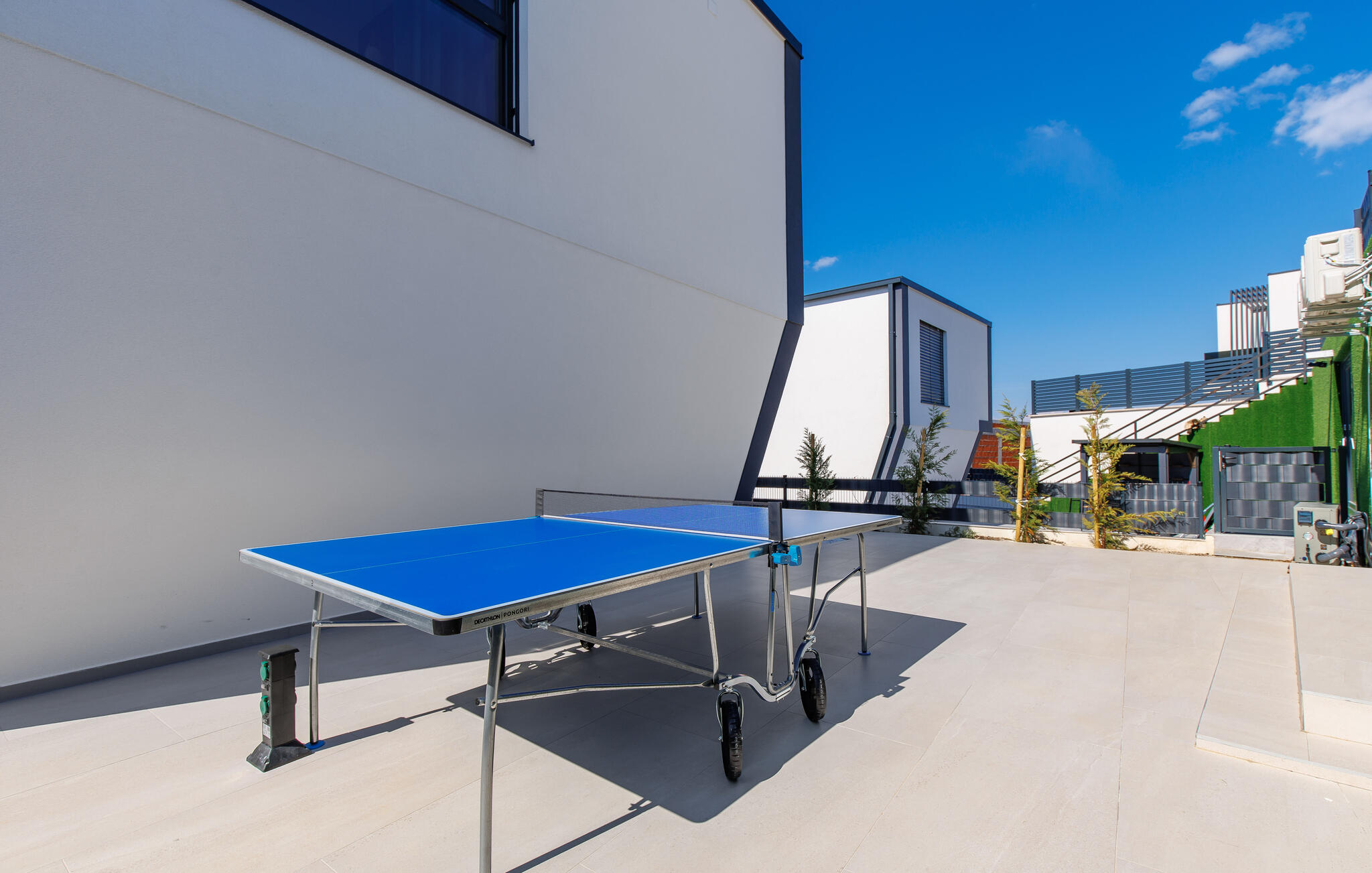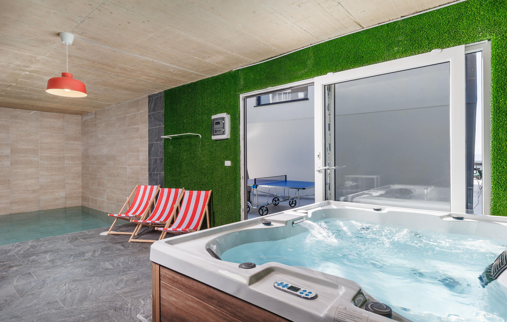 Im Außenbereich erwartet Sie ein weiterer Pool, an dem Sie lange Sonnenstunden genießen können. Fordern Sie sich zwischendurch an der Tischtennisplatte heraus, gönnen Sie sich bei Sonnenuntergang wohlige Momente im Whirlpool und zelebrieren Sie die gemeinsame Zeit mit stimmungsvollen Grillabenden.