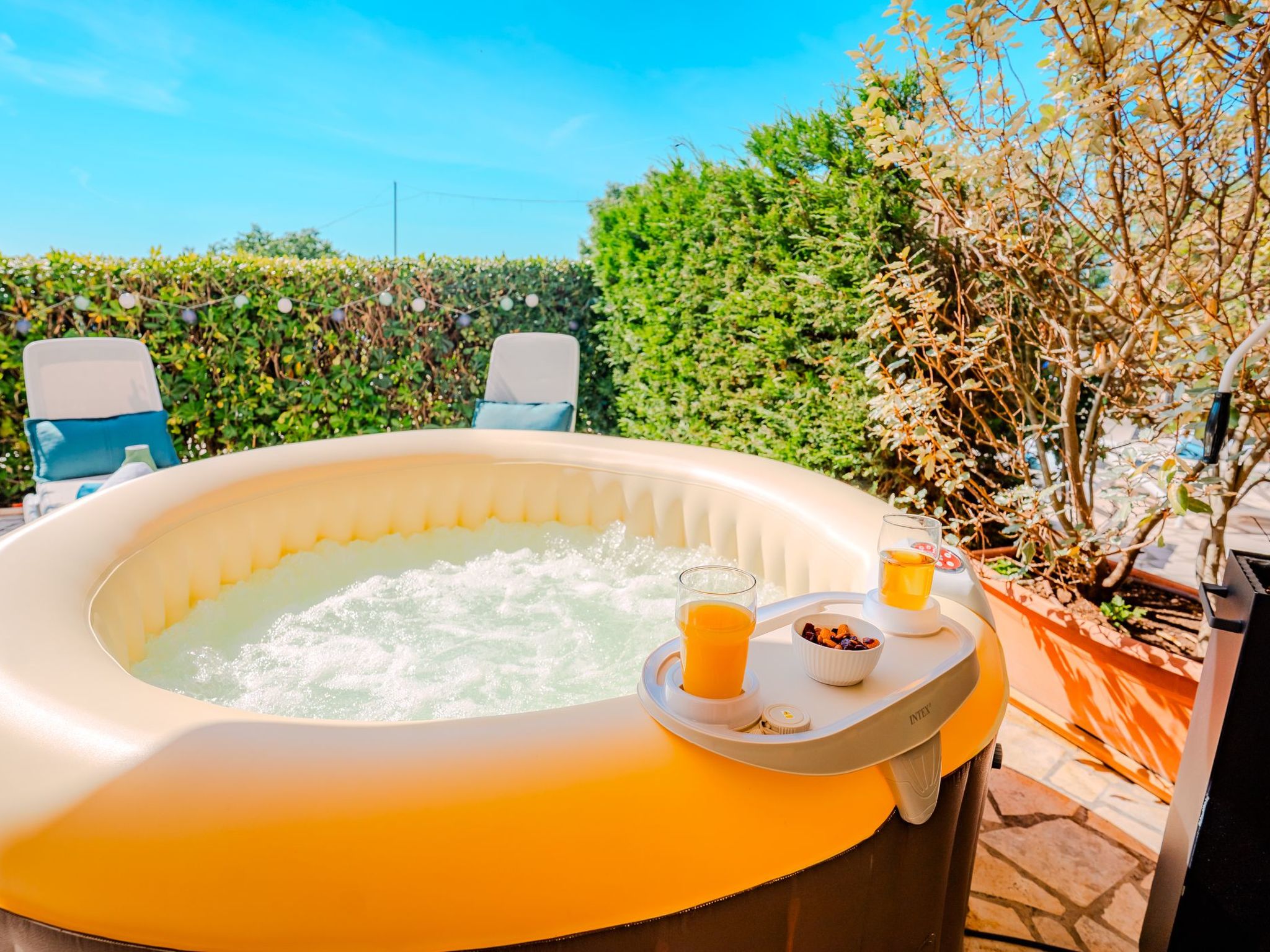 Eines der Highlights dieser Wohnung ist der private, beheizte Jacuzzi auf der geräumigen, möblierten Terrasse. Genießen Sie zu jeder Jahreszeit entspannende Momente im warmen, sprudelnden Wasser - ob nach einem Strandtag oder an kühleren Abenden im Frühling und Herbst.