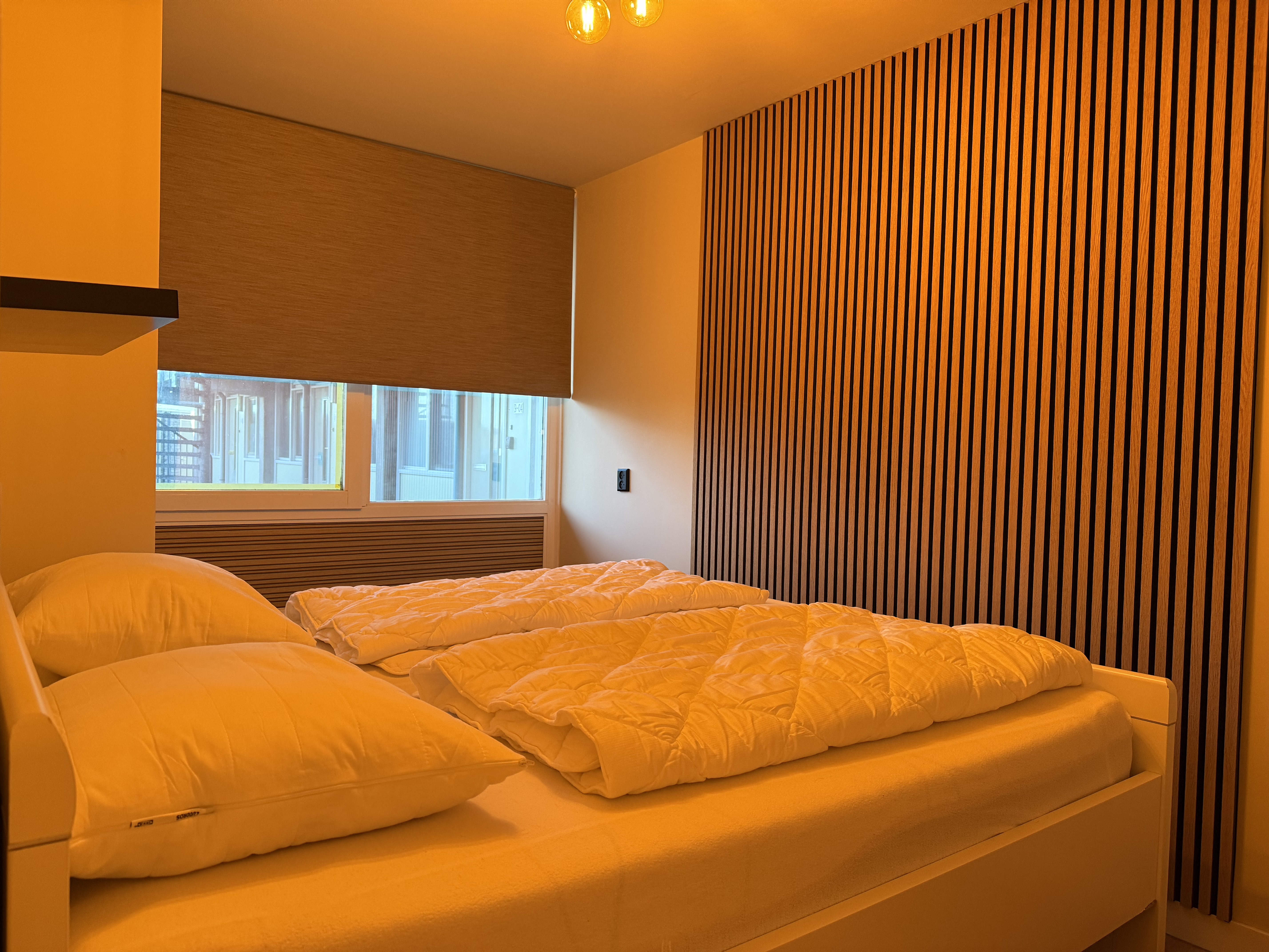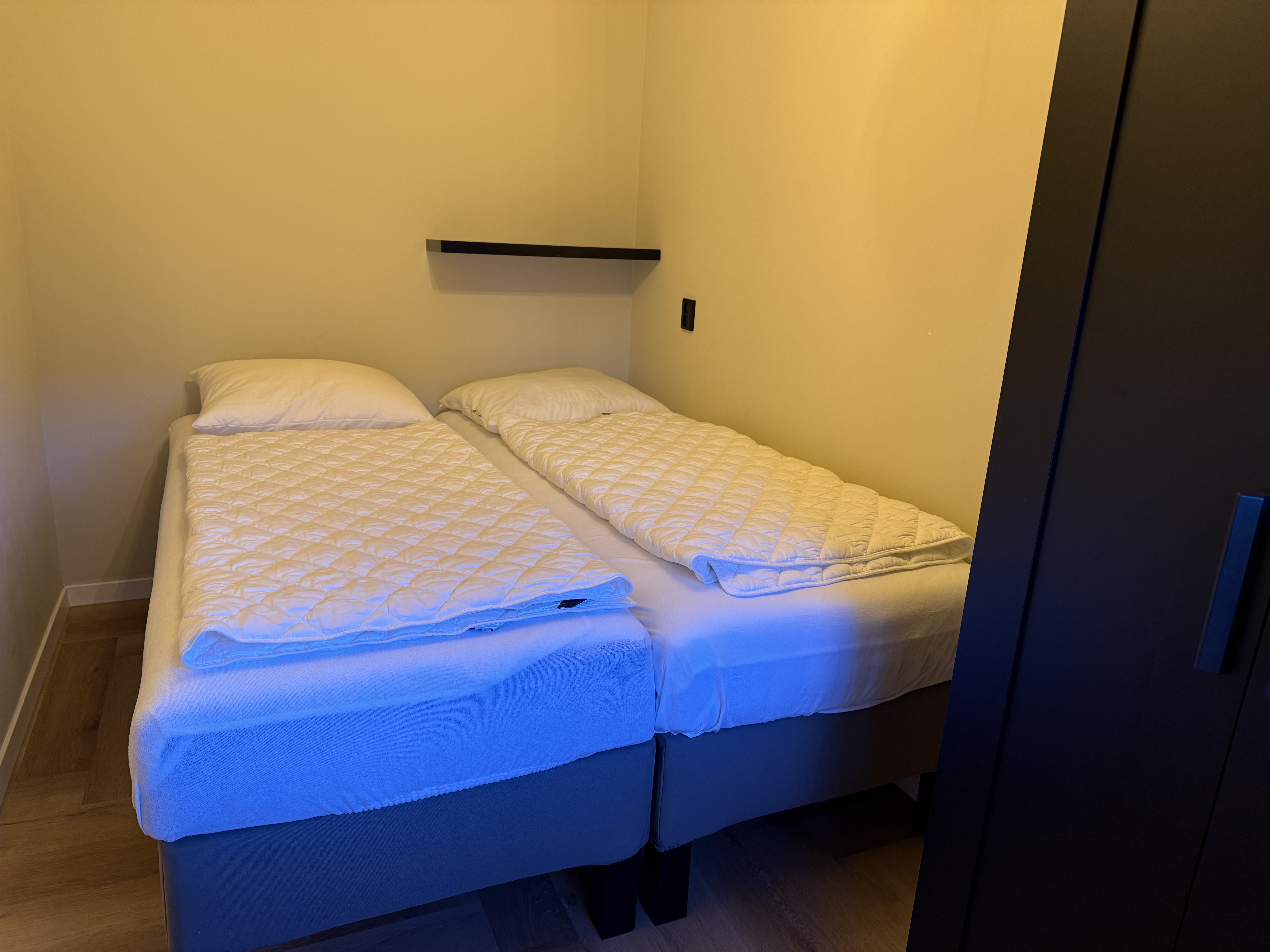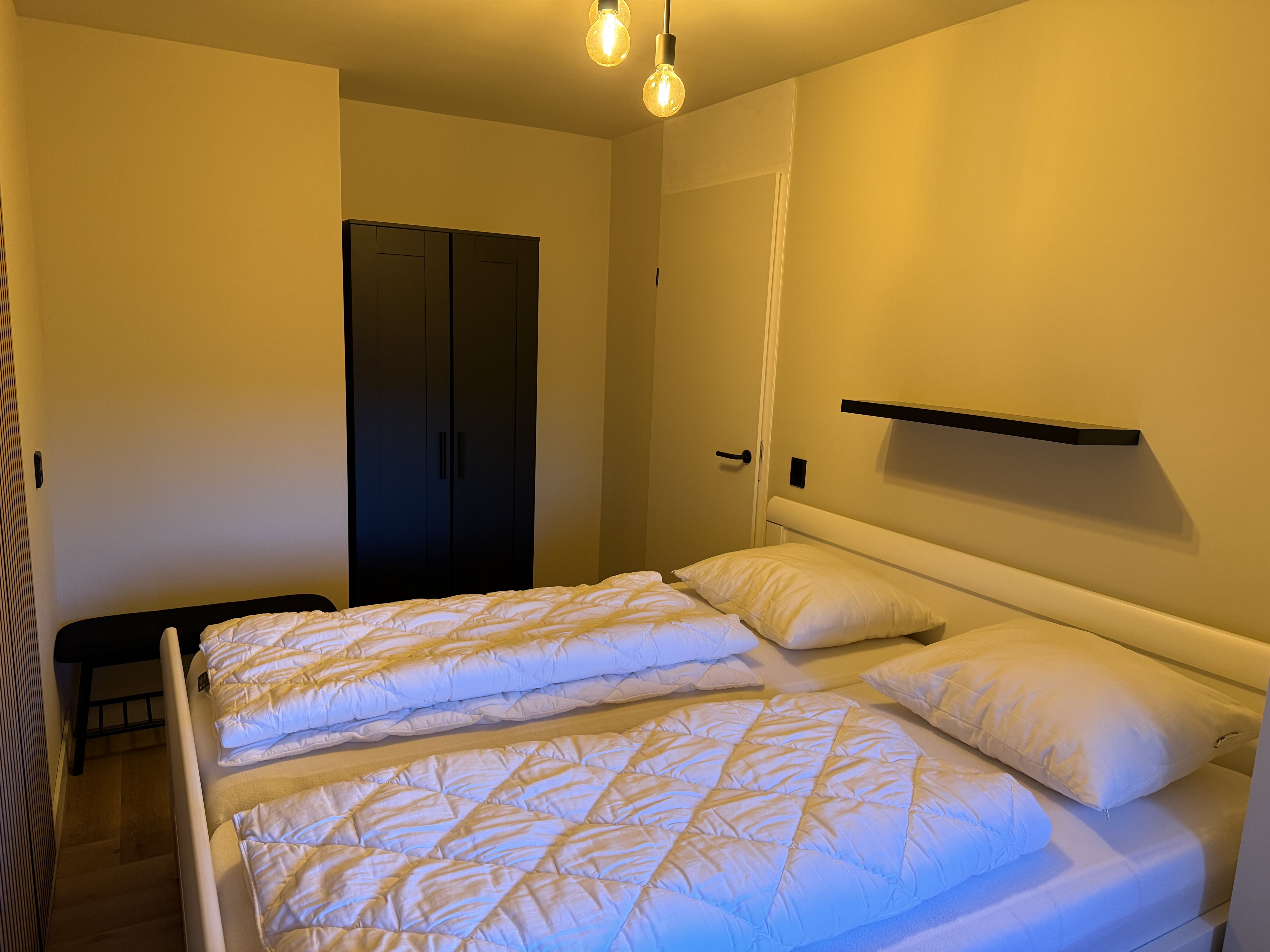 Die Schlafräume bestehen aus zwei Schlafzimmern – eines mit einem Doppelbett, das andere mit zwei Einzelbetten. Beide Zimmer verfügen über Kleiderschränke und bieten ausreichend Stauraum. Für Familien stehen zusätzlich ein Babybett und ein Kinderstuhl zur Verfügung.