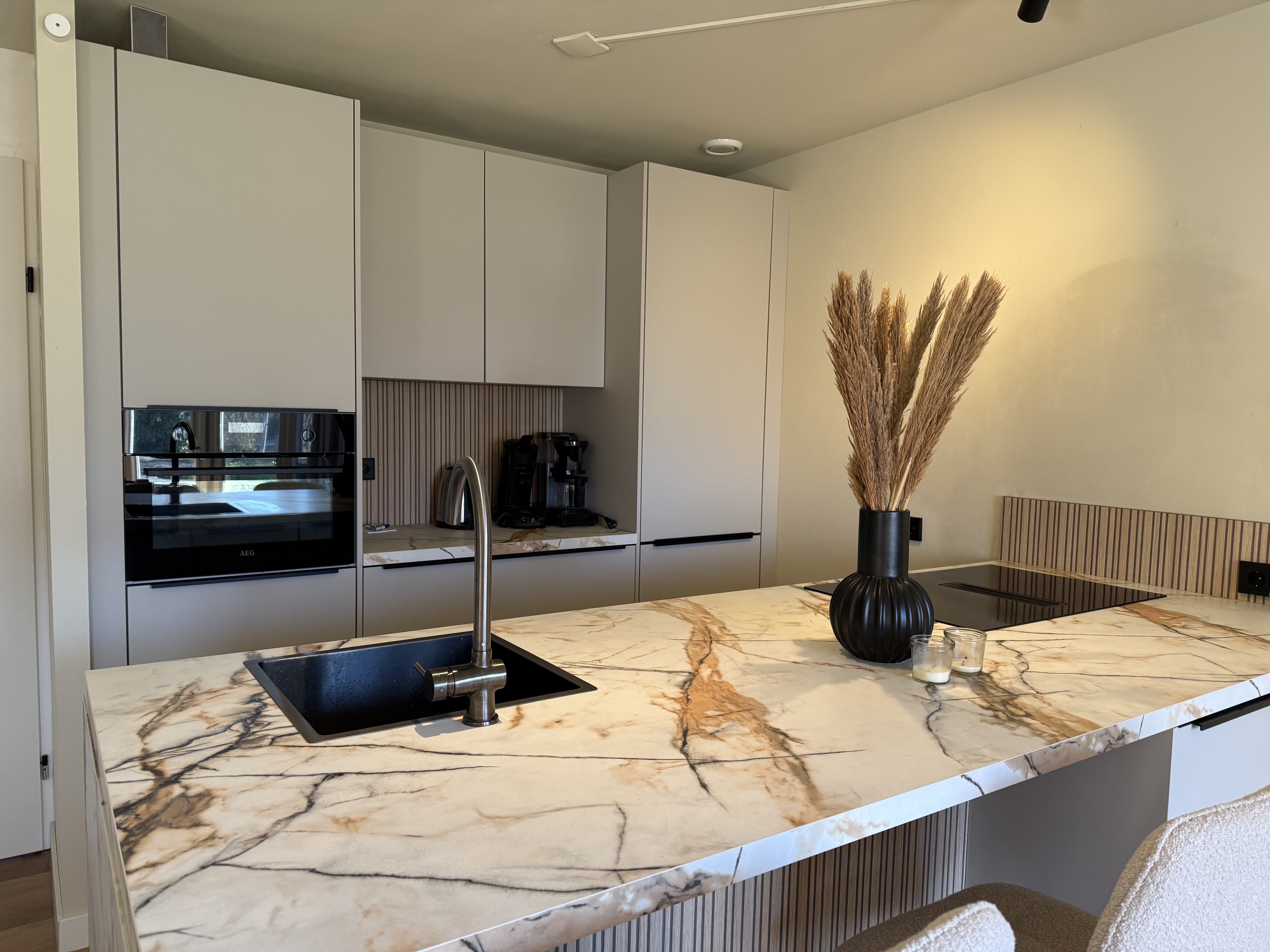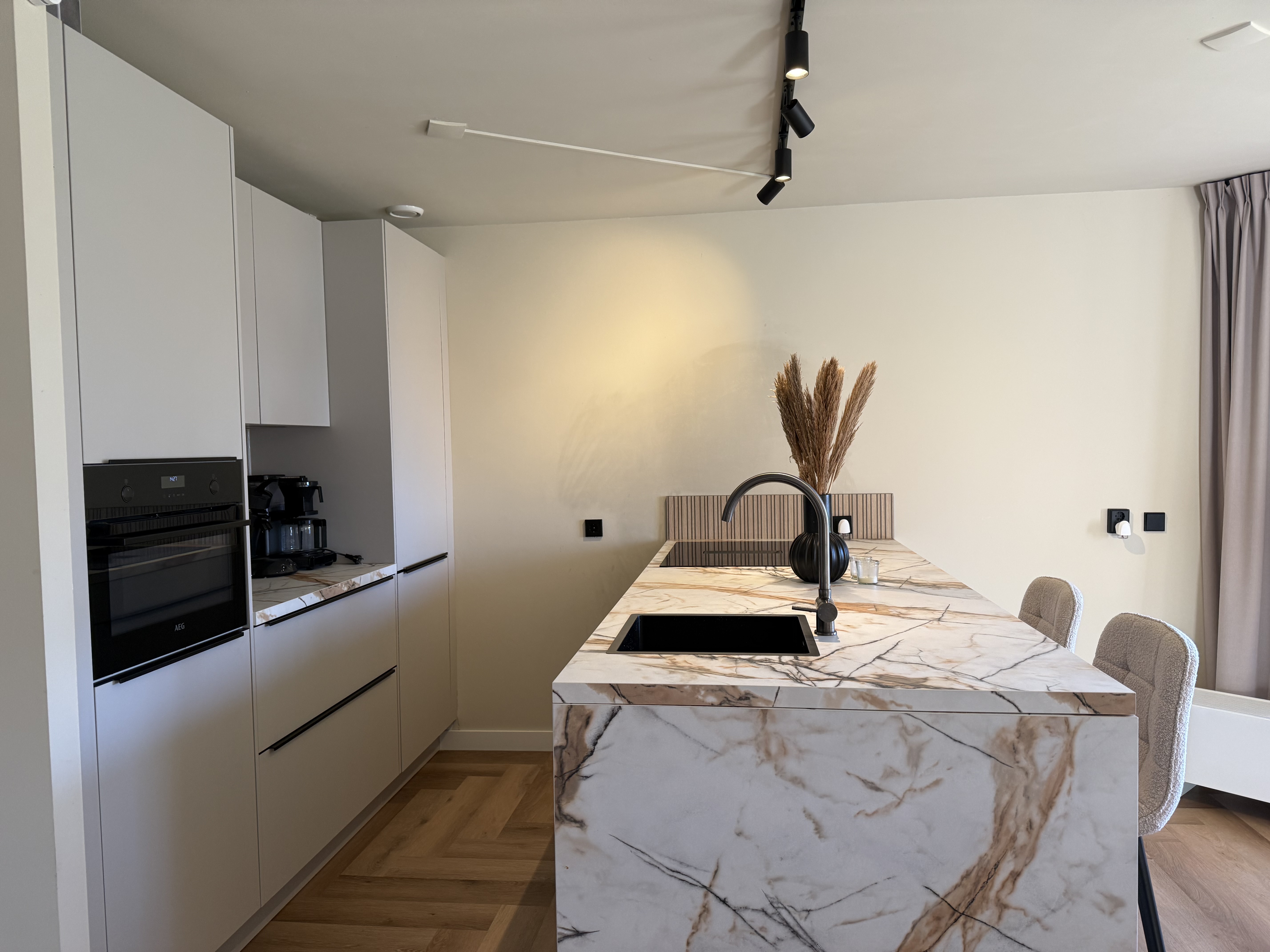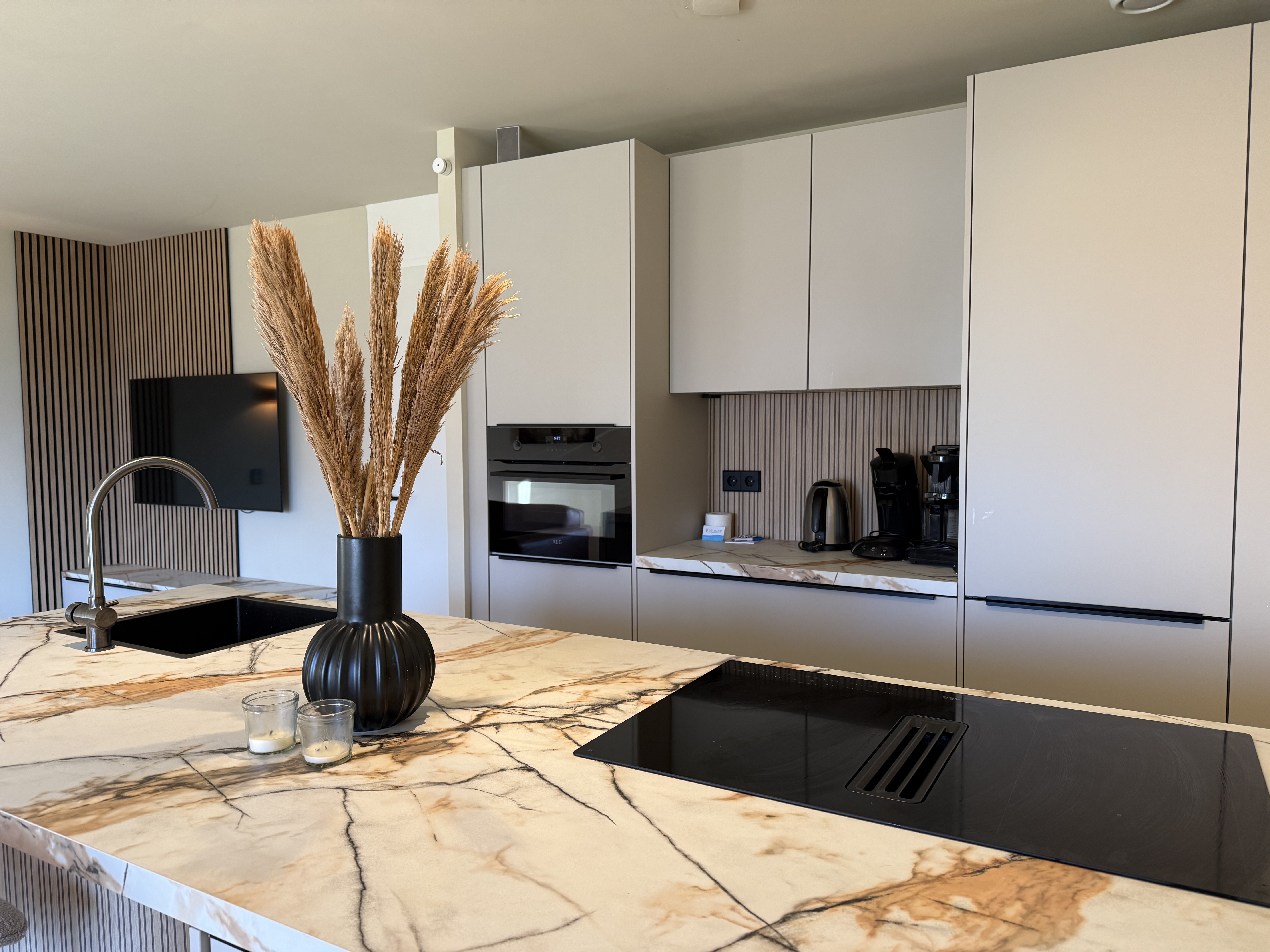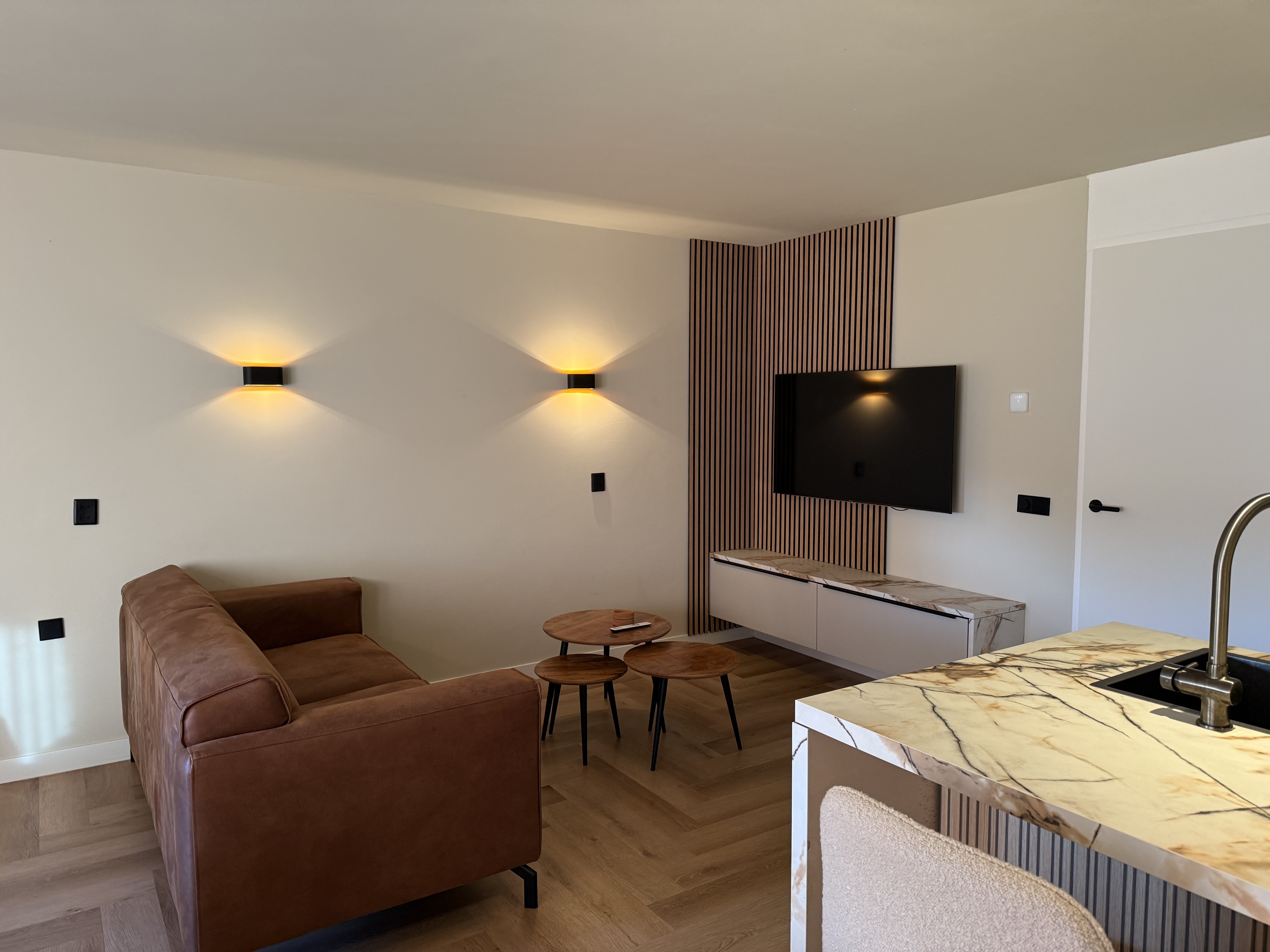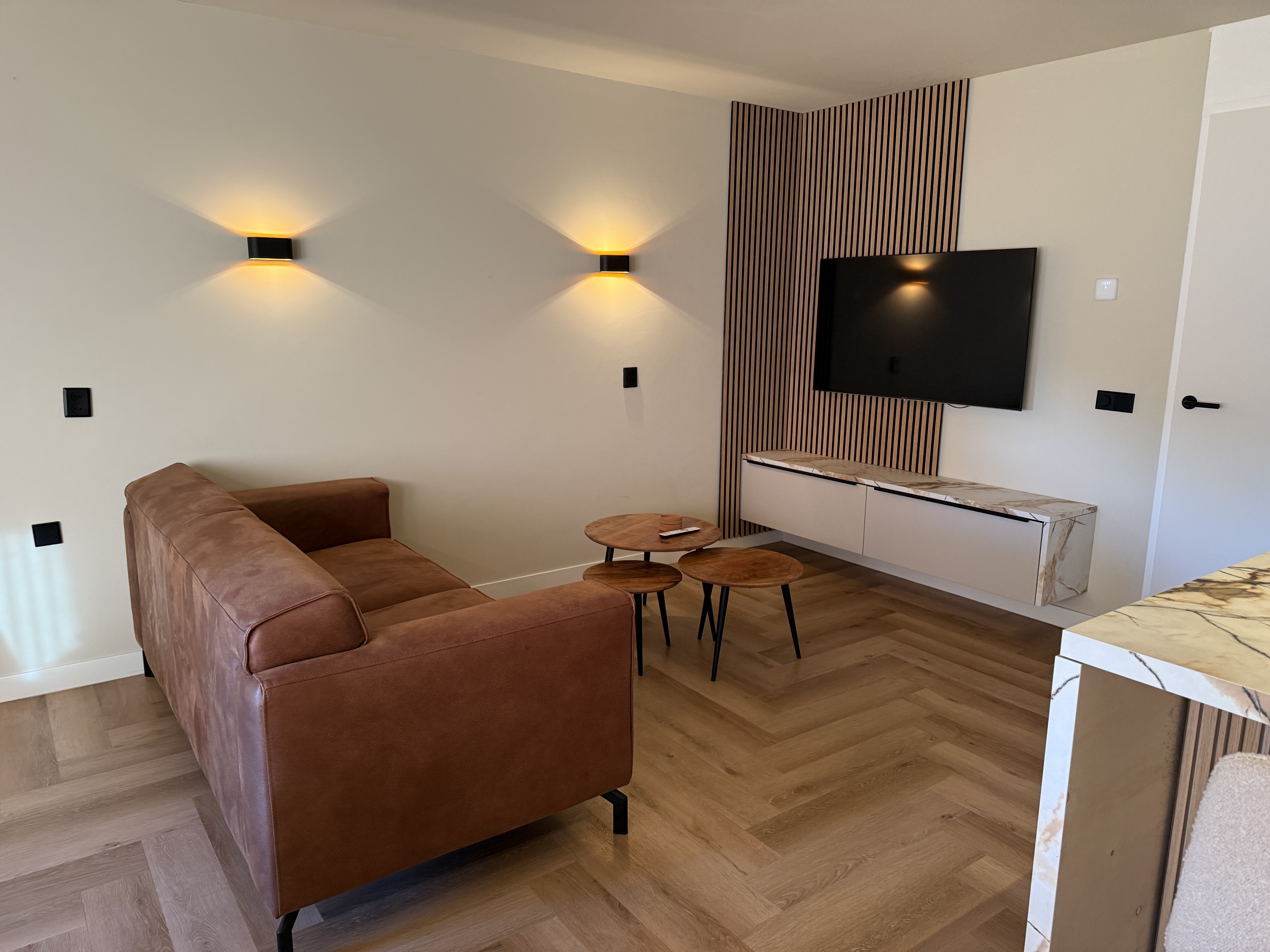 Die Wohnung verfügt über einen hellen Wohn- und Essbereich mit einer gemütlichen Sitzecke, Smart-TV und WLAN. Die offene Küche ist modern ausgestattet und bietet alle Annehmlichkeiten für den täglichen Bedarf. Zur Küchenausstattung gehören ein Geschirrspüler, Induktionskochfeld (4 Platten), Kühlschrank mit Gefrierfach, Kombimikrowelle, Toaster, Kaffeemaschine sowie ein elektrischer Wasserkocher.