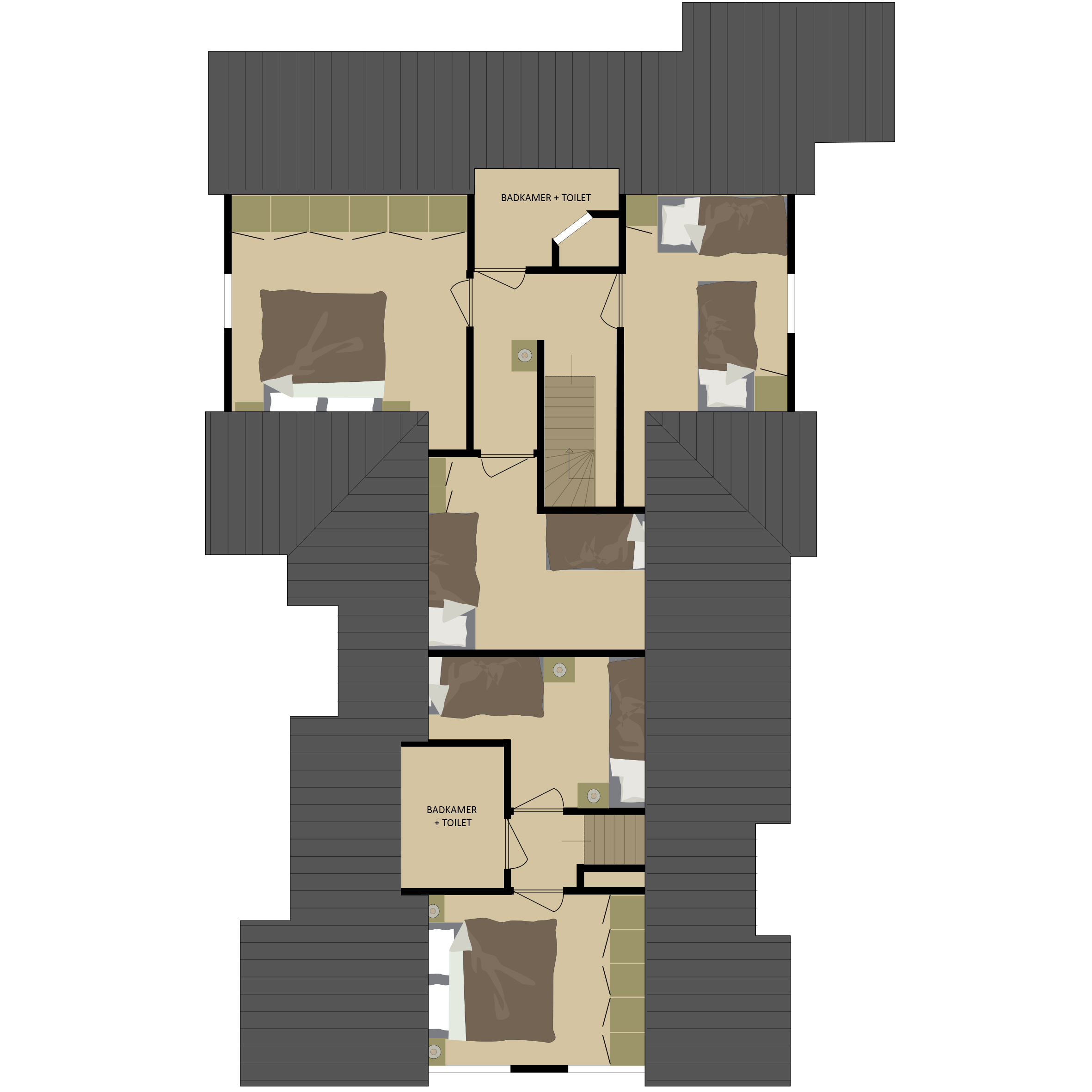 Im Obergeschoss finden Sie fünf geräumige Schlafzimmer, jeweils mit zwei Einzelbetten ausgestattet. Darüber hinaus stehen zwei Badezimmer zur Verfügung, die mit Dusche oder Whirlpool, Waschbecken und WC ausgestattet sind. Dank dieser Aufteilung genießt jeder Gast ausreichend Privatsphäre und Komfort, auch bei einer größeren Gruppe.