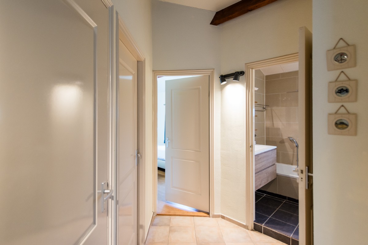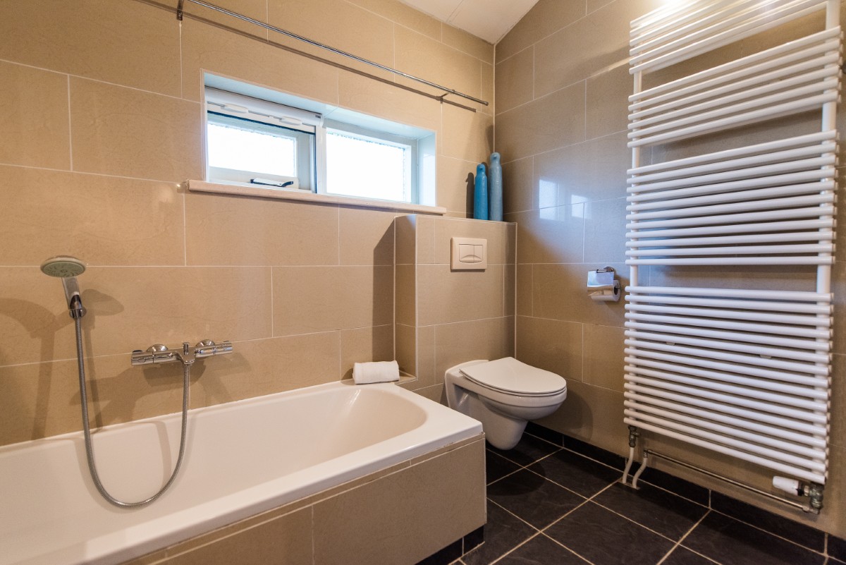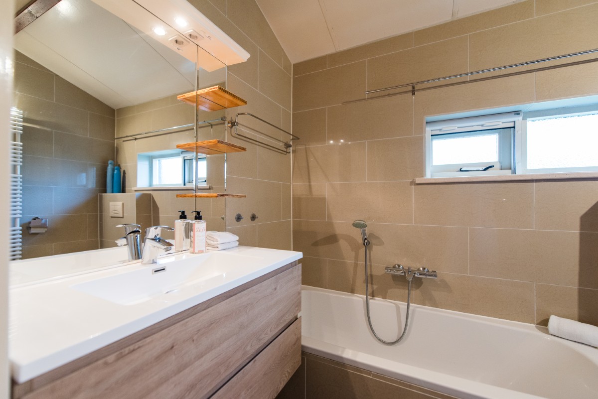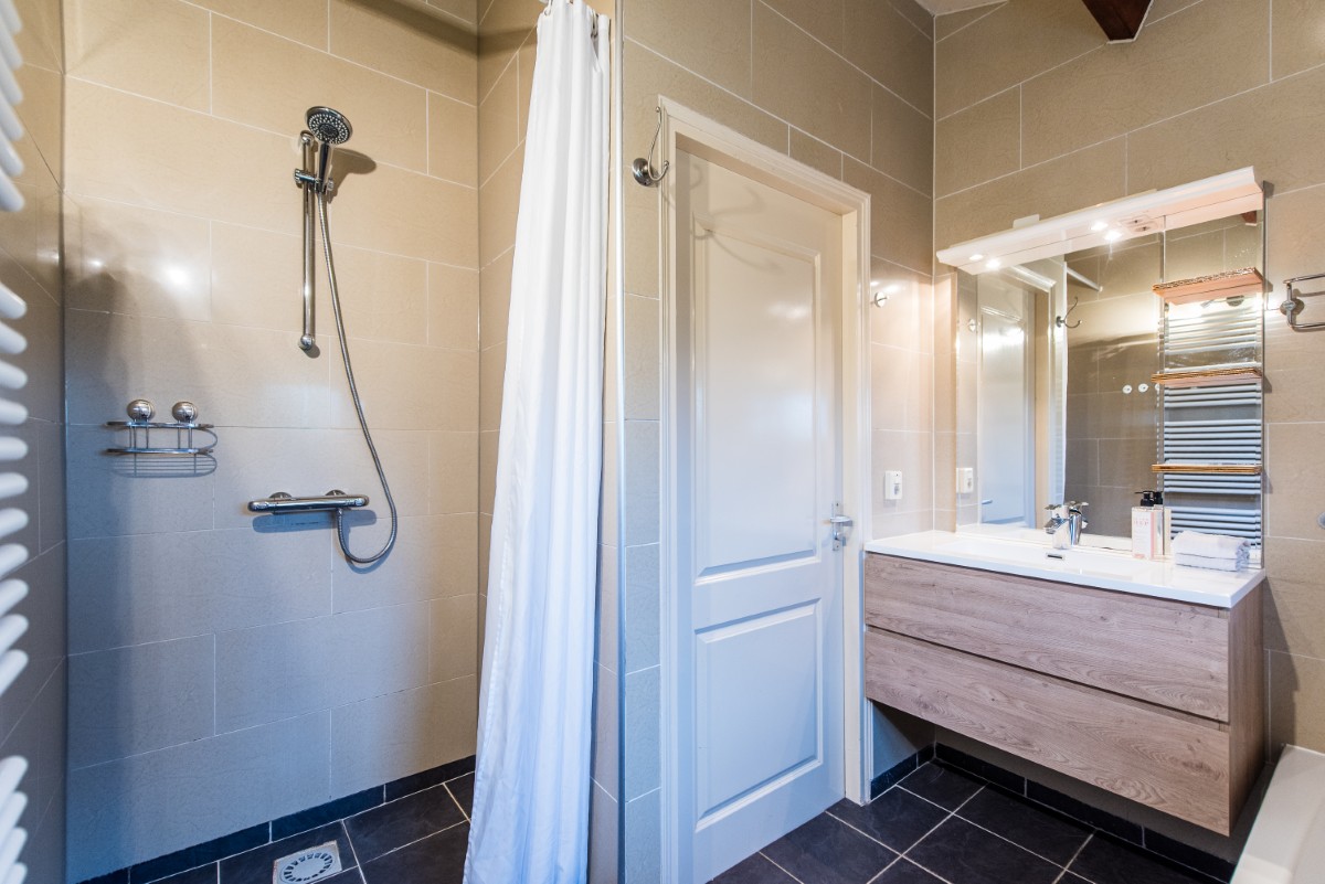 Das Badezimmer ist mit einer großen Dusche, einer Badewanne, einem Waschbecken und einem Fenster ausgestattet. Zusätzlich gibt es ein separates Gäste-WC. Ein Föhn steht im Badezimmer sowie in zwei der Schlafzimmer zur Verfügung.