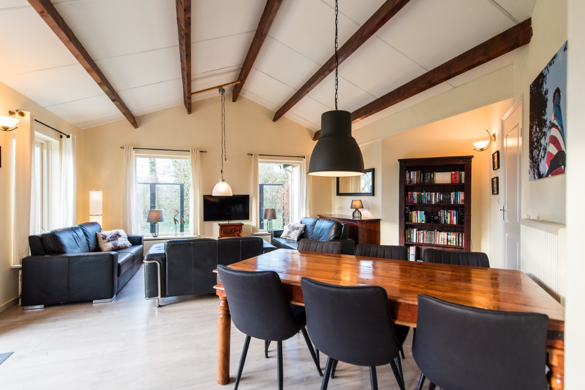 Alle Räume befinden sich im Erdgeschoss. Die besondere Bauweise, zwei ineinander übergehende Gebäudeteile, verleiht dem Haus eine offene, angenehme Atmosphäre. Die sichtbaren Balkendecken sorgen für einen heimelige Atmosphäre. Die Heizung lässt sich zentral über das Wohnzimmer regulieren, sodass der Bungalow auch in der kälteren Jahreszeit angenehm warm bleibt.