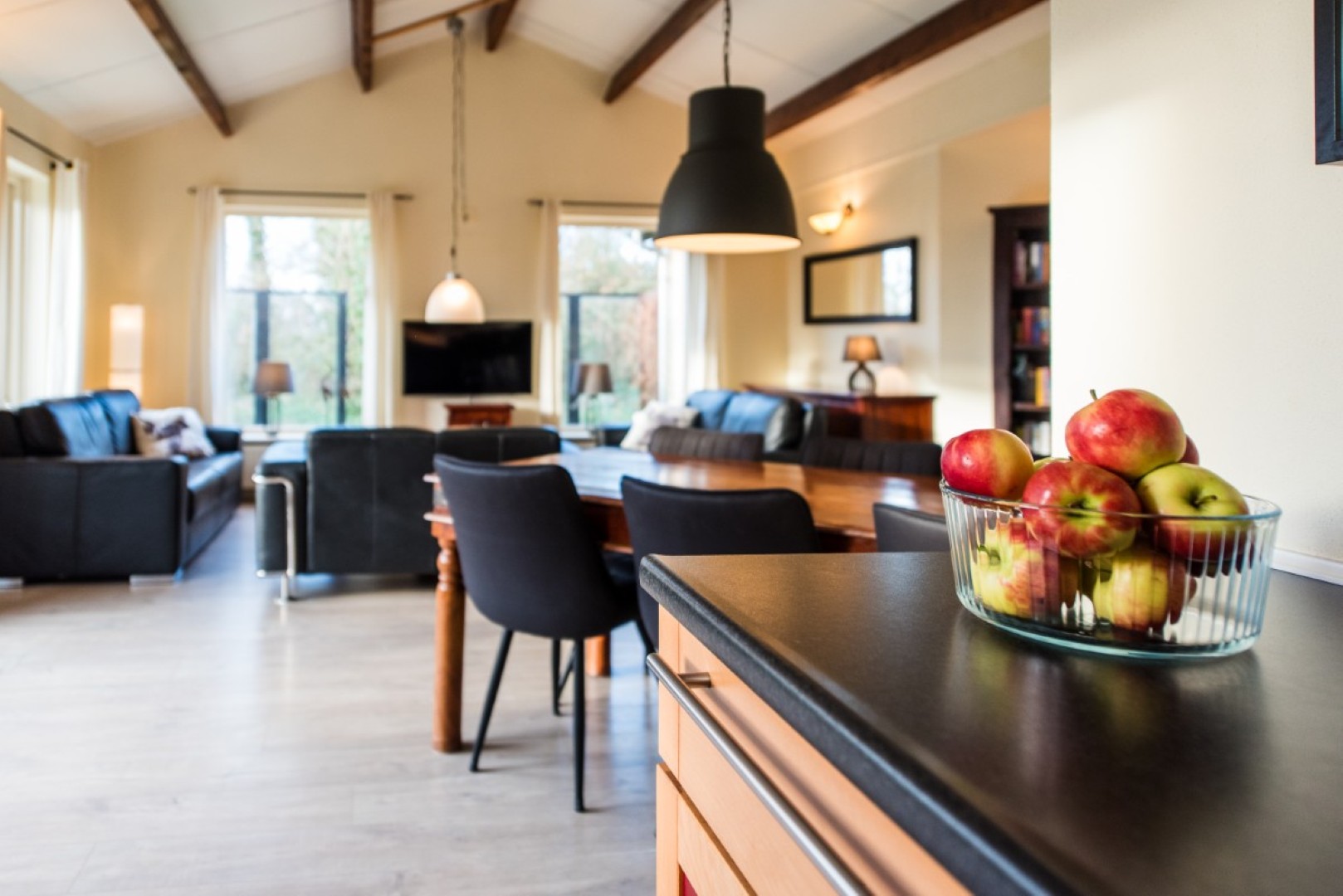 Das Haus verfügt über drei Schlafzimmer, zwei davon mit Boxspringbetten, eines mit einem Doppelbett und Tempur-Matratzen. Alle Schlafzimmer bieten ausreichend Platz, um sich auch einmal zurückzuziehen. Zwei der Zimmer sind mit einem eigenen Fernseher ausgestattet.