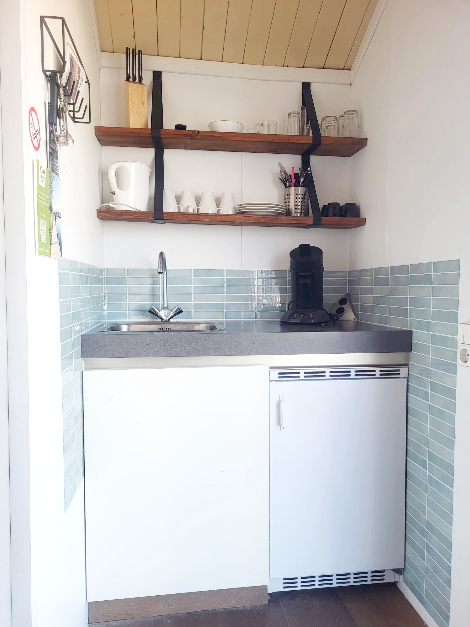 - Eine kleine offene Küche mit Kühlschrank und Senseo-Kaffeemaschine