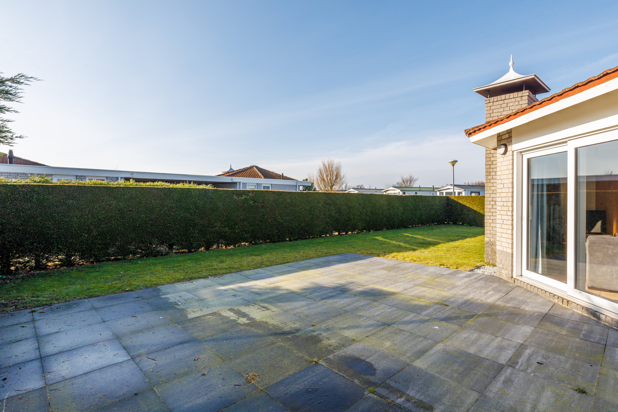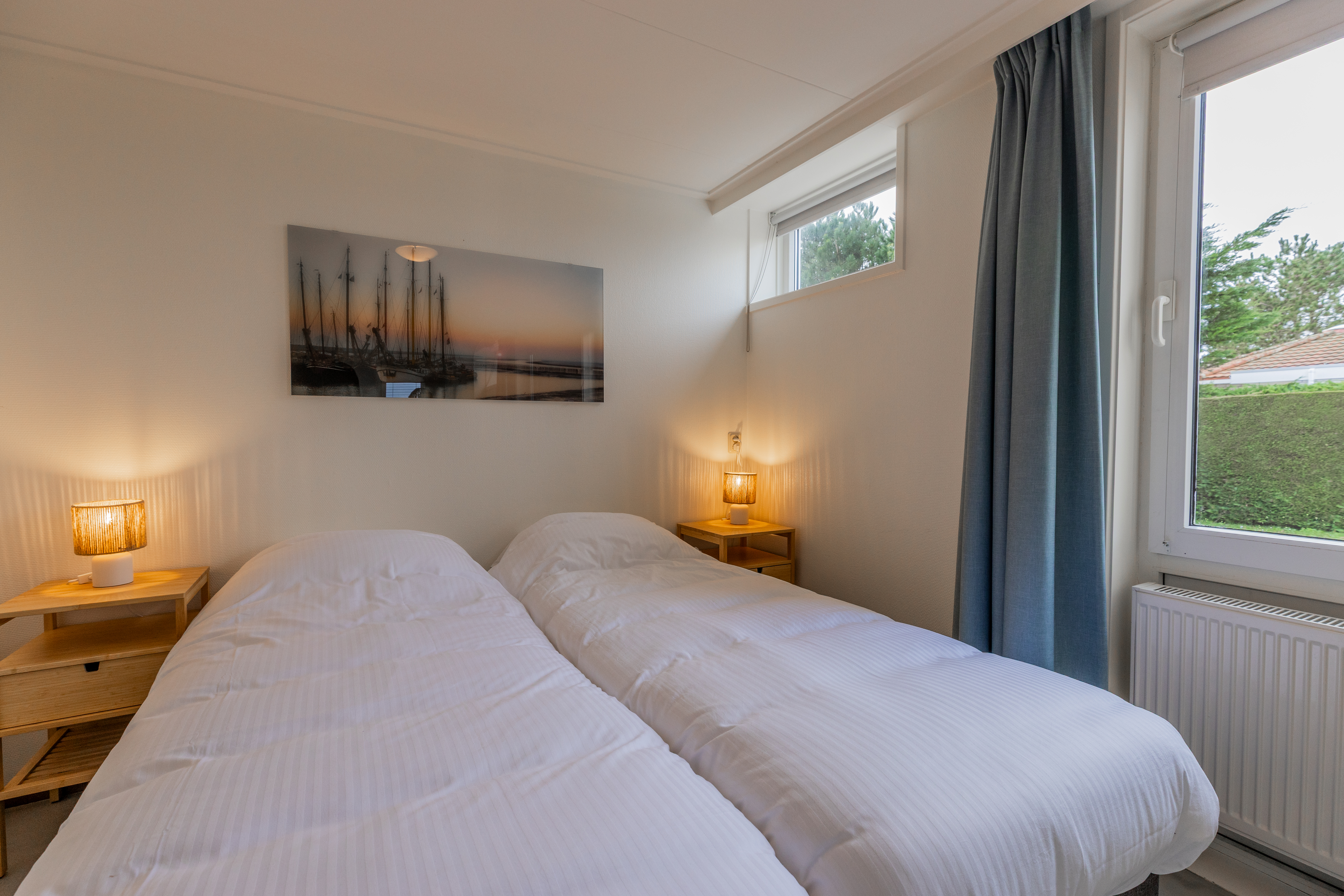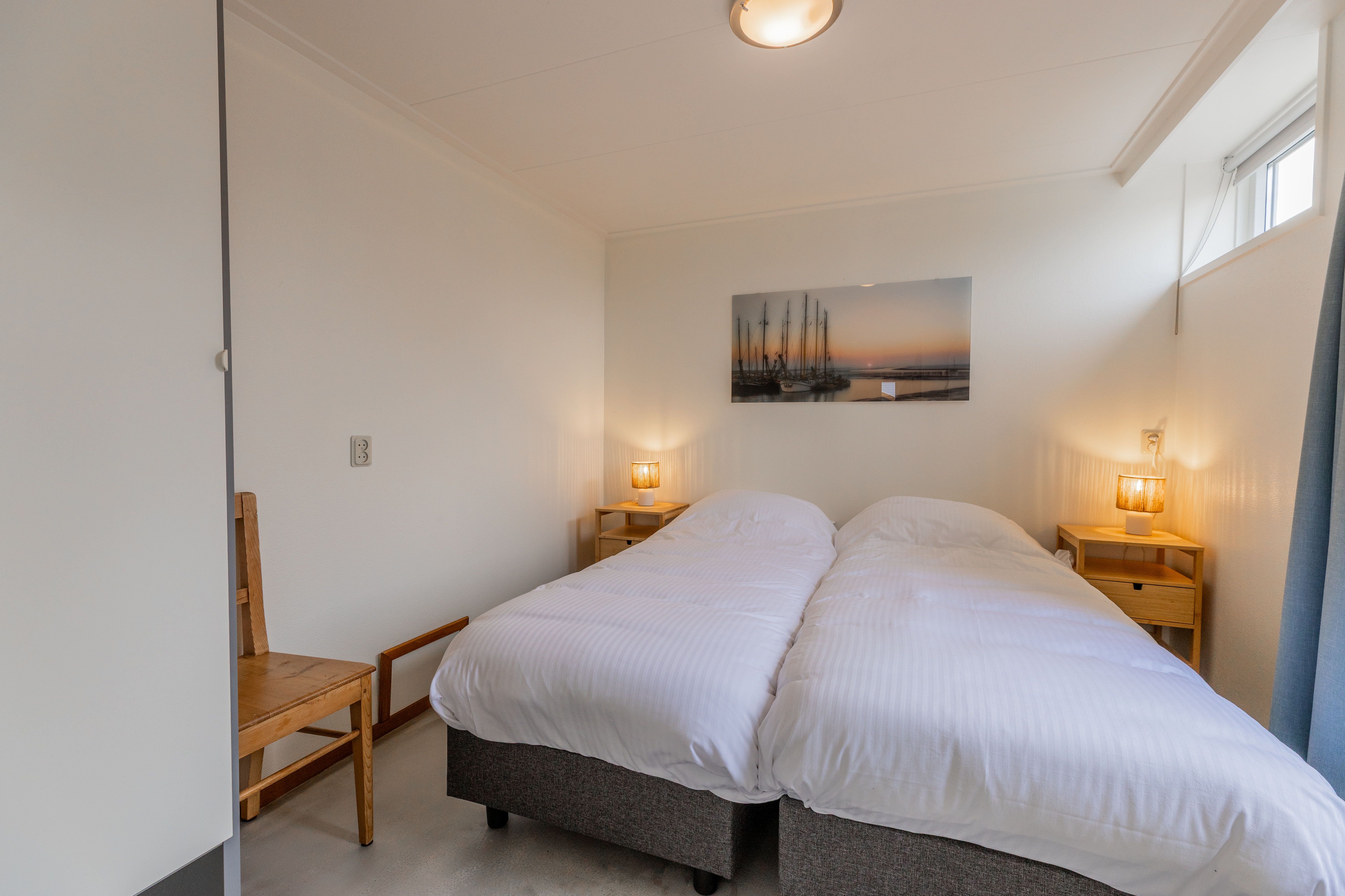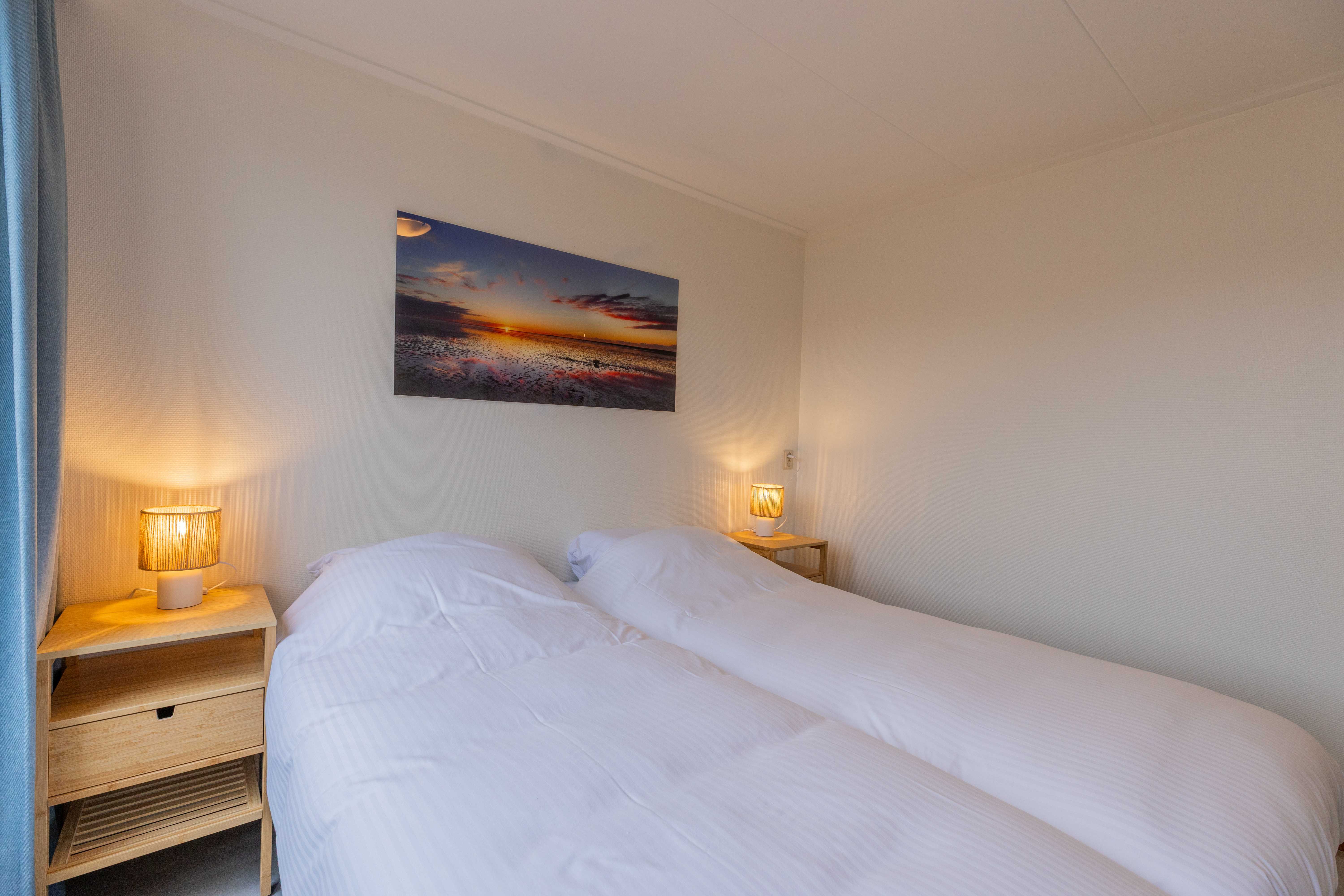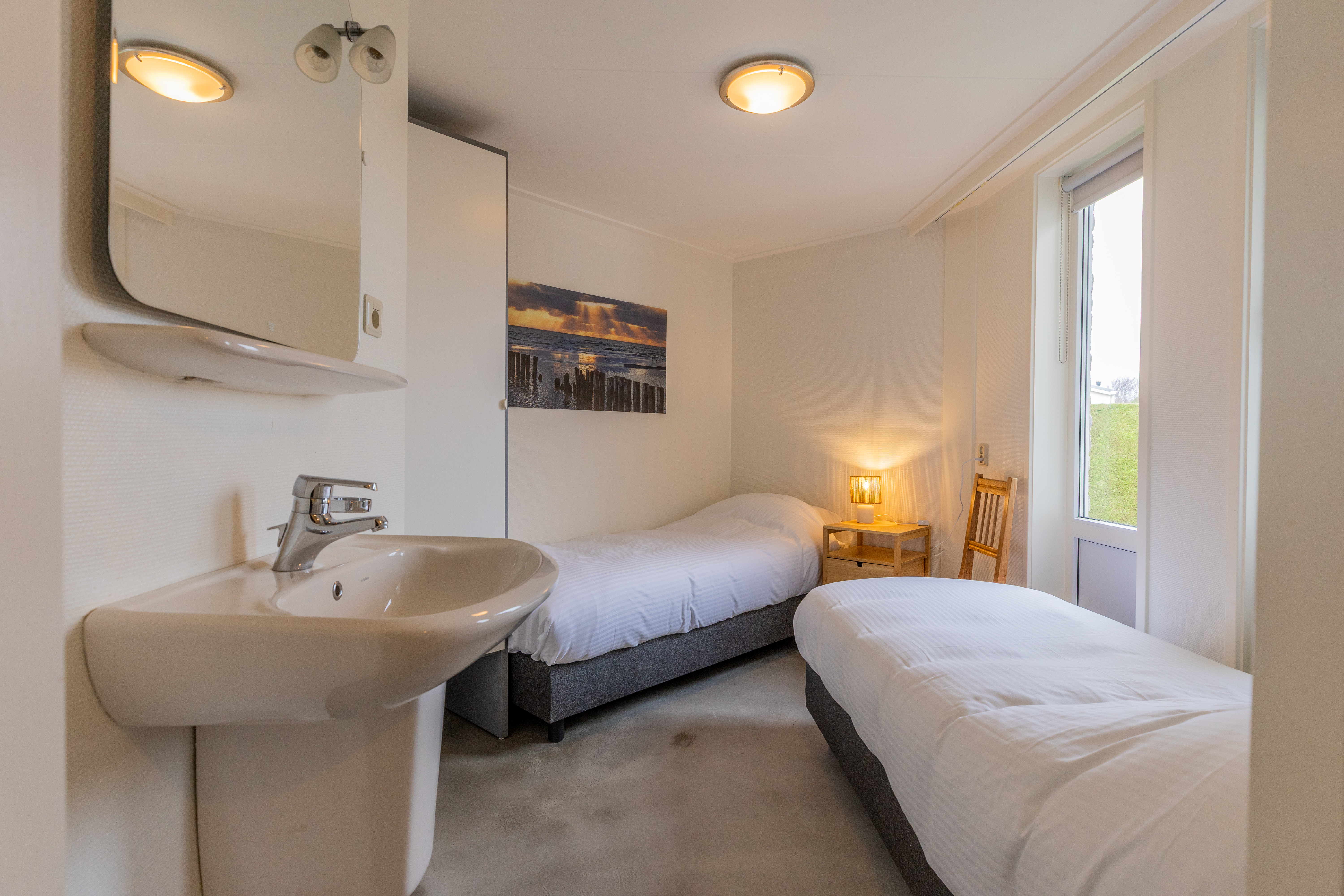 De bungalow beschikt over drie comfortabele slaapkamers. De grootste slaapkamer (circa 12 m²) grenst direct aan de woonkamer en is uitgerust met een tweepersoonsbed, een kledingkast en een wastafel. De overige twee slaapkamers (circa 10 m² en 9 m²) zijn eveneens voorzien van comfortabele boxspringbedden, kledingkasten en wastafels.