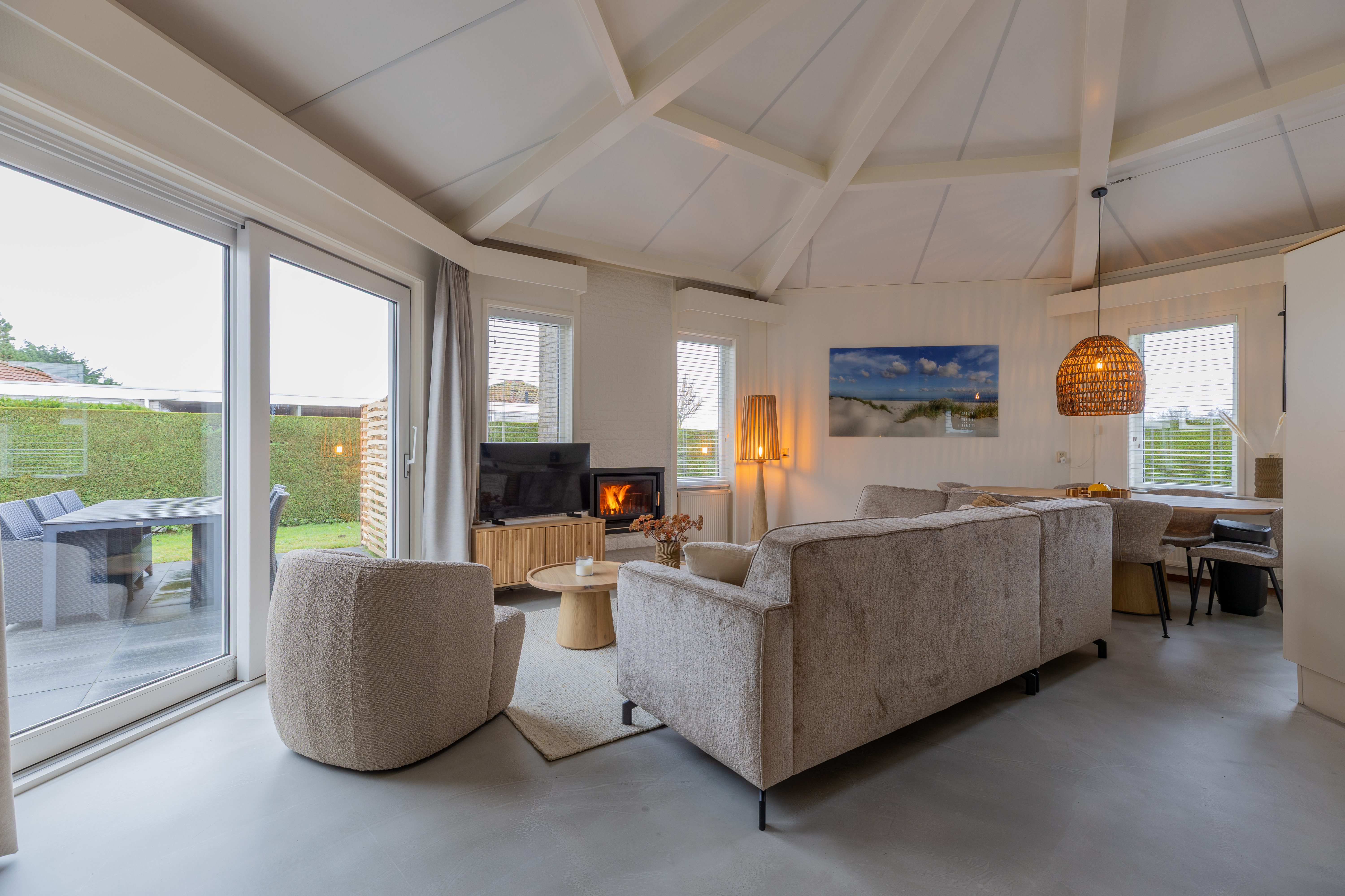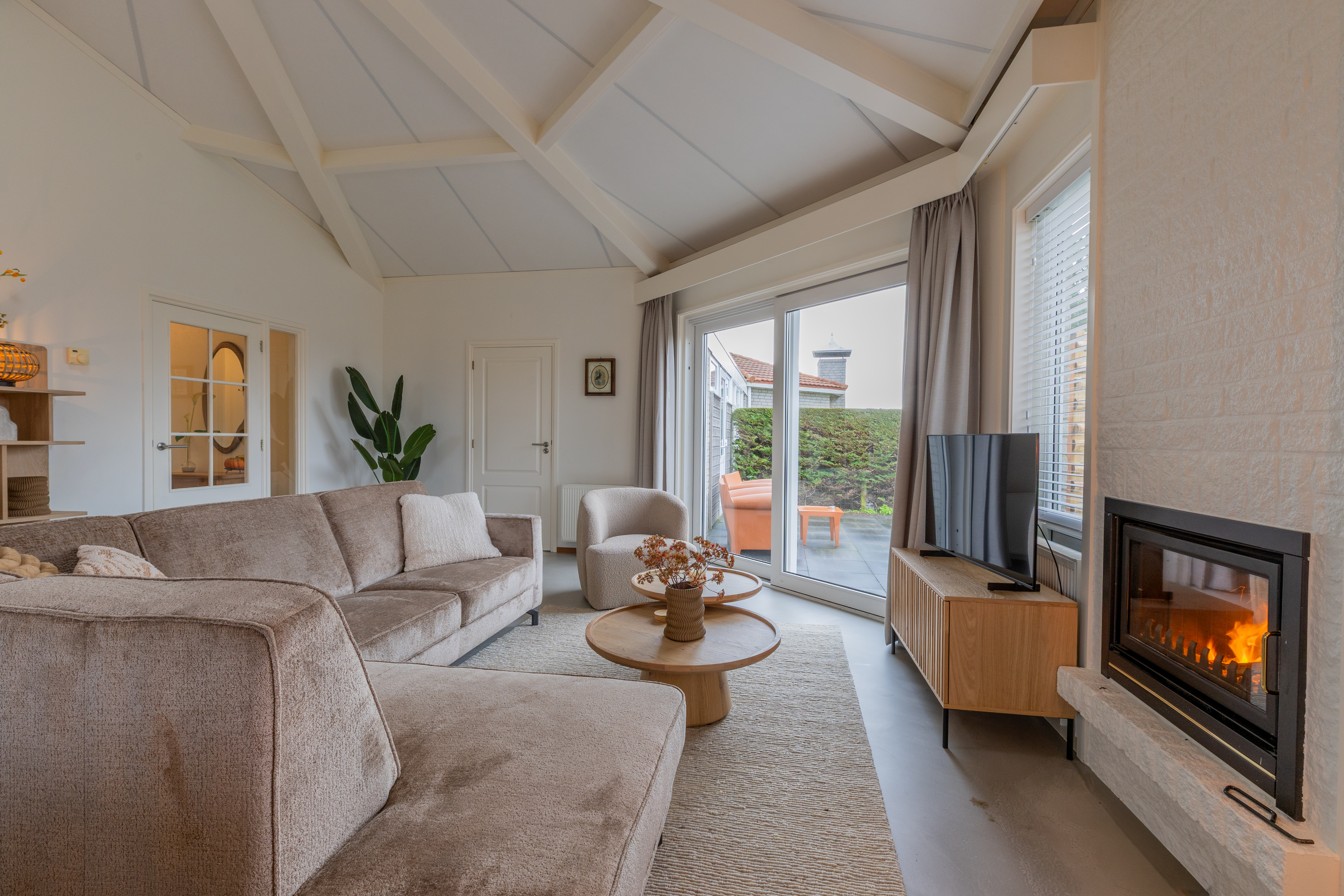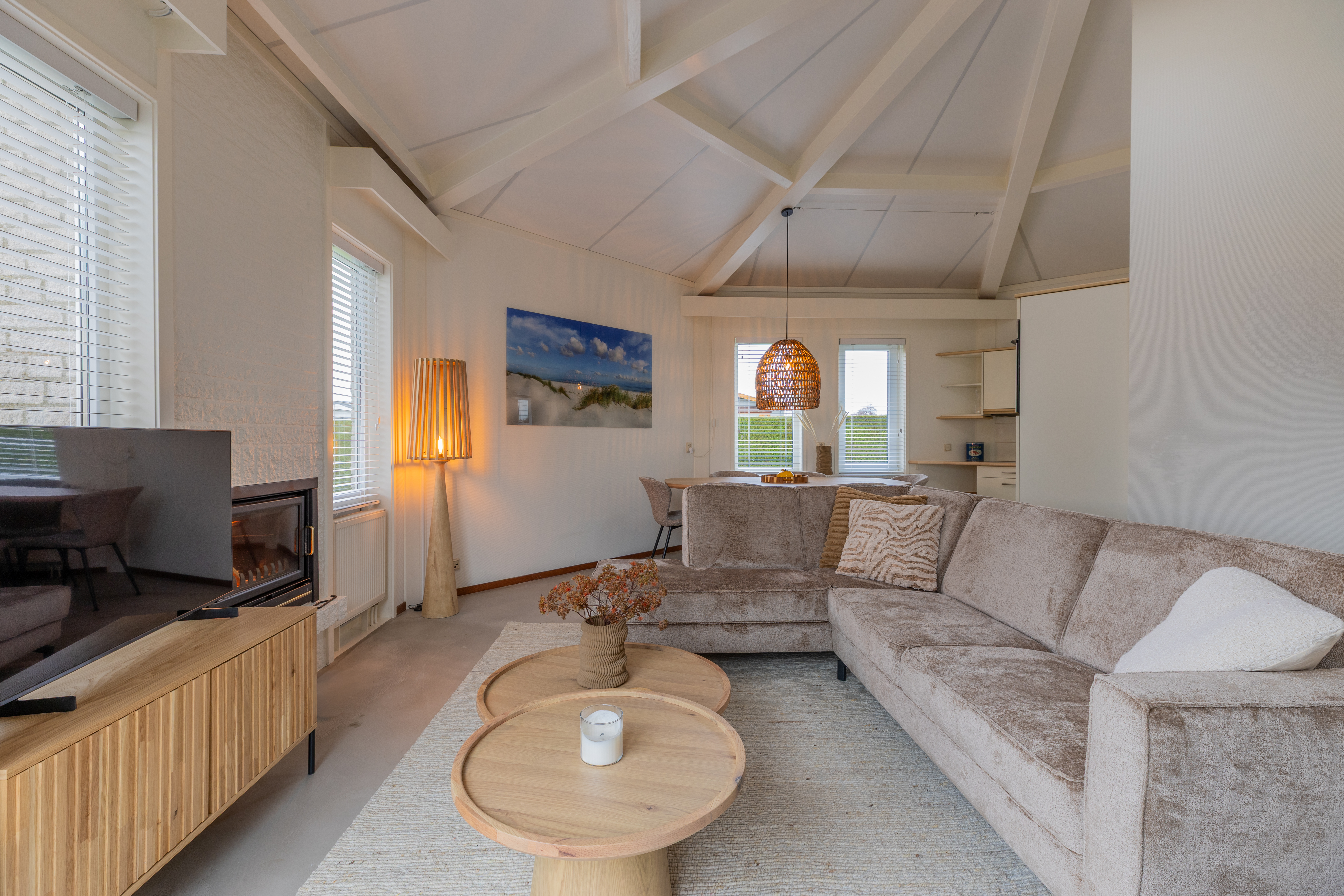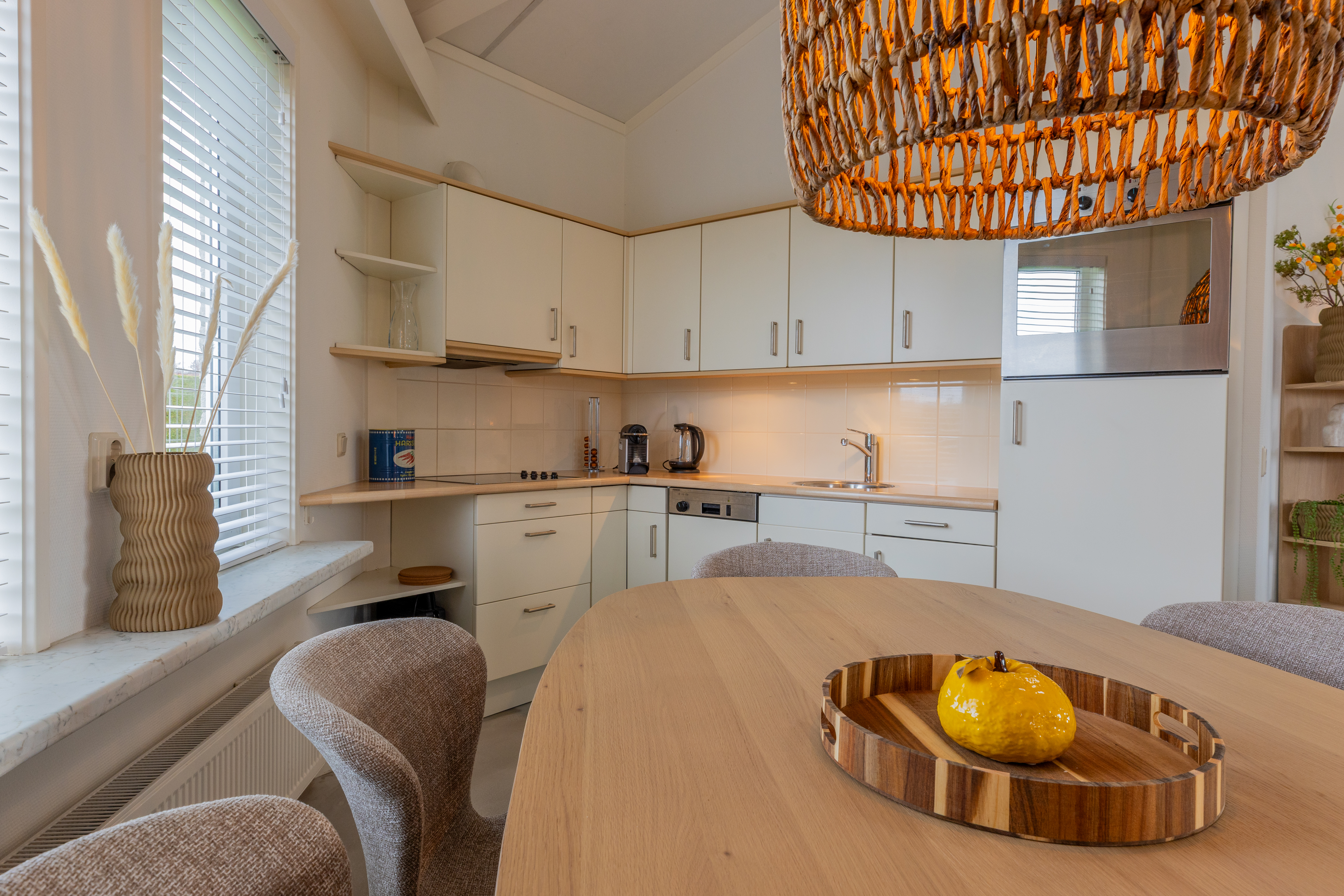 De woning kenmerkt zich door zijn speelse, achthoekige ontwerp met een hoog plafond in de woonkamer, wat zorgt voor een ruimtelijk en licht gevoel. De woonkamer van ongeveer 29 m² biedt een gezellige zithoek met open haard en directe toegang tot de open keuken. De keuken, voorzien van inbouwapparatuur, heeft een praktische indeling met kookplaat, koelkast en opbergruimte.