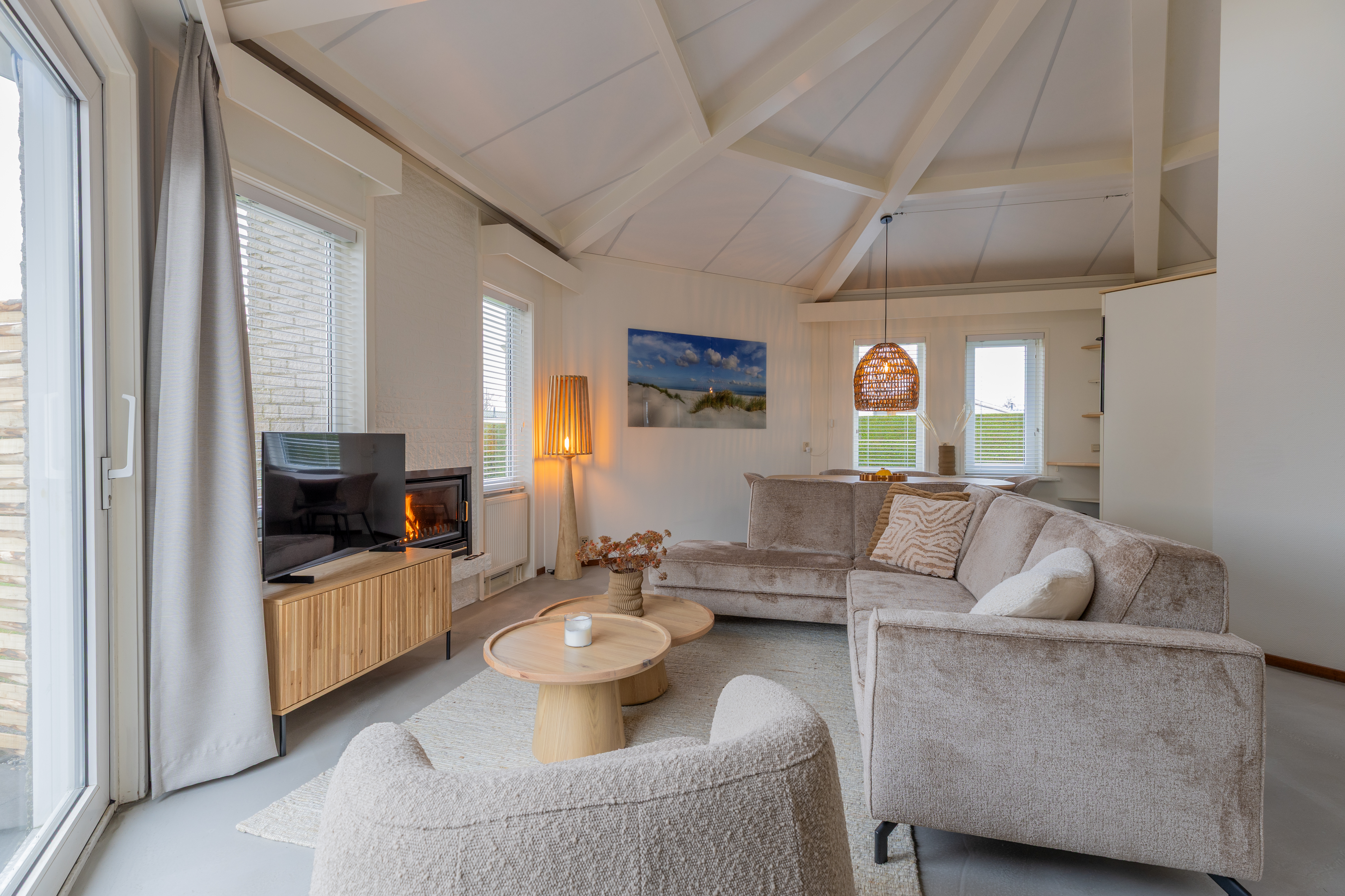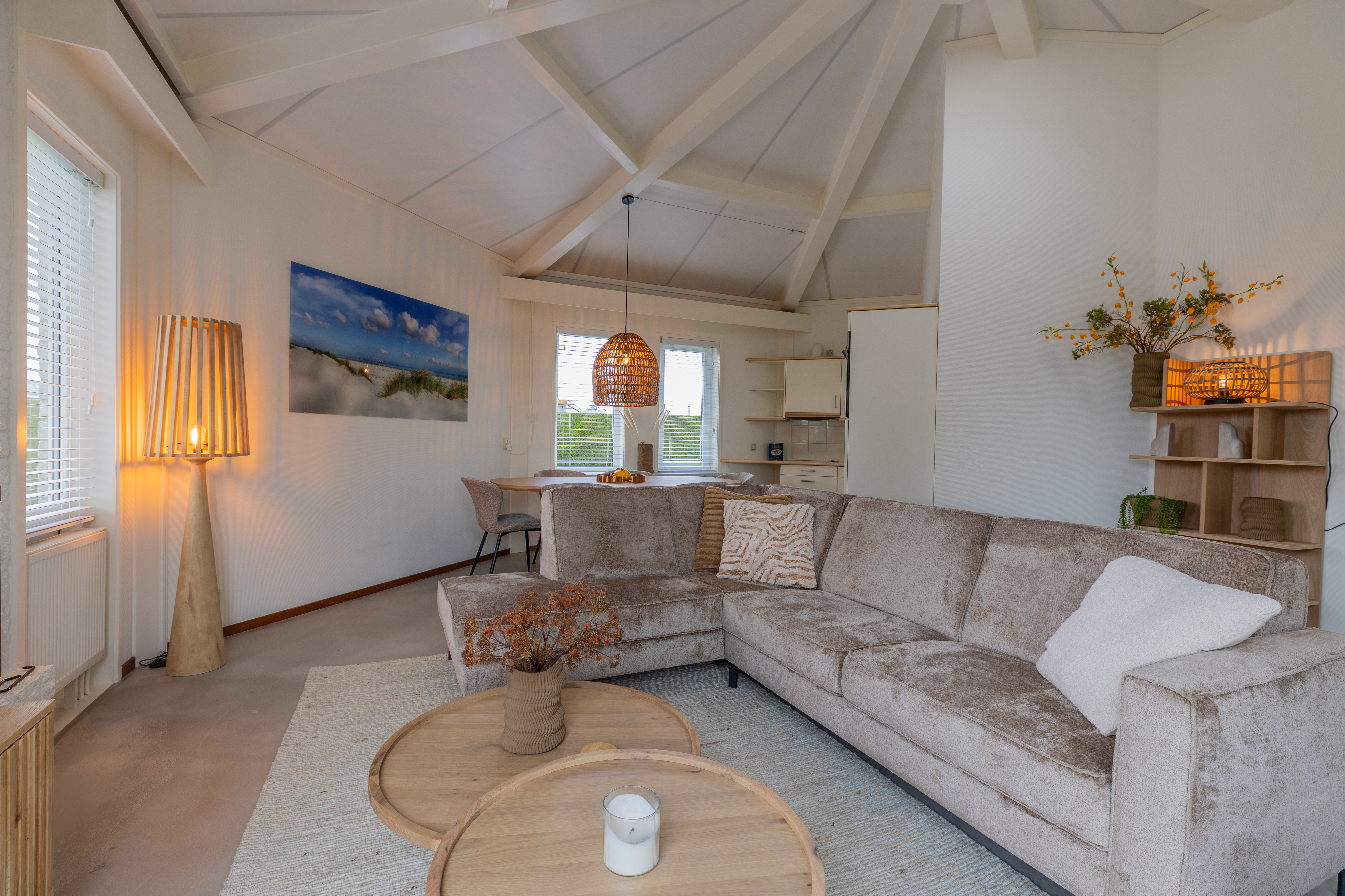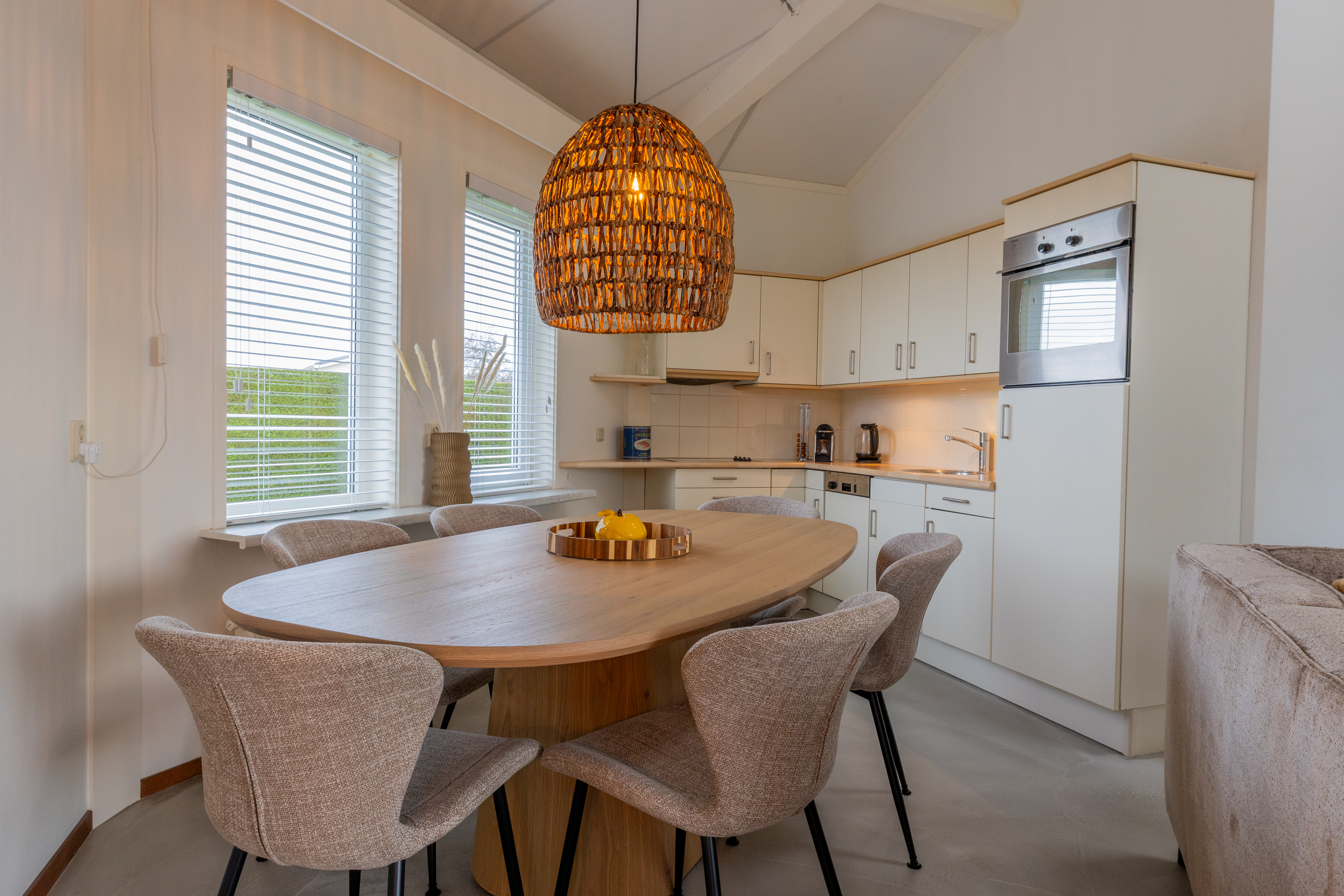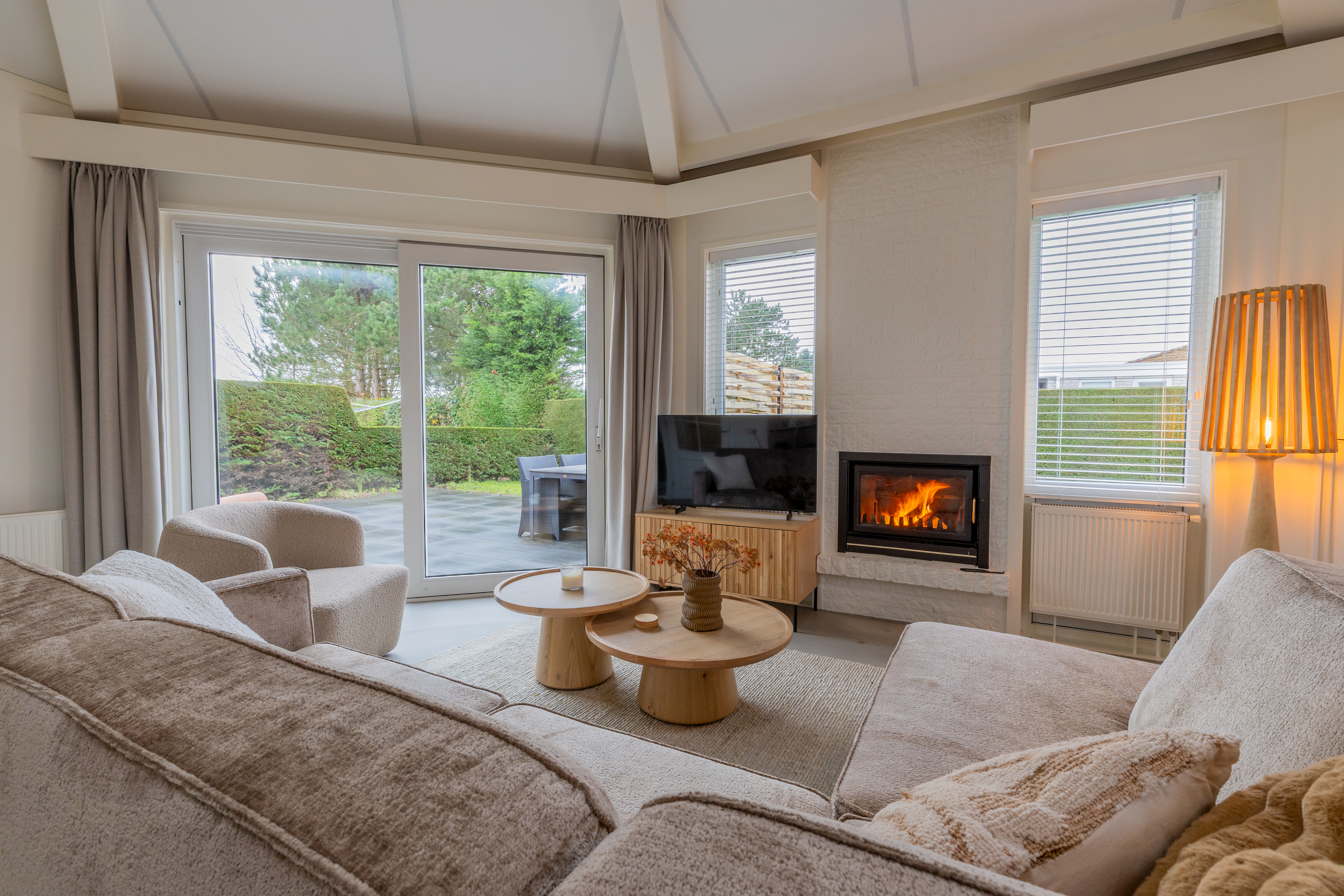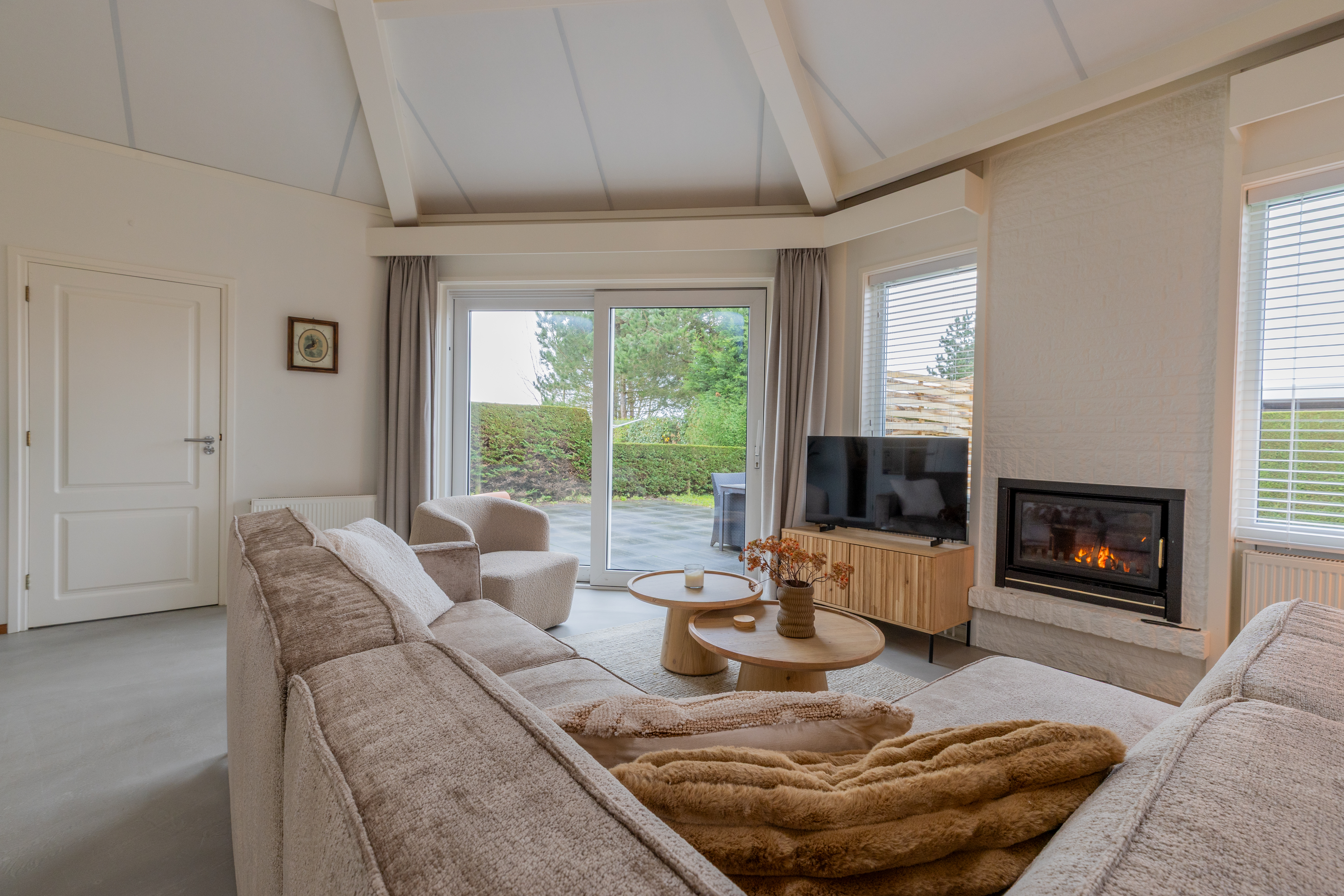De woning kenmerkt zich door zijn speelse, achthoekige ontwerp met een hoog plafond in de woonkamer, wat zorgt voor een ruimtelijk en licht gevoel. De woonkamer van ongeveer 29 m² biedt een gezellige zithoek met open haard en directe toegang tot de open keuken. De keuken, voorzien van inbouwapparatuur, heeft een praktische indeling met kookplaat, koelkast en opbergruimte.