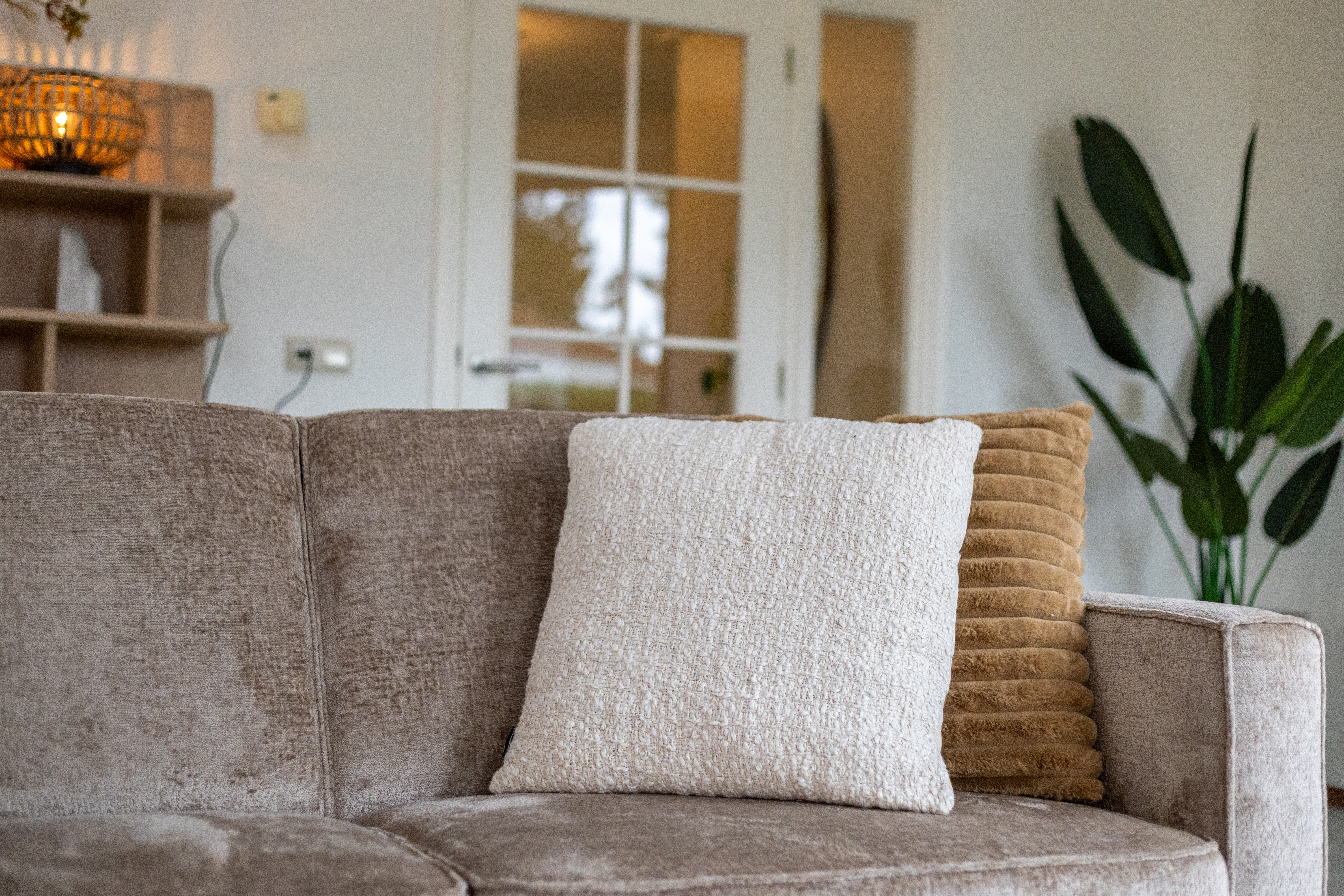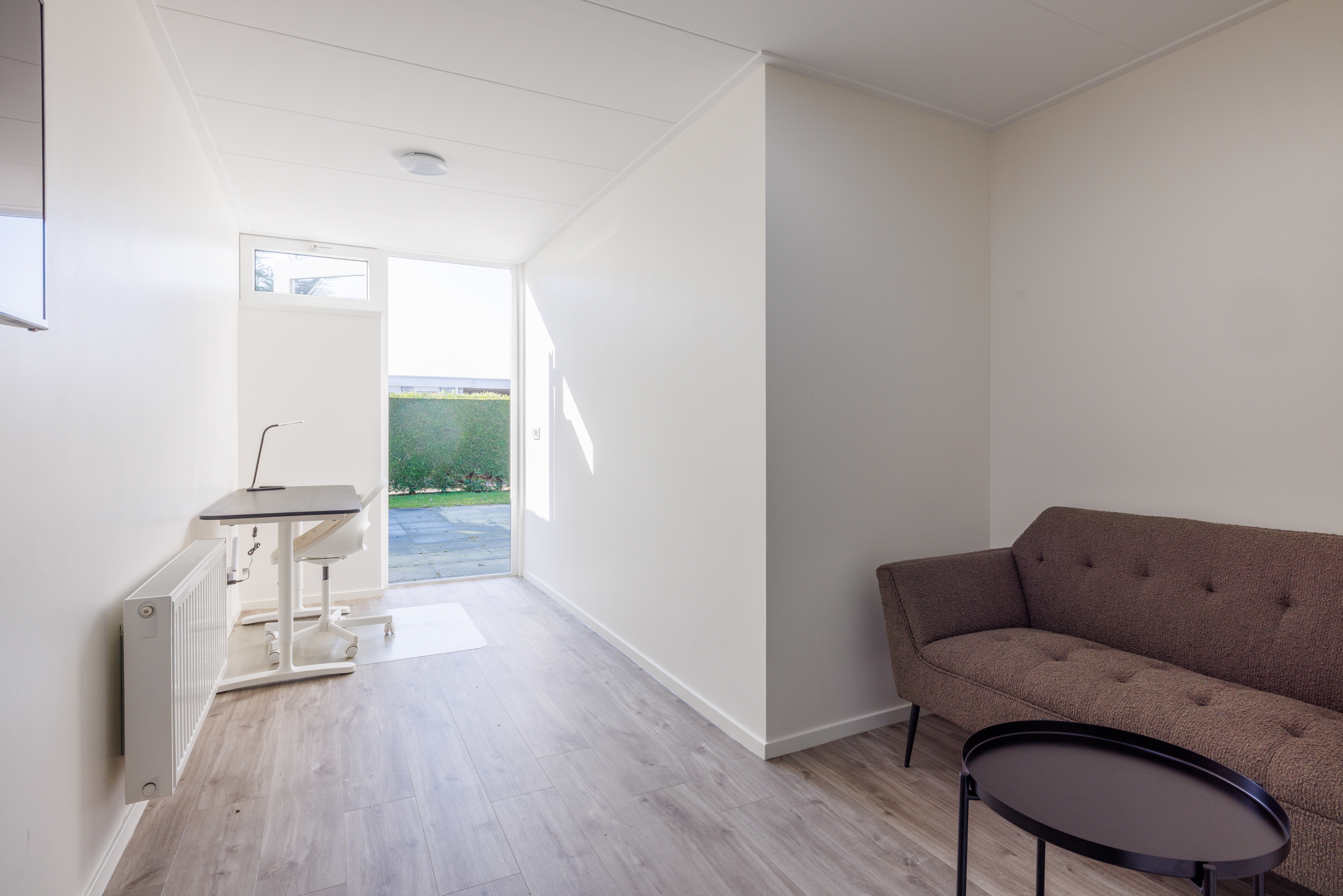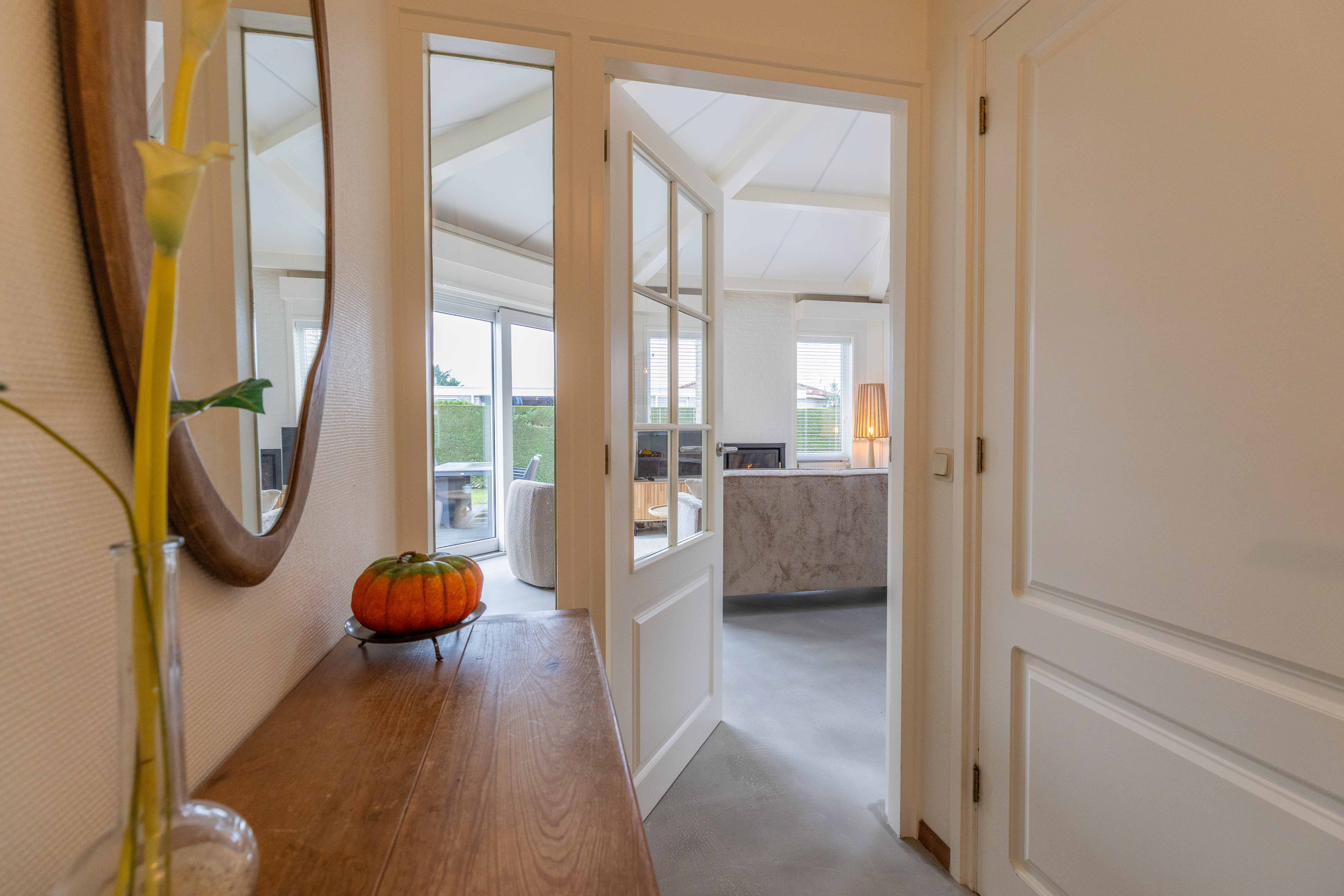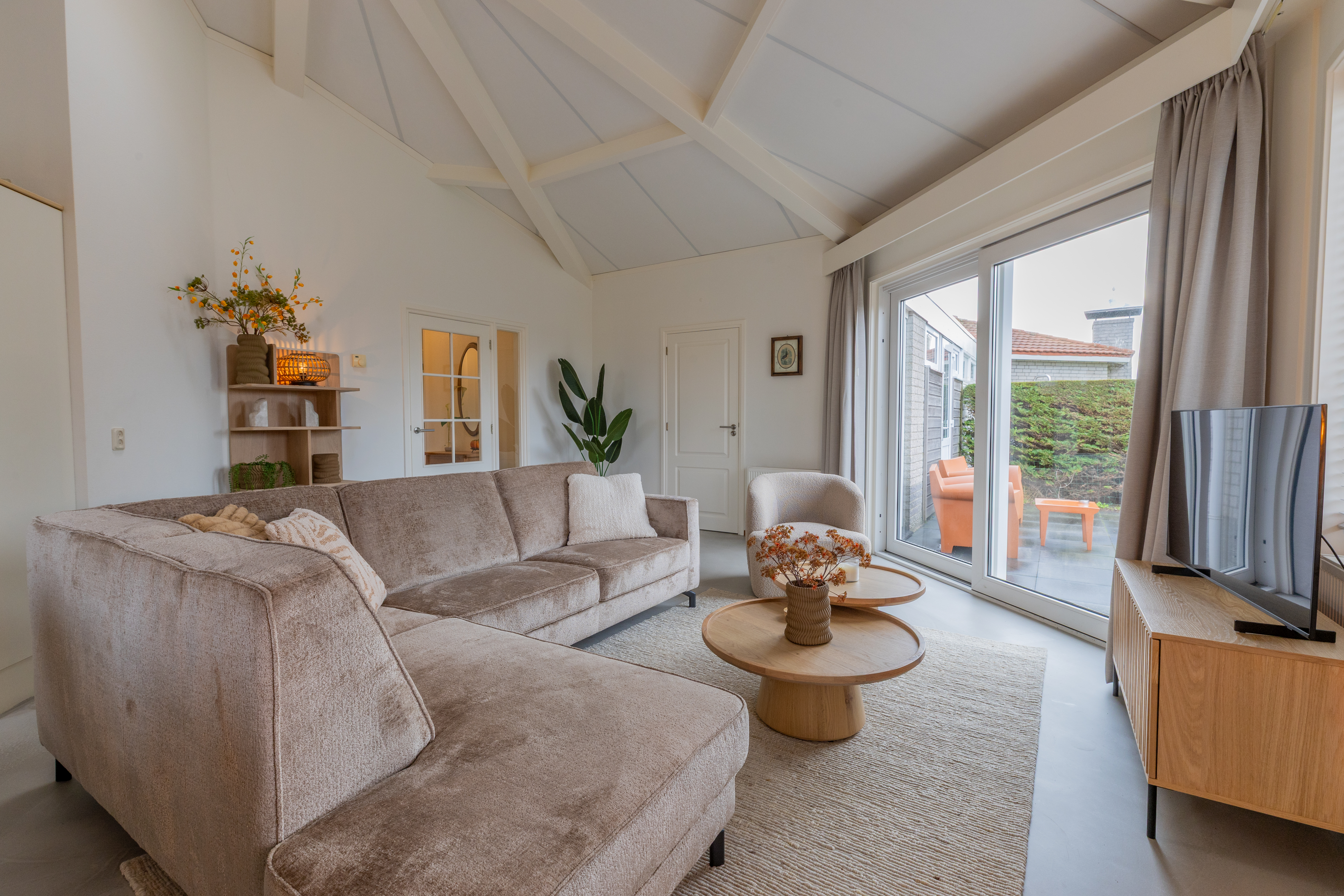 De woning kenmerkt zich door zijn speelse, achthoekige ontwerp met een hoog plafond in de woonkamer, wat zorgt voor een ruimtelijk en licht gevoel. De woonkamer van ongeveer 29 m² biedt een gezellige zithoek met open haard en directe toegang tot de open keuken. De keuken, voorzien van inbouwapparatuur, heeft een praktische indeling met kookplaat, koelkast en opbergruimte.