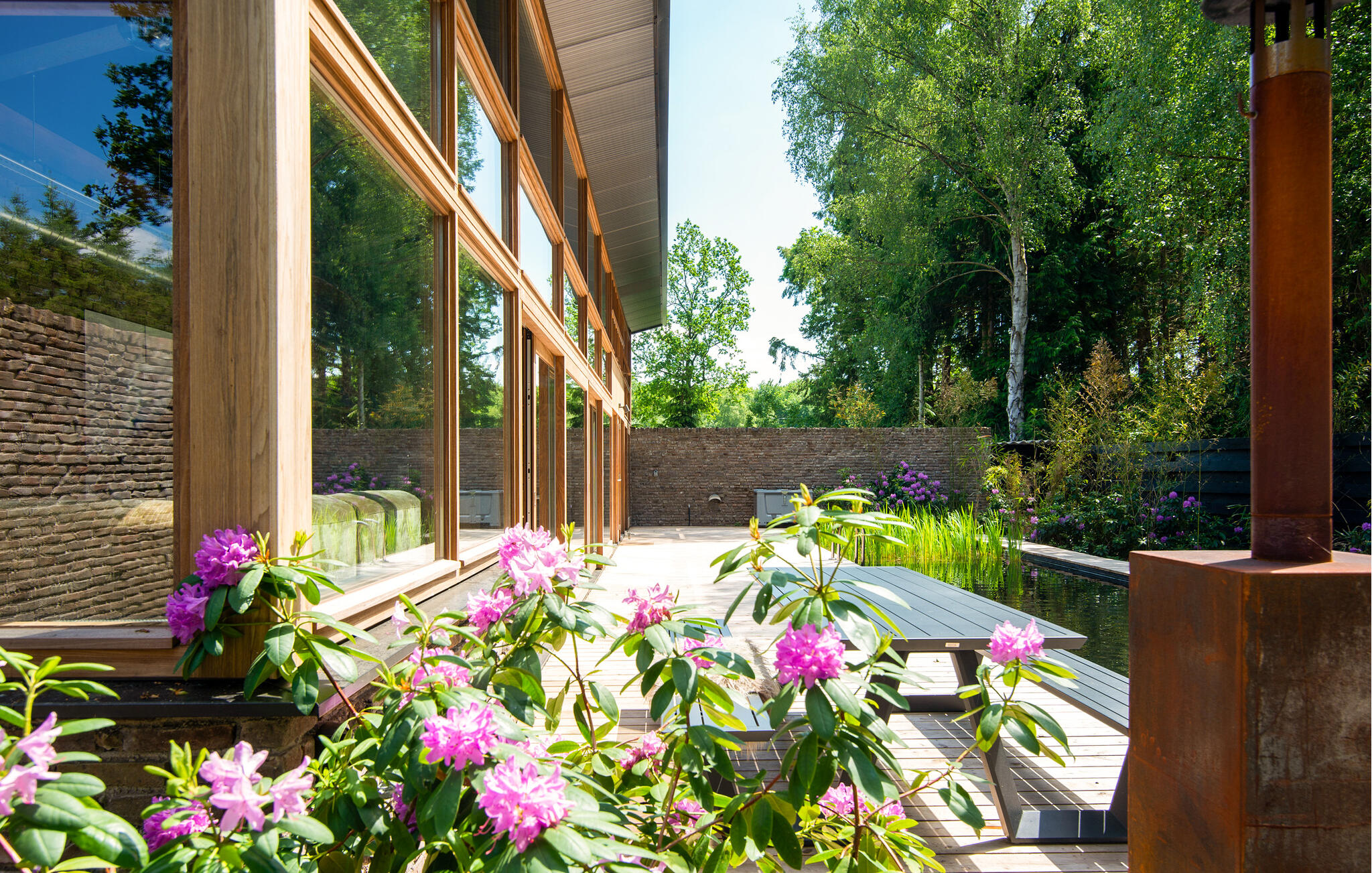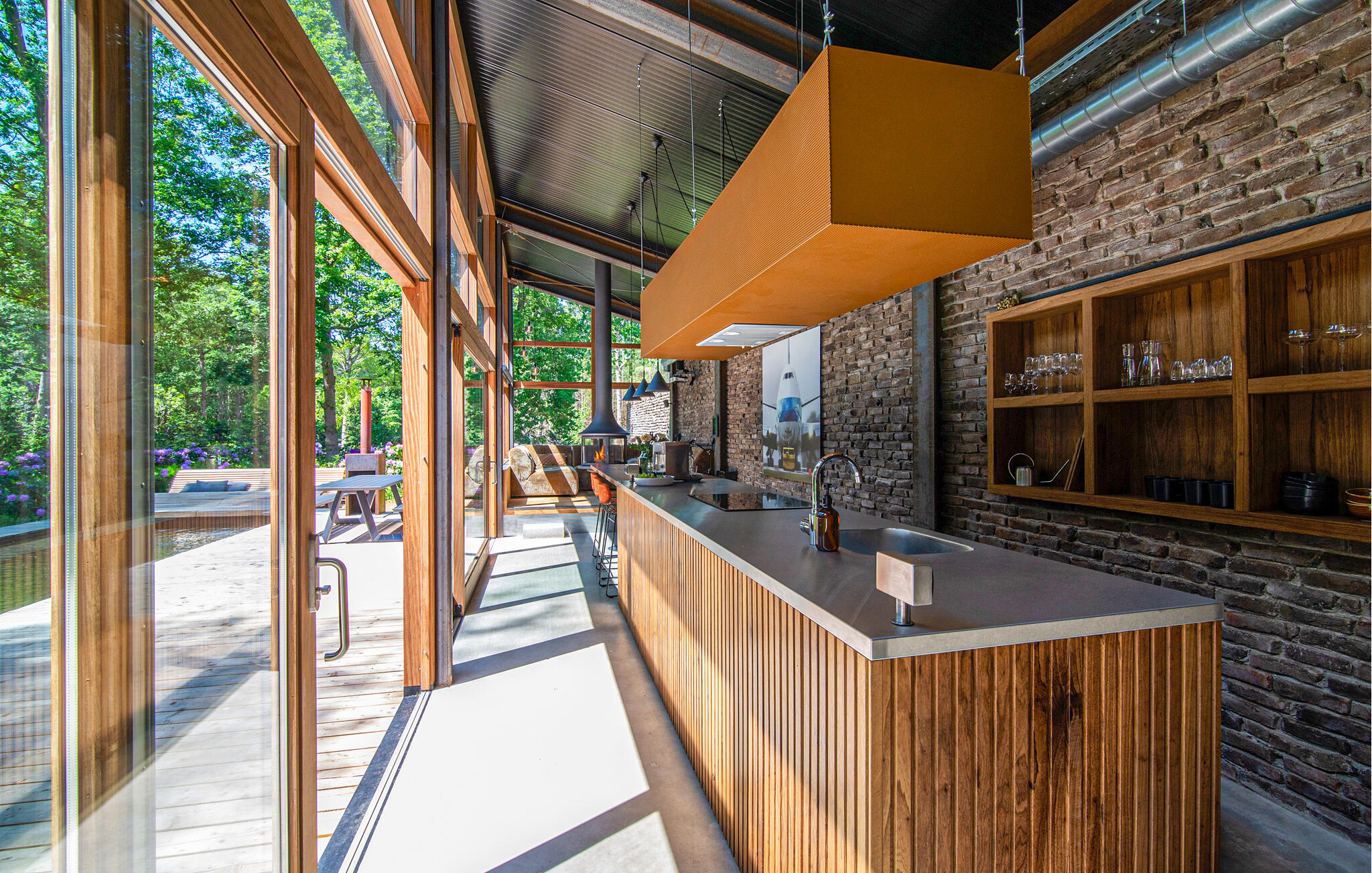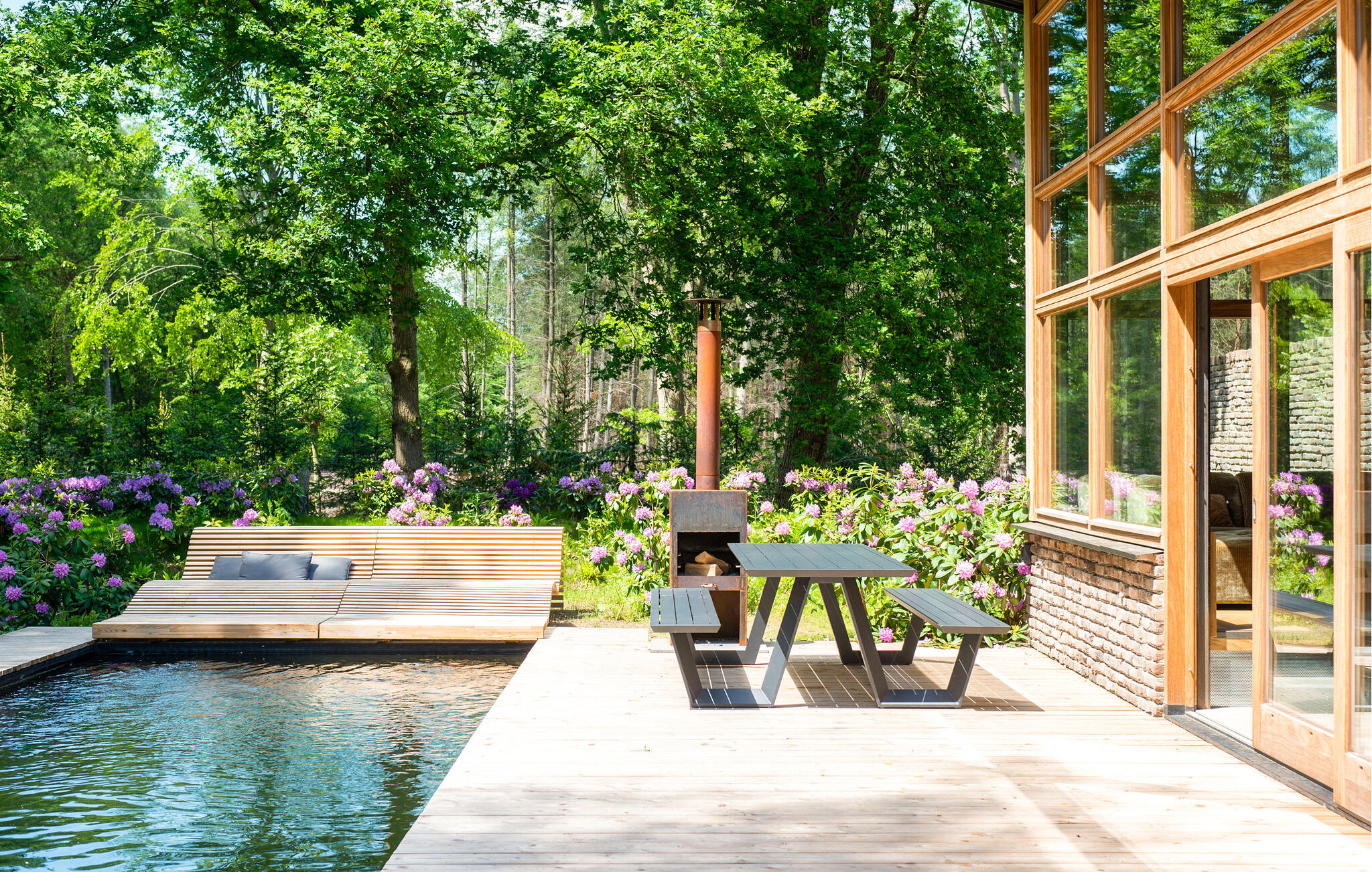 Nyd jeres ophold i dette exceptionelle hus, der på imponerende vis kombinerer moderne arkitektur med rolige naturlige omgivelser. Sæt jer godt til rette i den rummelige sofa i opholdsstuen, der er placeret lige foran gulv-til-loft-vinduerne. Brug den centralt monterede pejs til hyggelige aftener og se flammerne varme det åbne rum op. Tilbered måltider i det stilfulde køkken med dets lange arbejdsbord og integrerede morgenmadsbar, eller saml jer omkring det store træbord til fælles måltider. Tag jer tid til at læse eller nyde udsigten, som kan nydes fra næsten hvor som helst i opholdsstuen. Udenfor kan I slentre langs de brede trægange, der snor sig elegant omkring poolen. Vælg en plads på solterrassen eller slap af på loungebænken ved vandet for at slappe af i slutningen af dagen. Den frodige landskabspleje og den høje naturstensmur skaber en privat atmosfære, ideel til rolige øjeblikke udenfor. Besøg MORE Museum med dets imponerende samling af hollandsk modernisme. Tag en cykeltur gennem skovene i Veluwezoom Nationalpark eller vandr langs IJssel-floden, hvis bredder er smukke i alle årstider. Besøg Deventer med dens historiske gamle bydel og charmerende butikker, eller nyd regionale specialiteter på caféerne i Gorssels landsbycentrum.