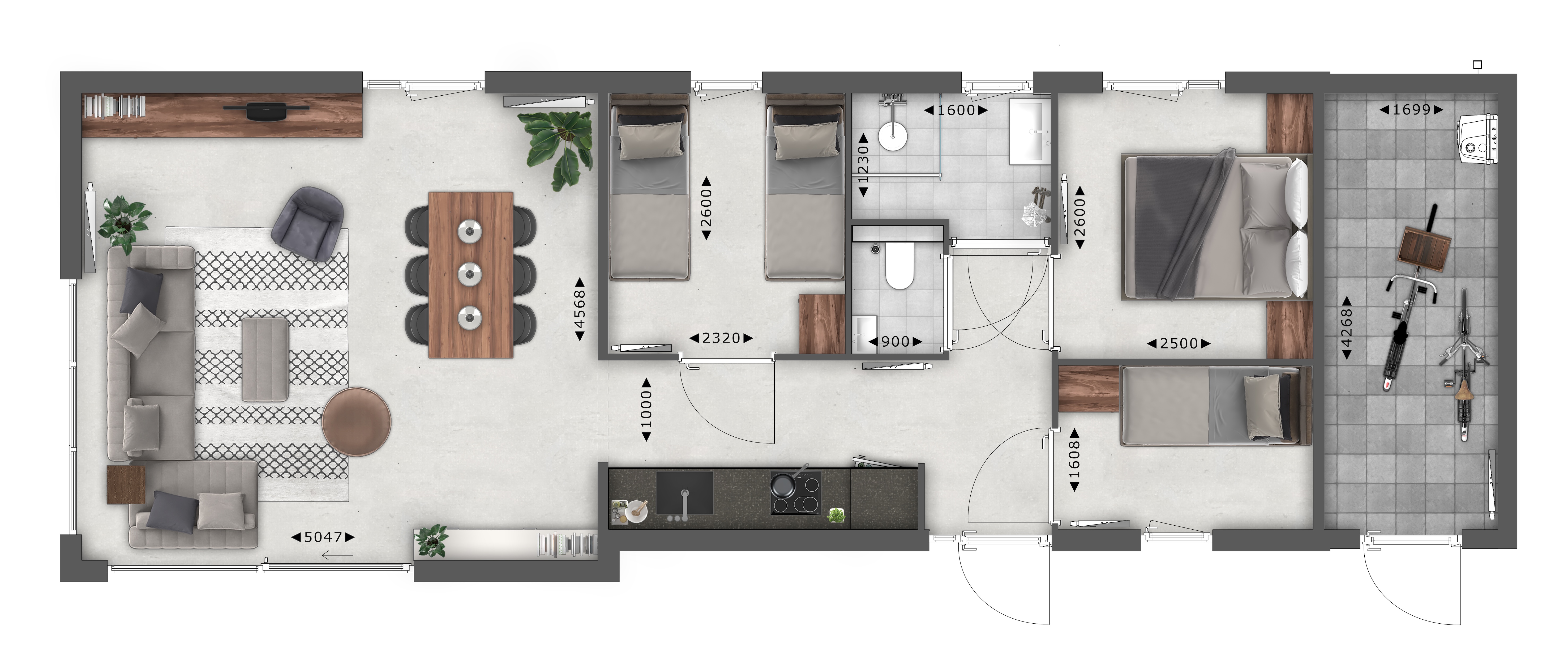 Die moderne Küche ist vollständig ausgestattet und verfügt über einen Kühlschrank mit Gefrierfach, einen Geschirrspüler, ein Induktionskochfeld, einen Backofen mit Mikrowellenfunktion und eine Nespresso-Maschine. Drei Schlafzimmer – eines mit Doppelbett, eines mit zwei Einzelbetten und eines mit Etagenbett – machen die Unterkunft ideal für Familien mit Kindern oder einen Urlaub mit Freunden. Das Badezimmer bietet zusätzlichen Komfort mit einer modernen Regendusche.