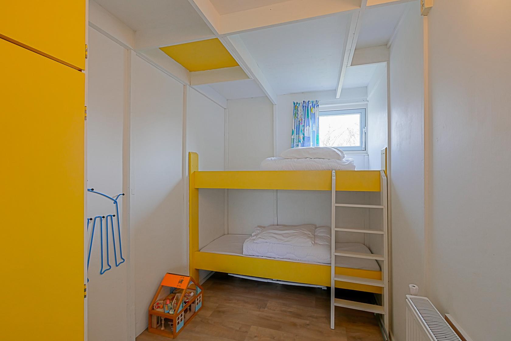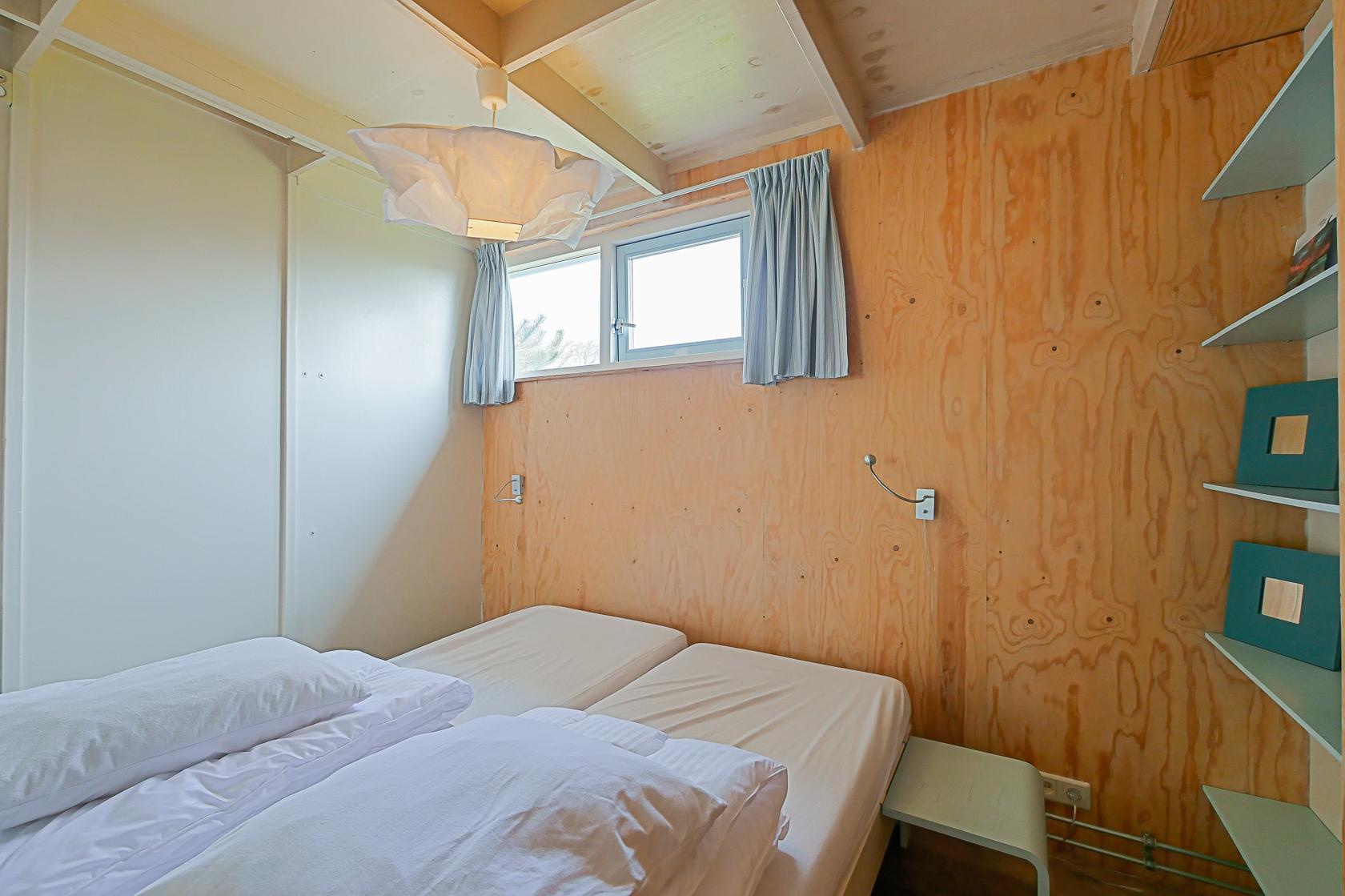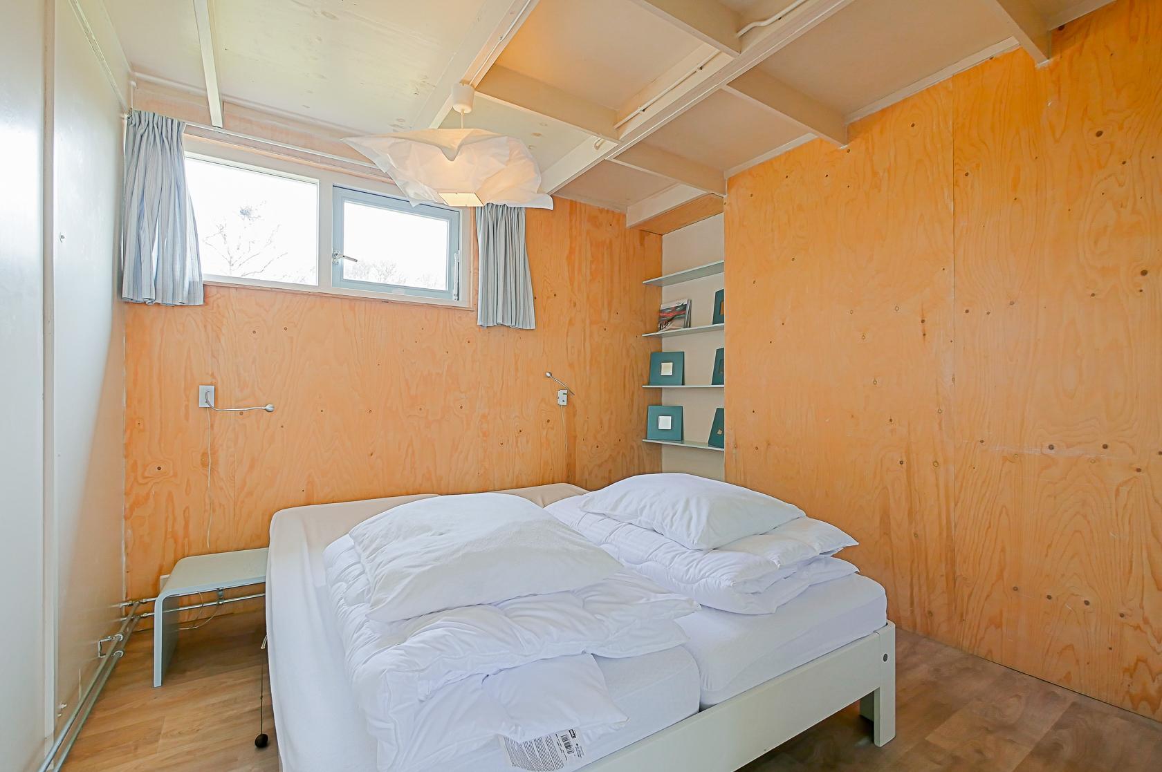 Das Haus verfügt über zwei Schlafzimmer, die beide im Erdgeschoss liegen. Im Hauptschlafzimmer steht ein Doppelbett sowie ein Kleiderschrank mit ausreichend Stauraum. Das zweite Schlafzimmer ist mit einem Etagenbett ausgestattet. Auch hier gibt es einen Kleiderschrank. Das kompakt gestaltete Badezimmer bietet eine Dusche, ein Waschbecken und eine Toilette.