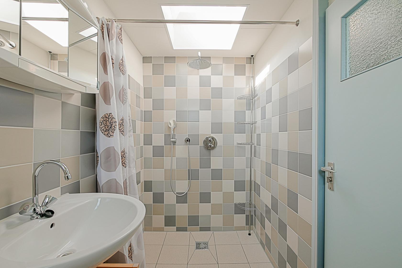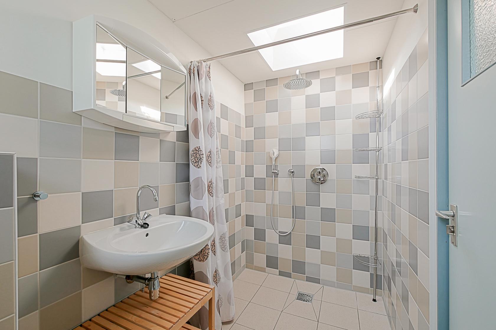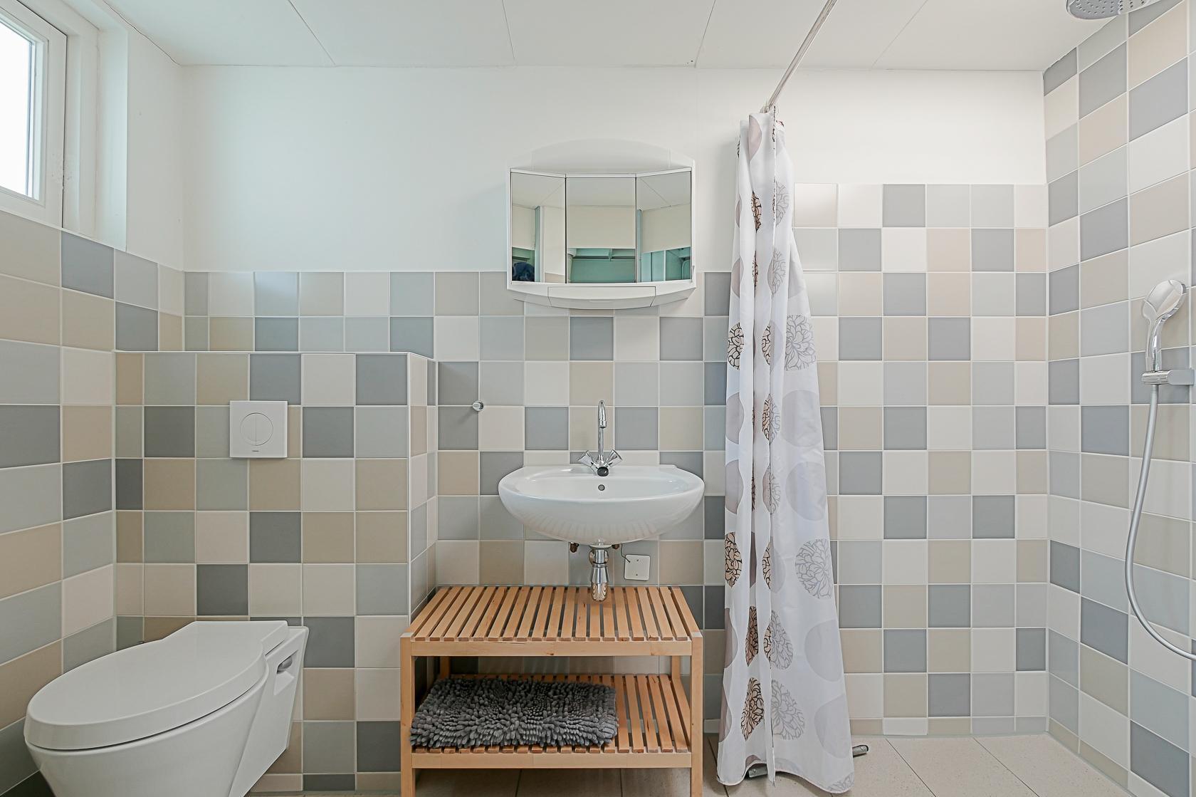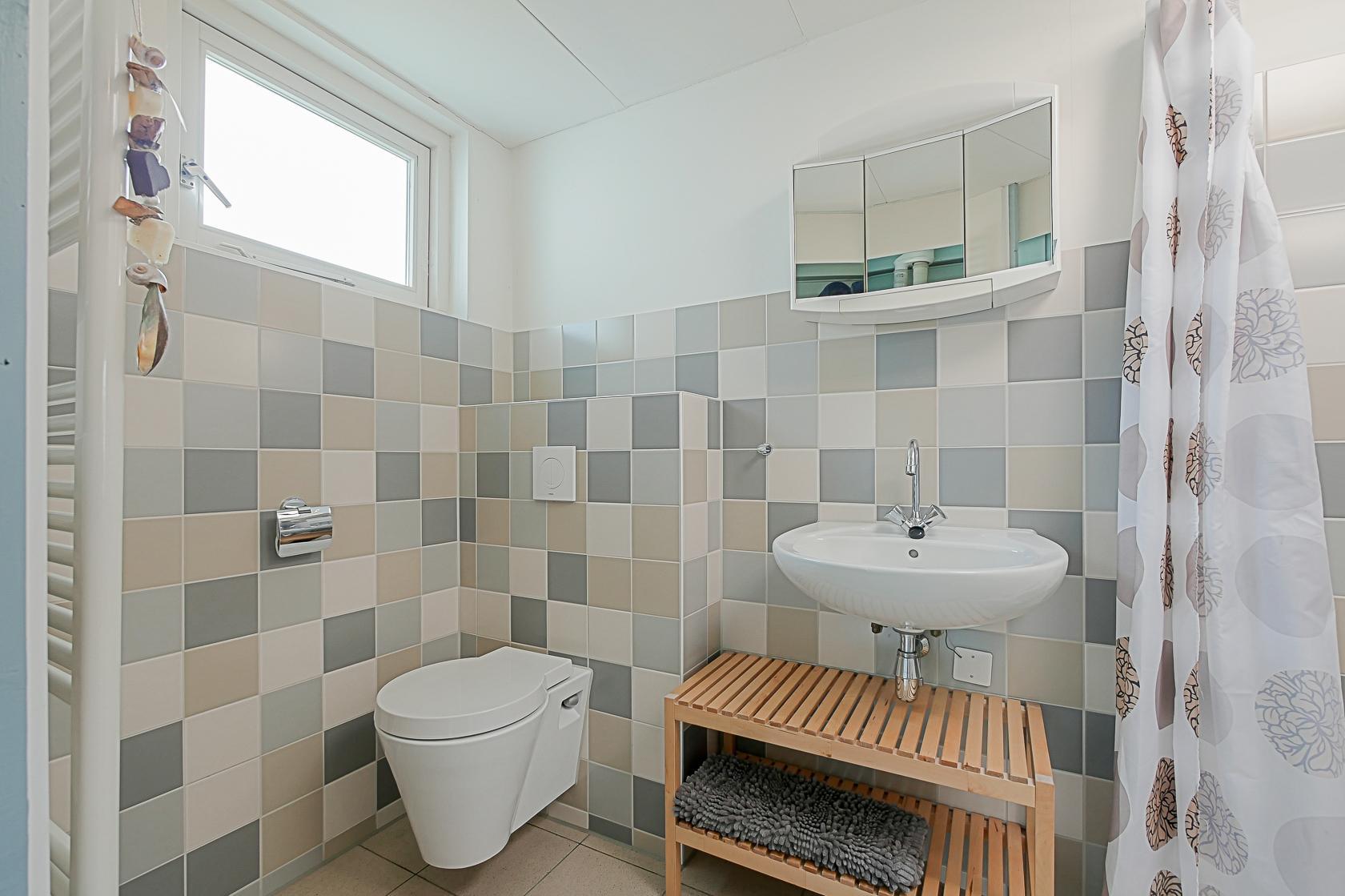 Das Haus verfügt über zwei Schlafzimmer, die beide im Erdgeschoss liegen. Im Hauptschlafzimmer steht ein Doppelbett sowie ein Kleiderschrank mit ausreichend Stauraum. Das zweite Schlafzimmer ist mit einem Etagenbett ausgestattet. Auch hier gibt es einen Kleiderschrank. Das kompakt gestaltete Badezimmer bietet eine Dusche, ein Waschbecken und eine Toilette.
