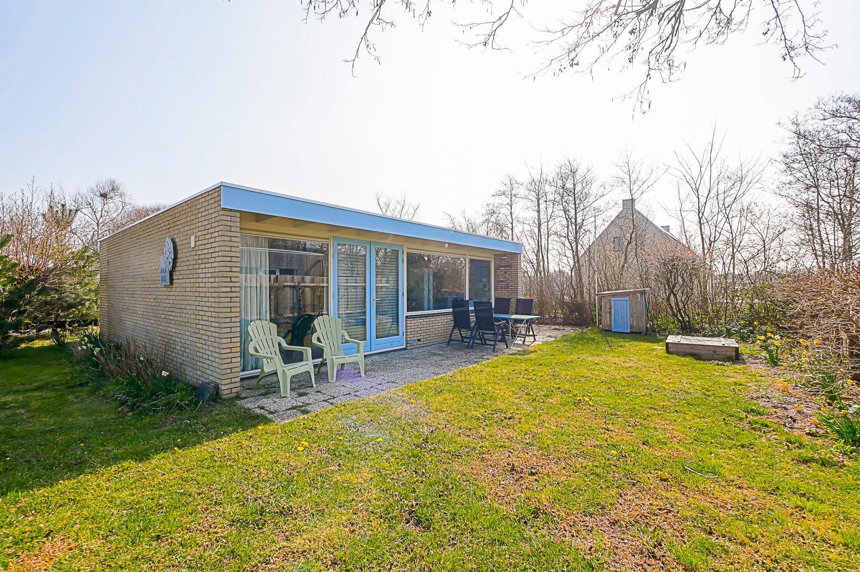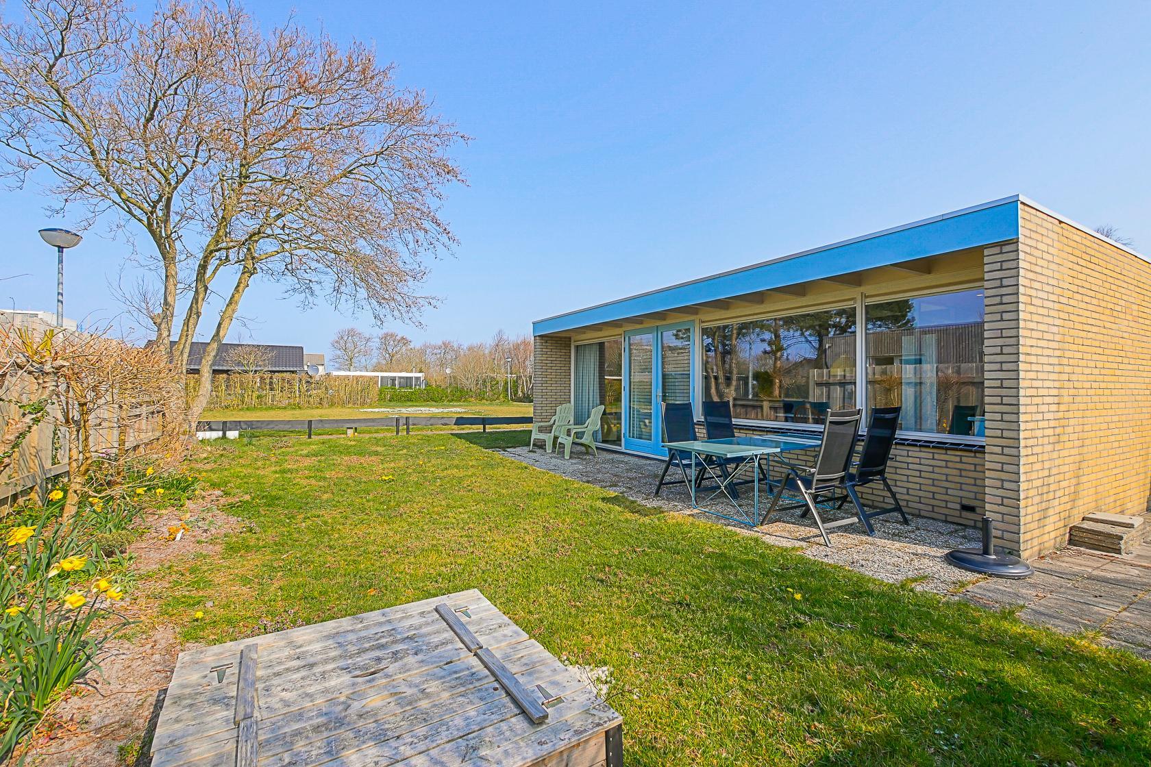 Der Garten rund um das Haus ist großzügig angelegt und bietet viel Platz zum Spielen und Entspannen. Er ist nicht vollständig, aber teilweise eingezäunt und verfügt über eine Terrasse mit Gartenmöbeln und Sonnenschirm. Hier können Sie morgens frühstücken, nach einem Strandtag zur Ruhe kommen oder den Abend im Freien ausklingen lassen. Im Park gibt es einen Spielplatz und einen Fußballplatz. Hunde sind im Ferienhaus herzlich willkommen