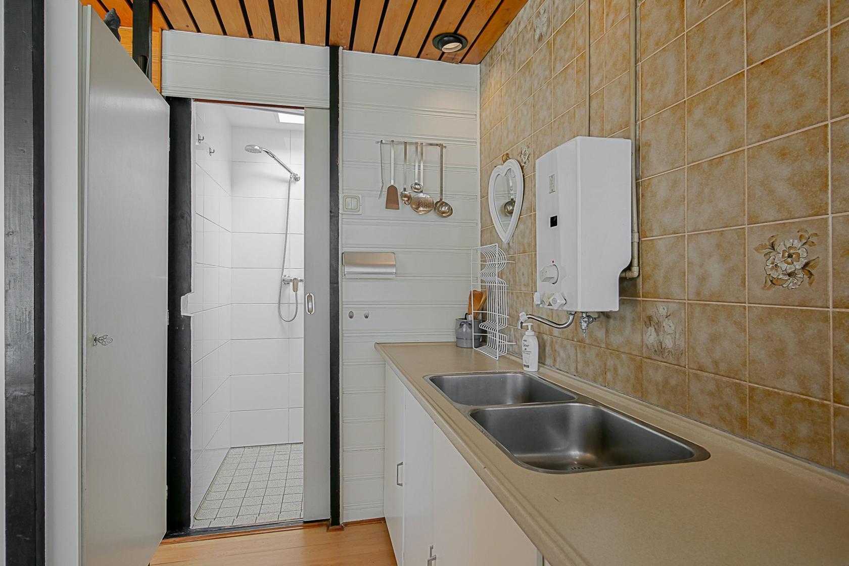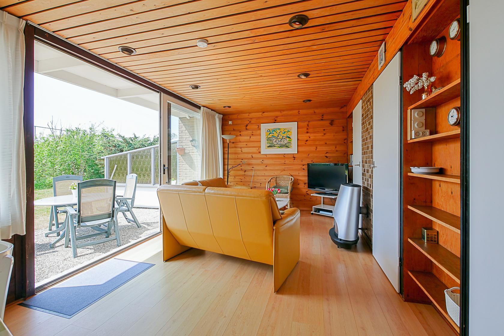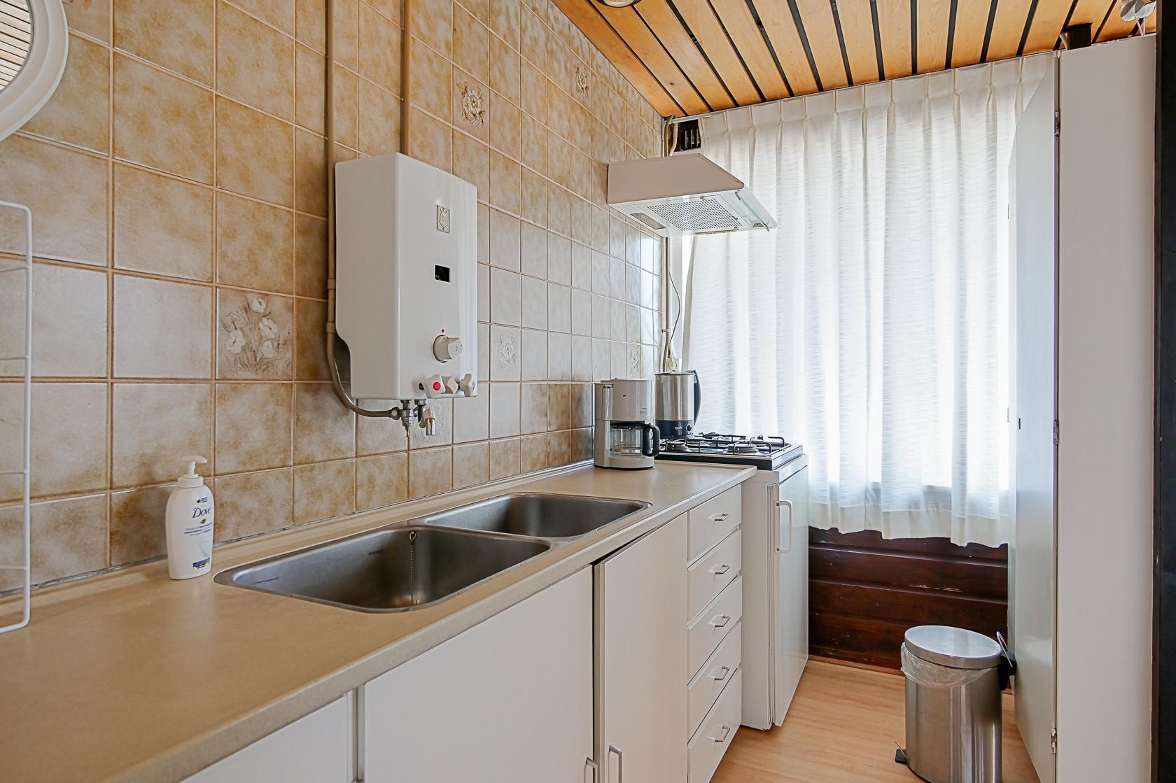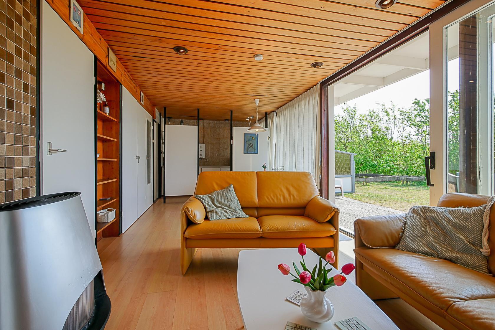 Das ebenerdige Ferienhaus ist einfach, aber gepflegt eingerichtet und bietet alles, was Sie für einen angenehmen Aufenthalt benötigen. Der Wohnbereich hat einen direkten Zugang zum privaten Garten hinter dem Haus und ist mit einem Flachbildfernseher, Kamin, kostenlosem WLAN sowie einer gemütlichen Sitzecke ausgestattet. Die angrenzende Küche verfügt über einen 4-Flammen-Gasherd, einen Kühlschrank mit Gefrierfach, Toaster, Wasserkocher und eine Kaffeemaschine. Eine Spülmaschine ist nicht vorhanden, Warmwasser wird über einen Küchenboiler erzeugt.