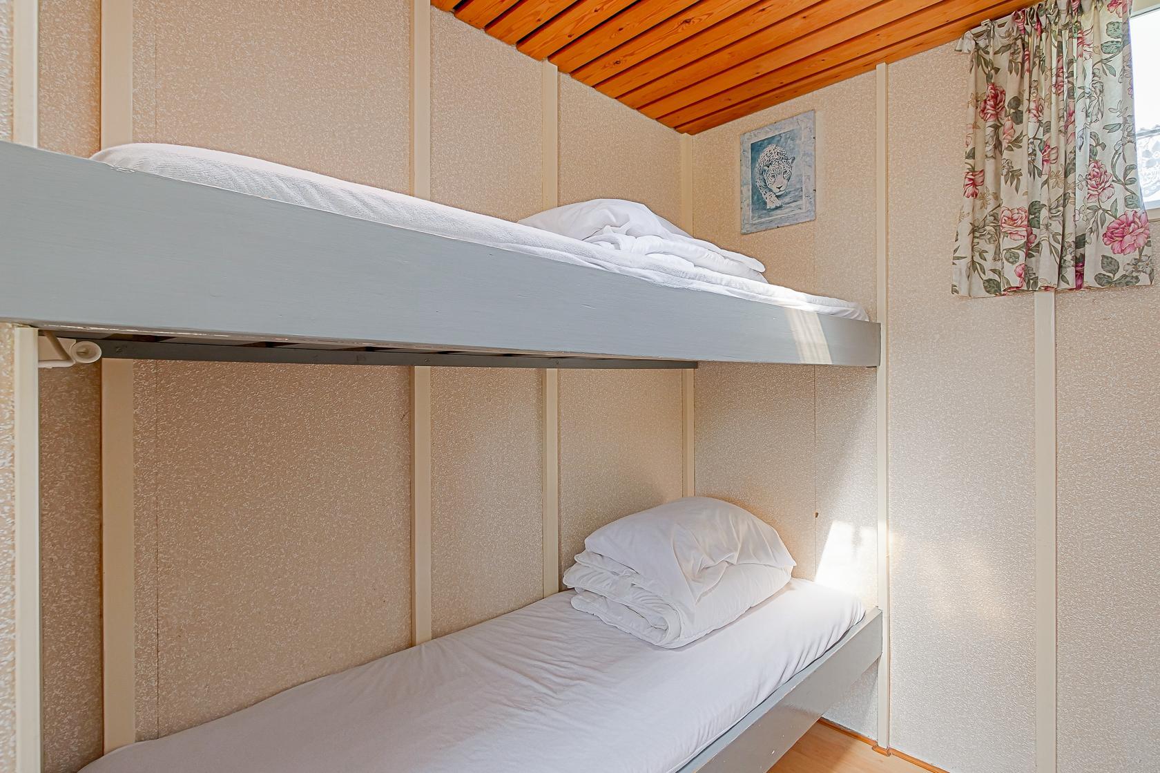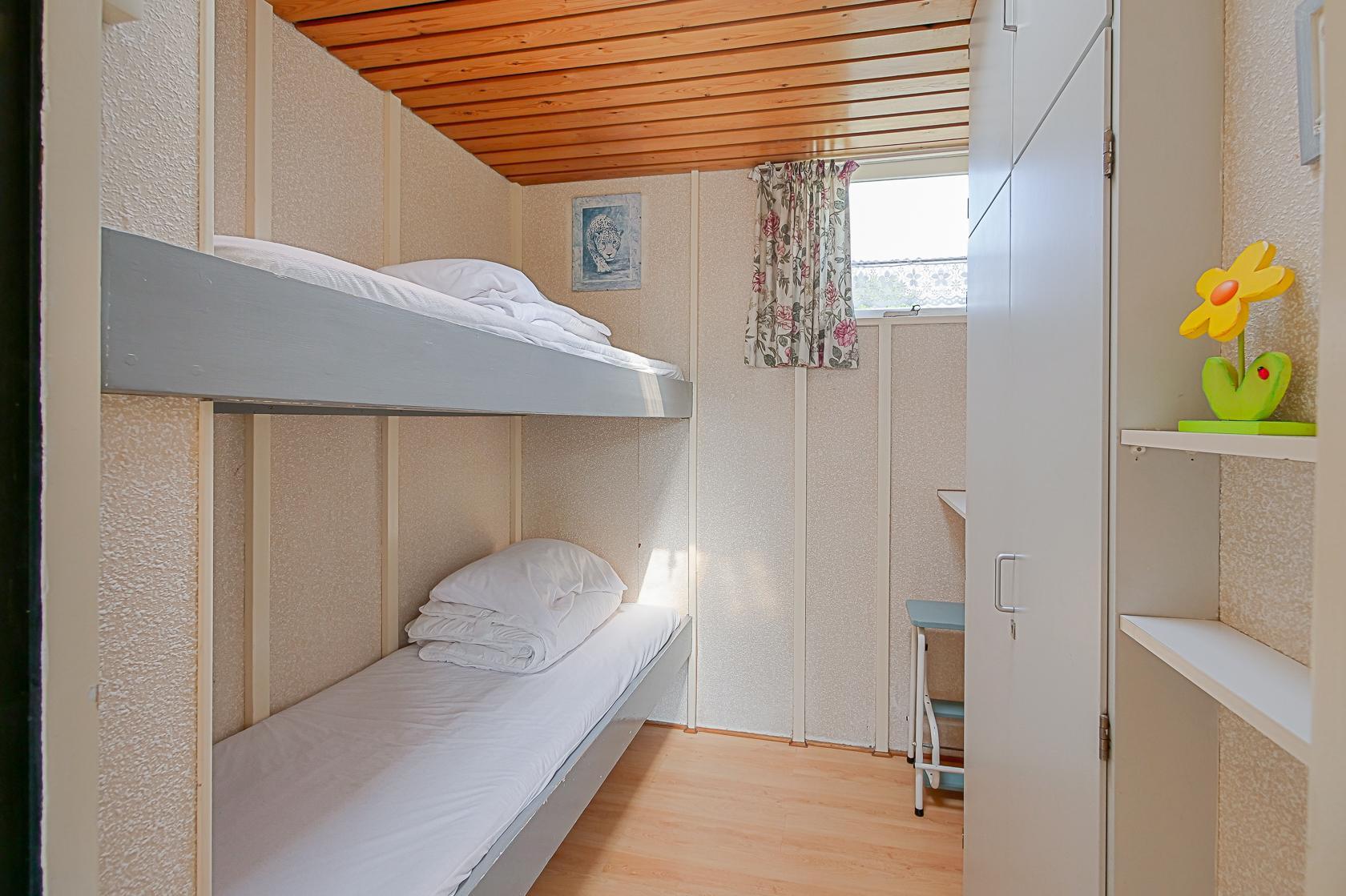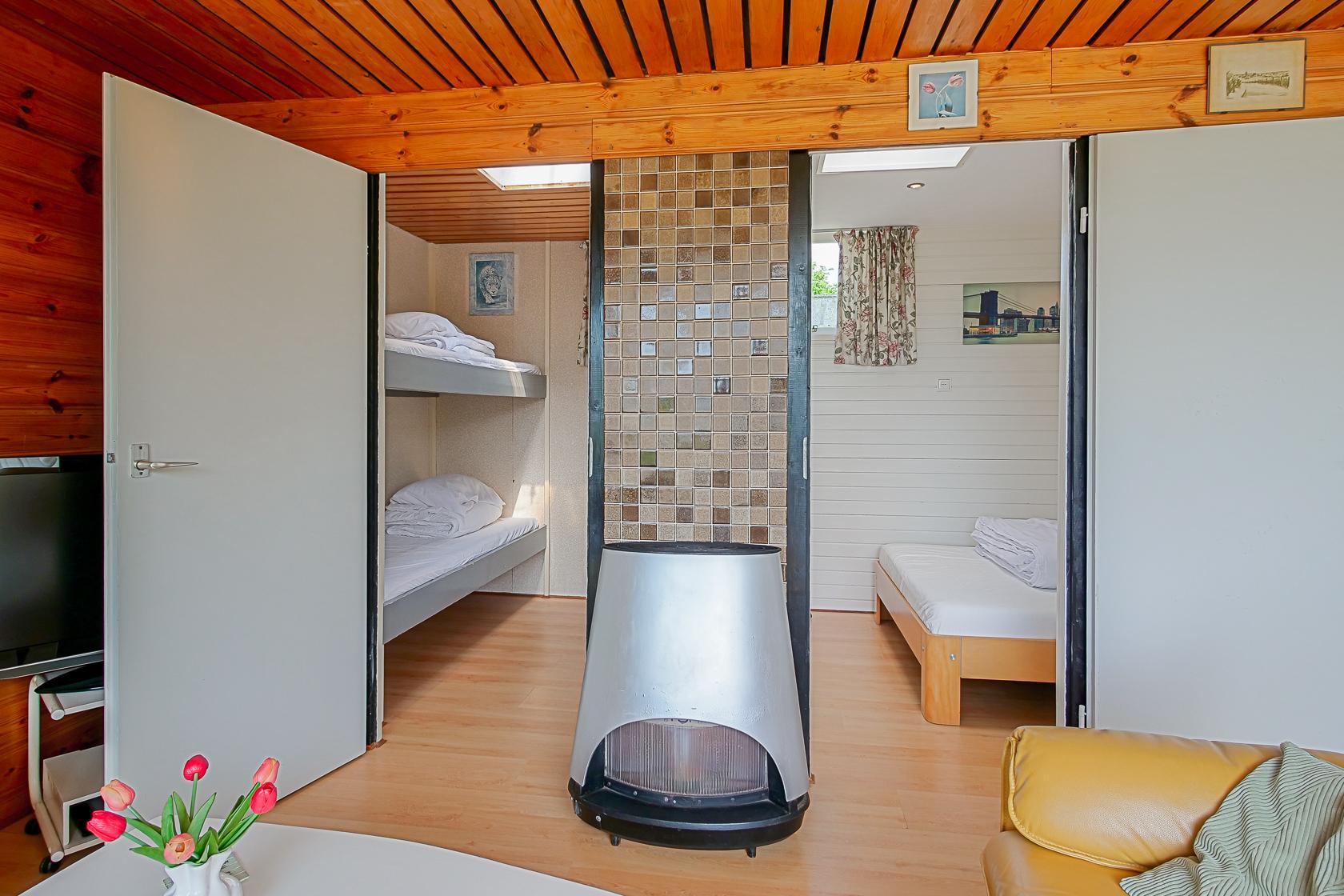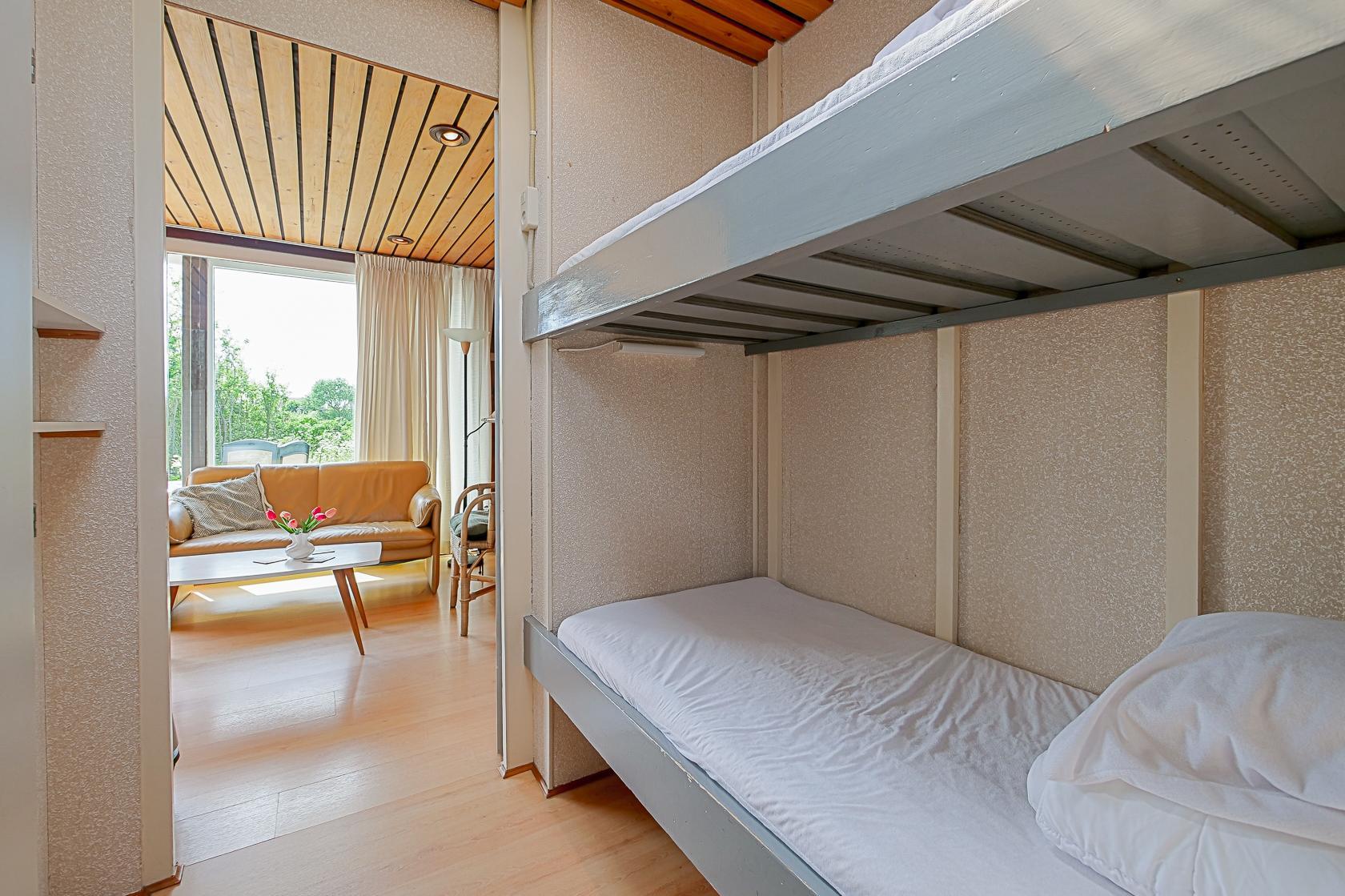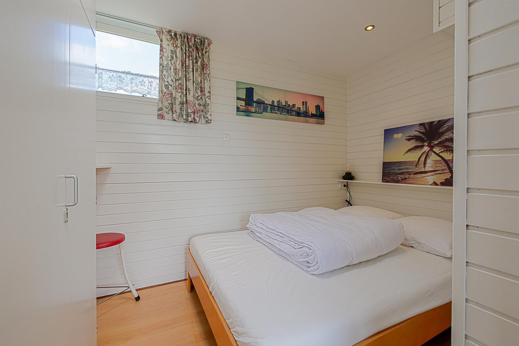 Das Haus bietet zwei Schlafzimmer: ein Schlafzimmer mit einem Doppelbett sowie ein Zimmer mit einem Etagenbett. Das Badezimmer ist mit einer Dusche und einem Waschbecken ausgestattet. Die Toilette befindet sich separat. Ein Rauchmelder ist vorhanden. Der Außenbereich umfasst eine Terrasse mit Gartenmöbeln und Sonnenschirm. Der Garten ist nicht eingezäunt. Auf dem Gelände des Parks gibt es einen kleinen Spielplatz und einen Fußballplatz.