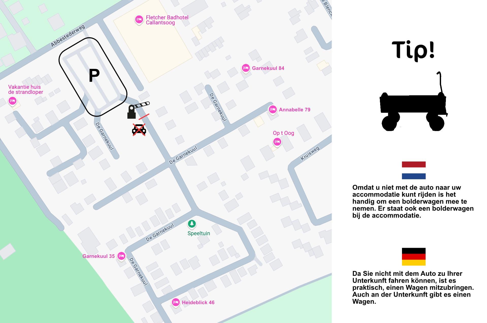 Bitte beachten Sie, dass der Ferienpark autofrei ist und die Unterkunft nicht mit dem Auto erreicht werden kann. Auch das Parken direkt an der Unterkunft ist nicht möglich, der zentrale Parkplatz am Eingang sollte genutzt werden. Am Haus steht ein Bollerwagen bereit, um Ihre Gepäck oder Einkäufe zu transportieren.