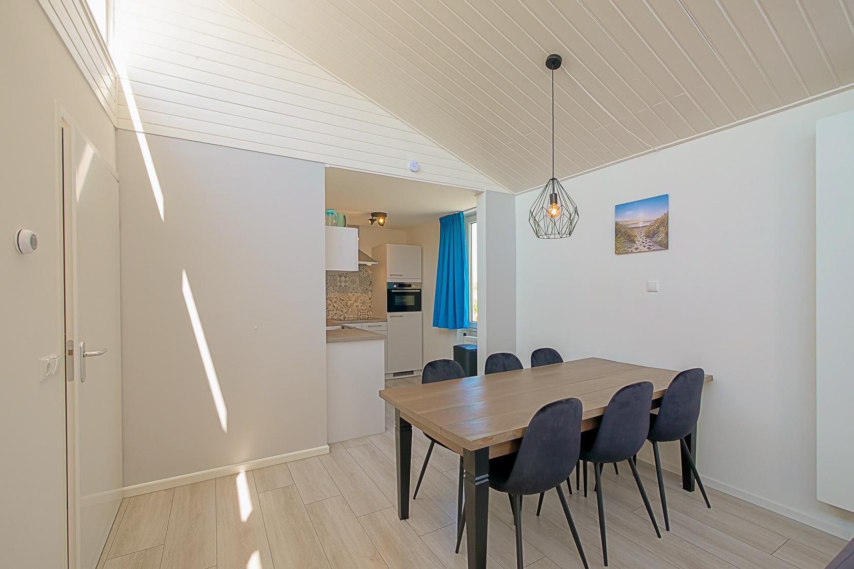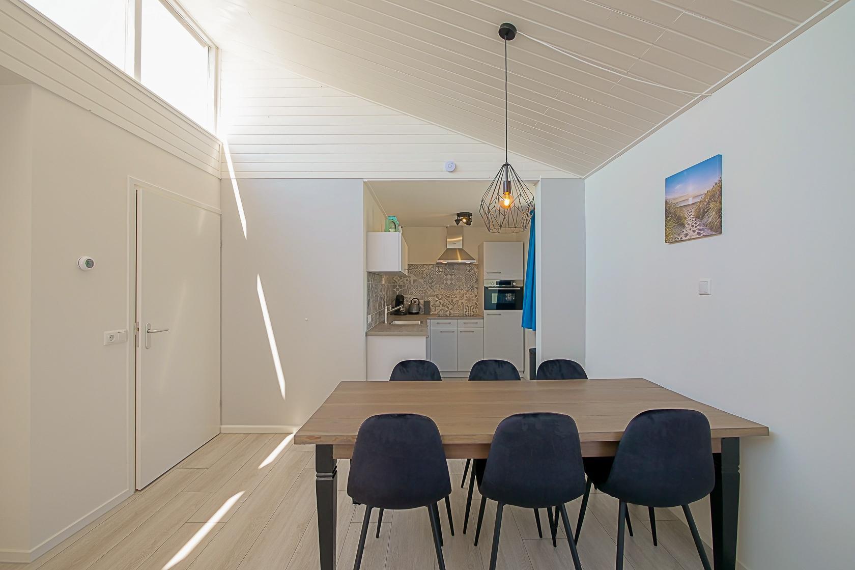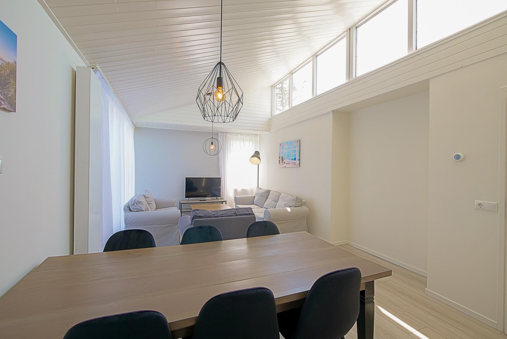 Im Inneren dieses Ferienhauses erwartet Sie ausreichend Platz für bis zu acht Personen. Der Wohnbereich ist hell eingerichtet und verfügt über große Fenster mit Blick in den Garten. Die moderne Küche ist offen gestaltet und schließt an den großzügigen Essbereich an, der Platz für gemeinsame Mahlzeiten bietet. Alle wichtigen Küchengeräte stehen zur Verfügung, darunter ein Geschirrspüler, eine Kombi-Mikrowelle, ein Kühlschrank mit Gefrierfach, ein Induktionsherd sowie Kaffeemaschine.