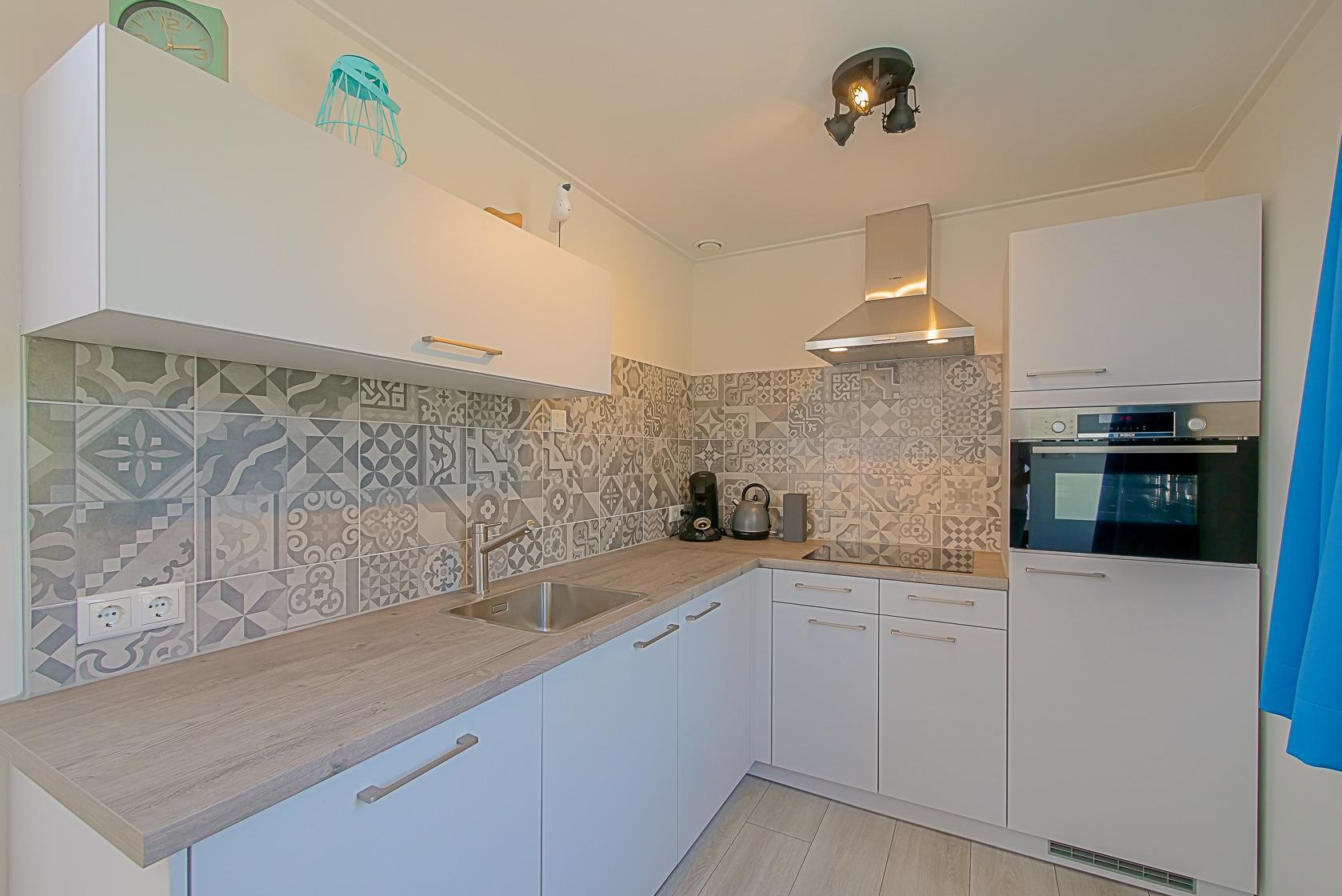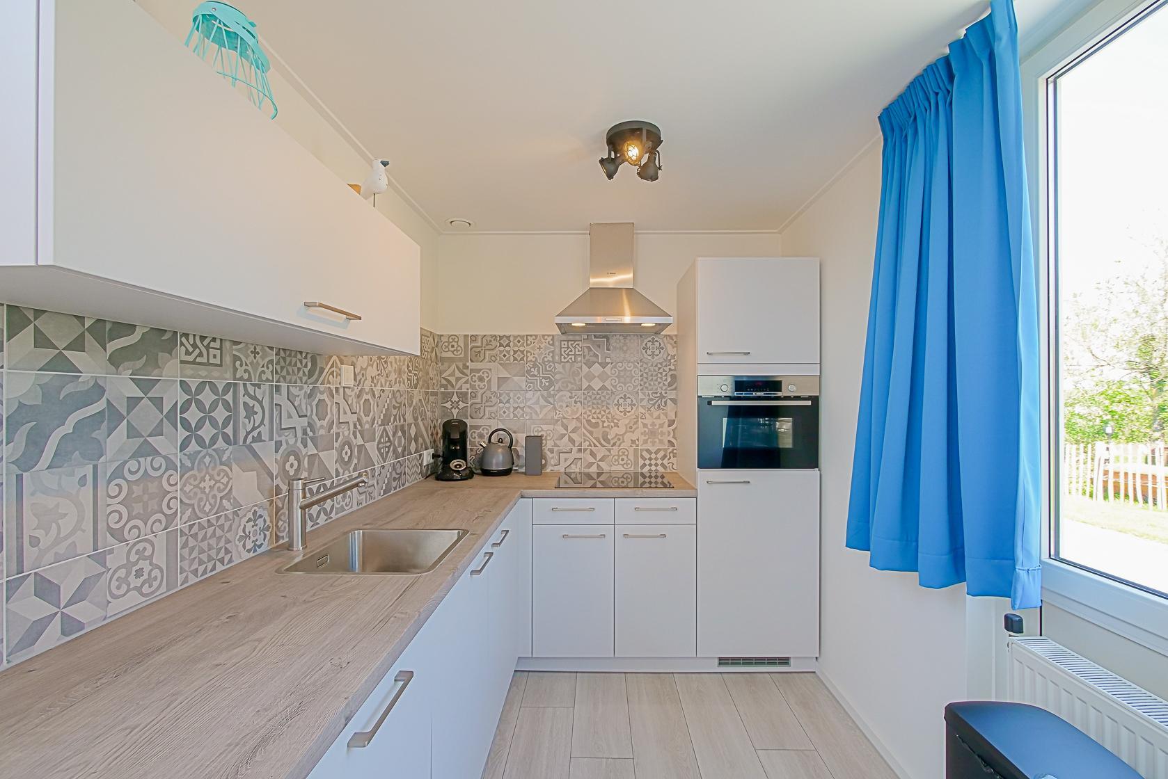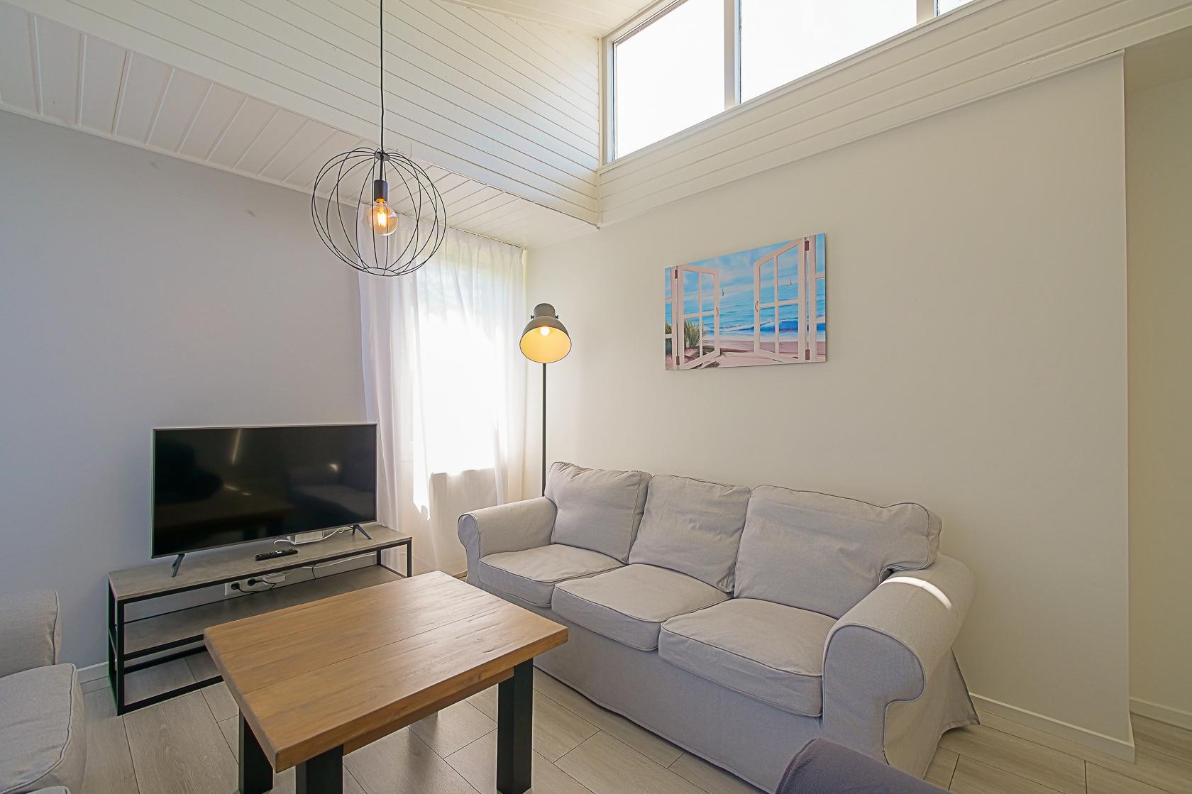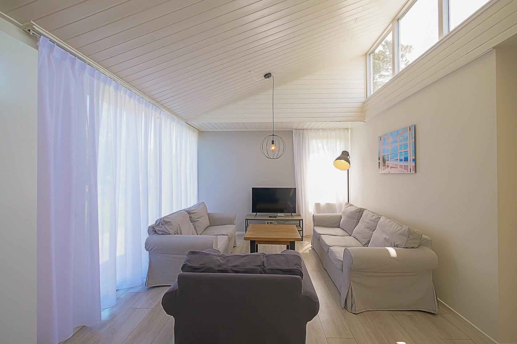 Im Inneren dieses Ferienhauses erwartet Sie ausreichend Platz für bis zu acht Personen. Der Wohnbereich ist hell eingerichtet und verfügt über große Fenster mit Blick in den Garten. Die moderne Küche ist offen gestaltet und schließt an den großzügigen Essbereich an, der Platz für gemeinsame Mahlzeiten bietet. Alle wichtigen Küchengeräte stehen zur Verfügung, darunter ein Geschirrspüler, eine Kombi-Mikrowelle, ein Kühlschrank mit Gefrierfach, ein Induktionsherd sowie Kaffeemaschine.