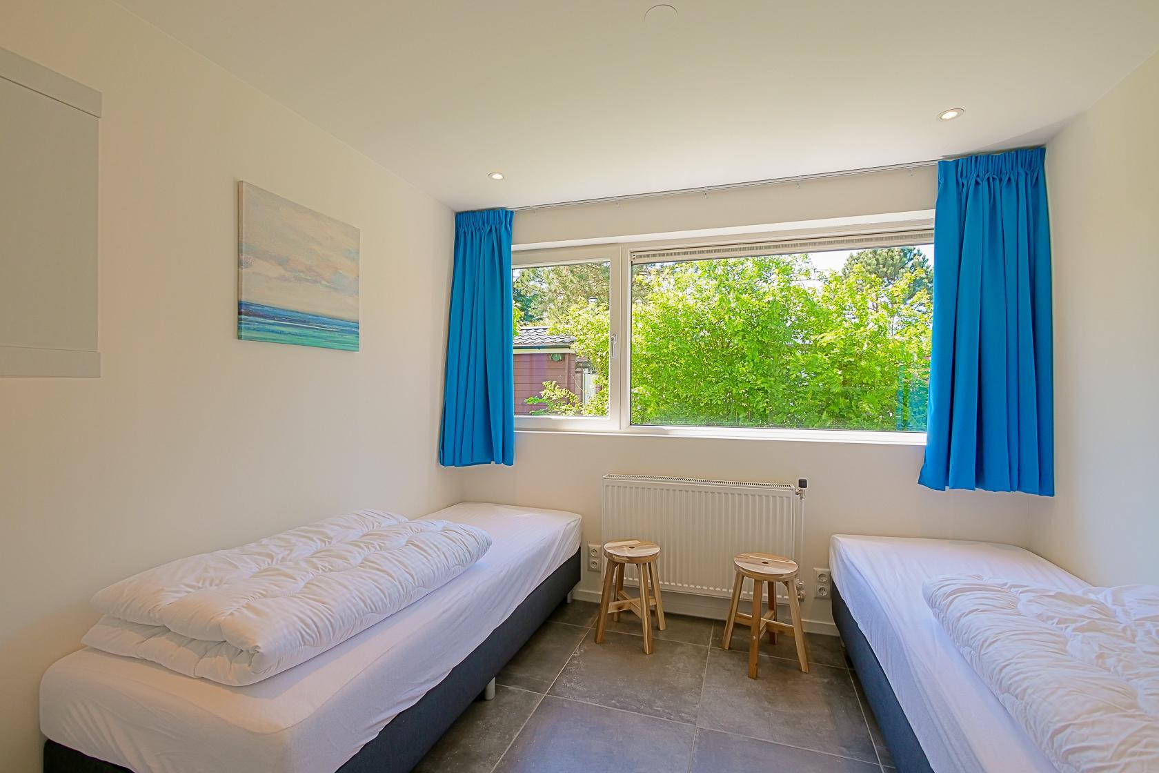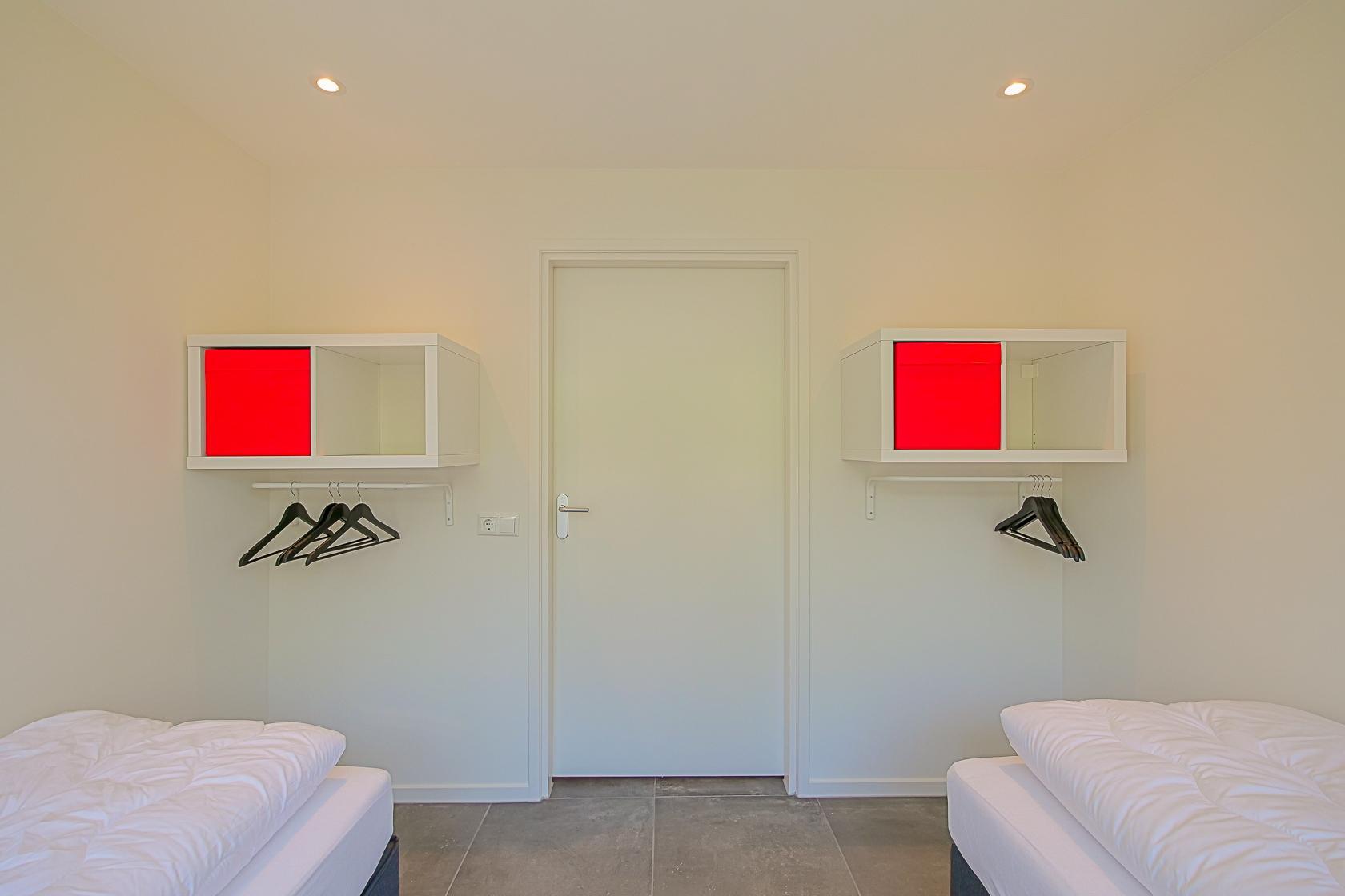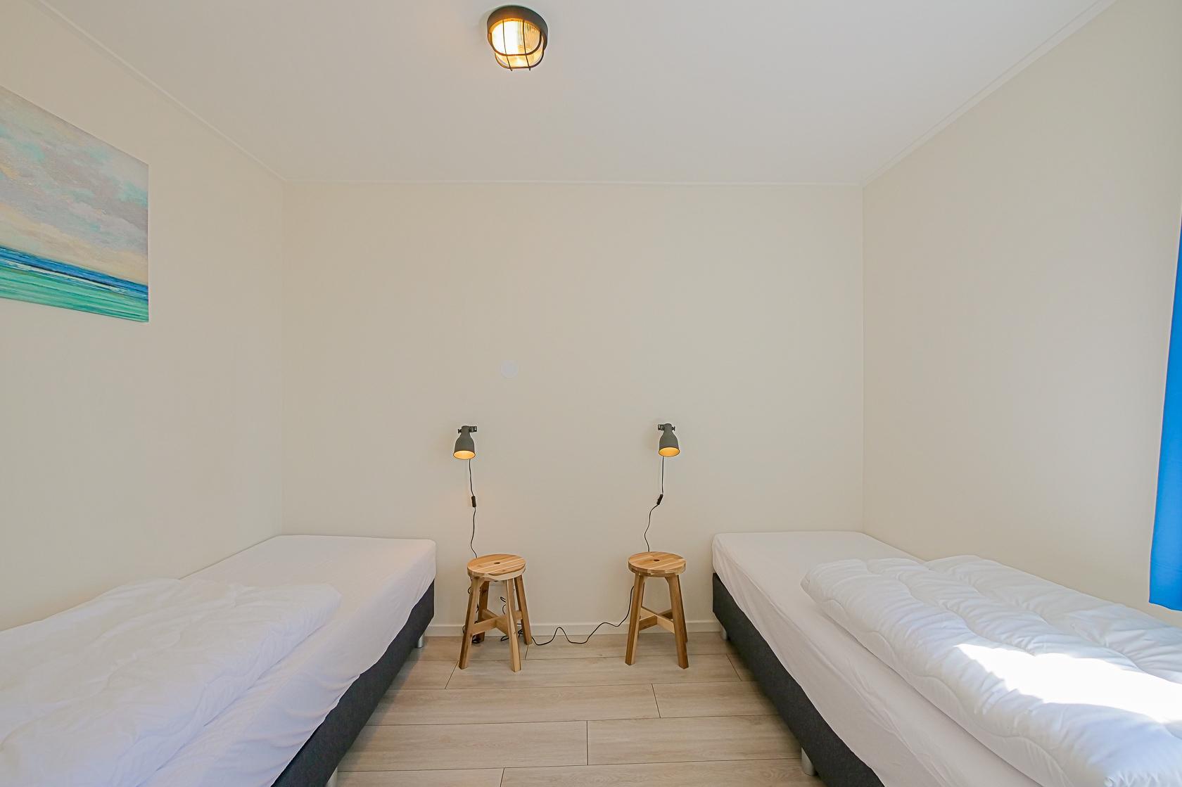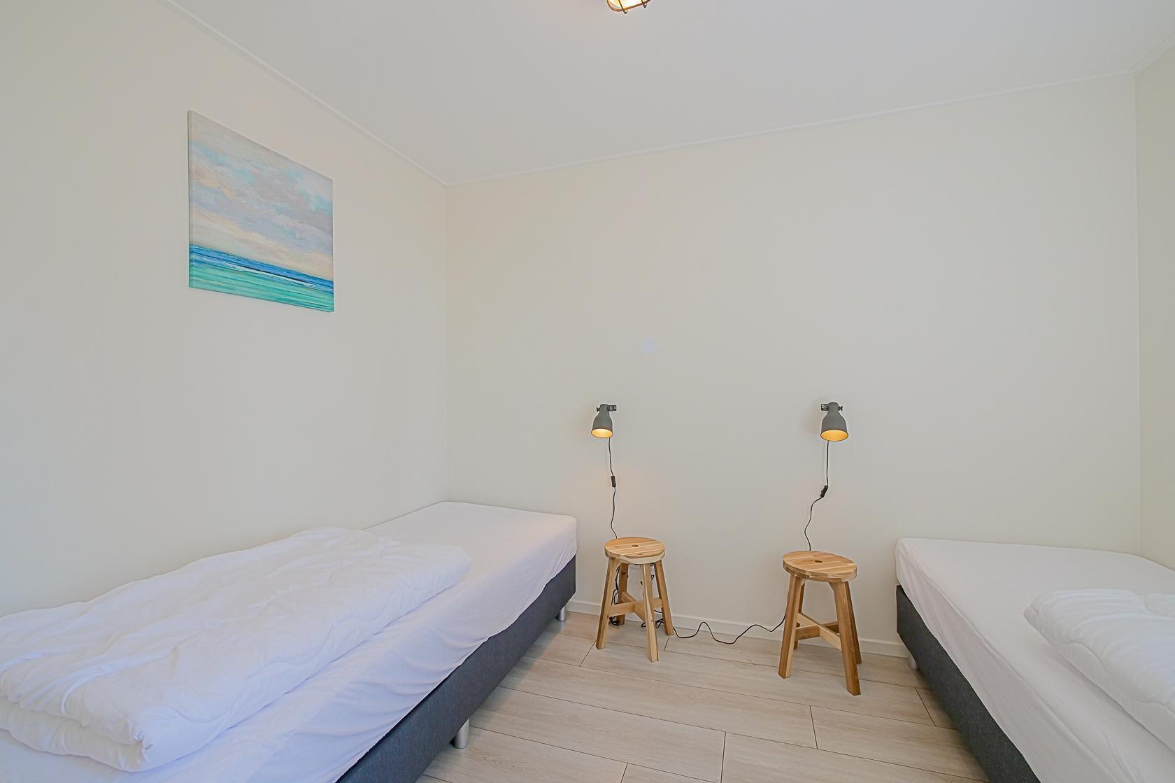 Vier Schlafzimmer stehen zur Verfügung, jeweils mit zwei Einzelbetten ausgestattet. Alle Räume bieten ausreichend Stauraum und sind geschmackvoll eingerichtet. Zwei moderne Badezimmer mit Dusche, Waschbecken und WC sorgen für Komfort. Zusätzlich gibt es ein separates WC.