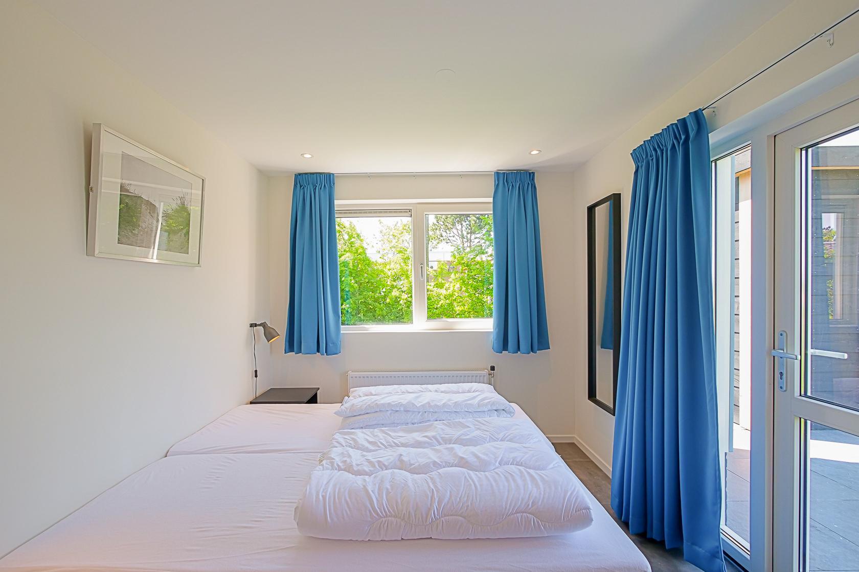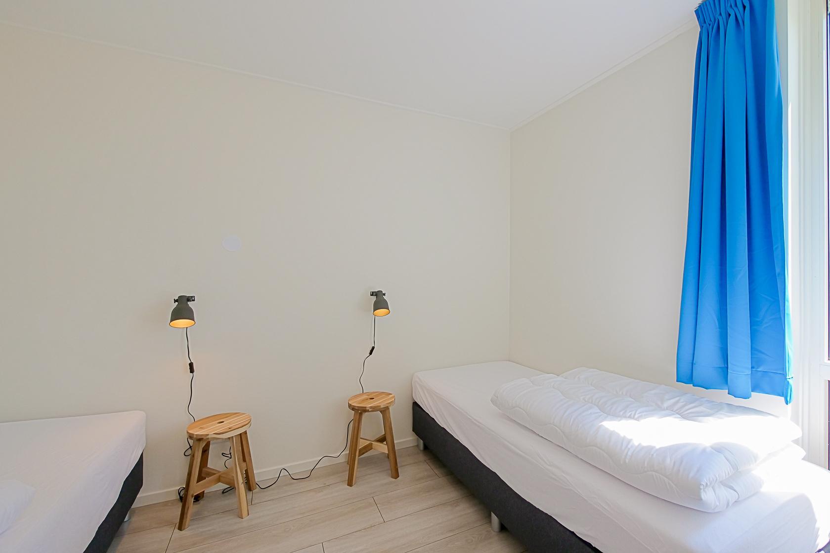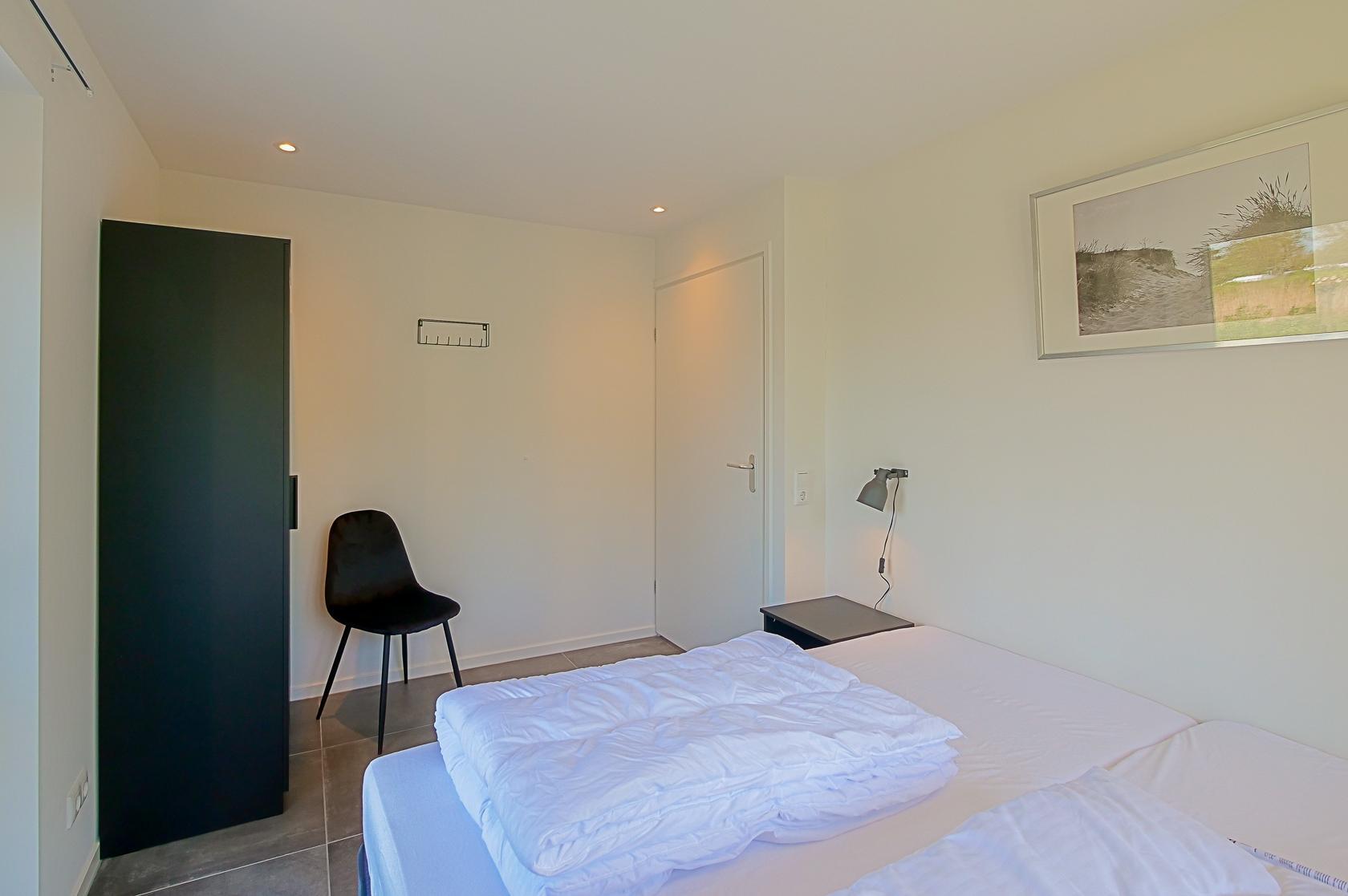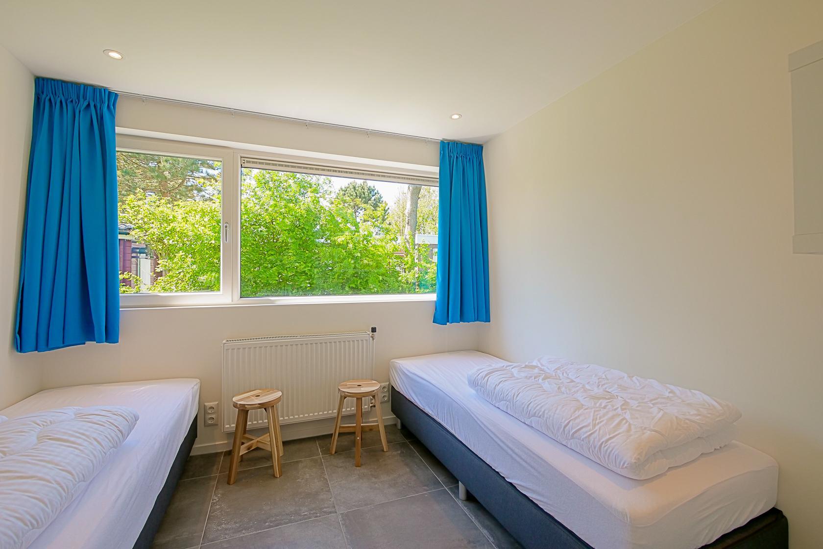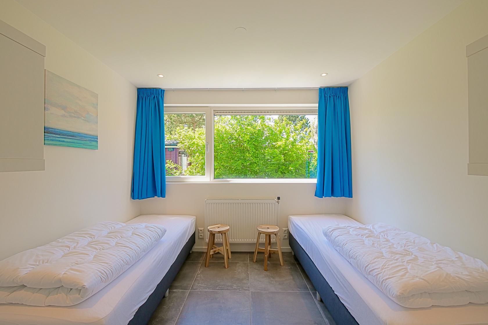 Vier Schlafzimmer stehen zur Verfügung, jeweils mit zwei Einzelbetten ausgestattet. Alle Räume bieten ausreichend Stauraum und sind geschmackvoll eingerichtet. Zwei moderne Badezimmer mit Dusche, Waschbecken und WC sorgen für Komfort. Zusätzlich gibt es ein separates WC.