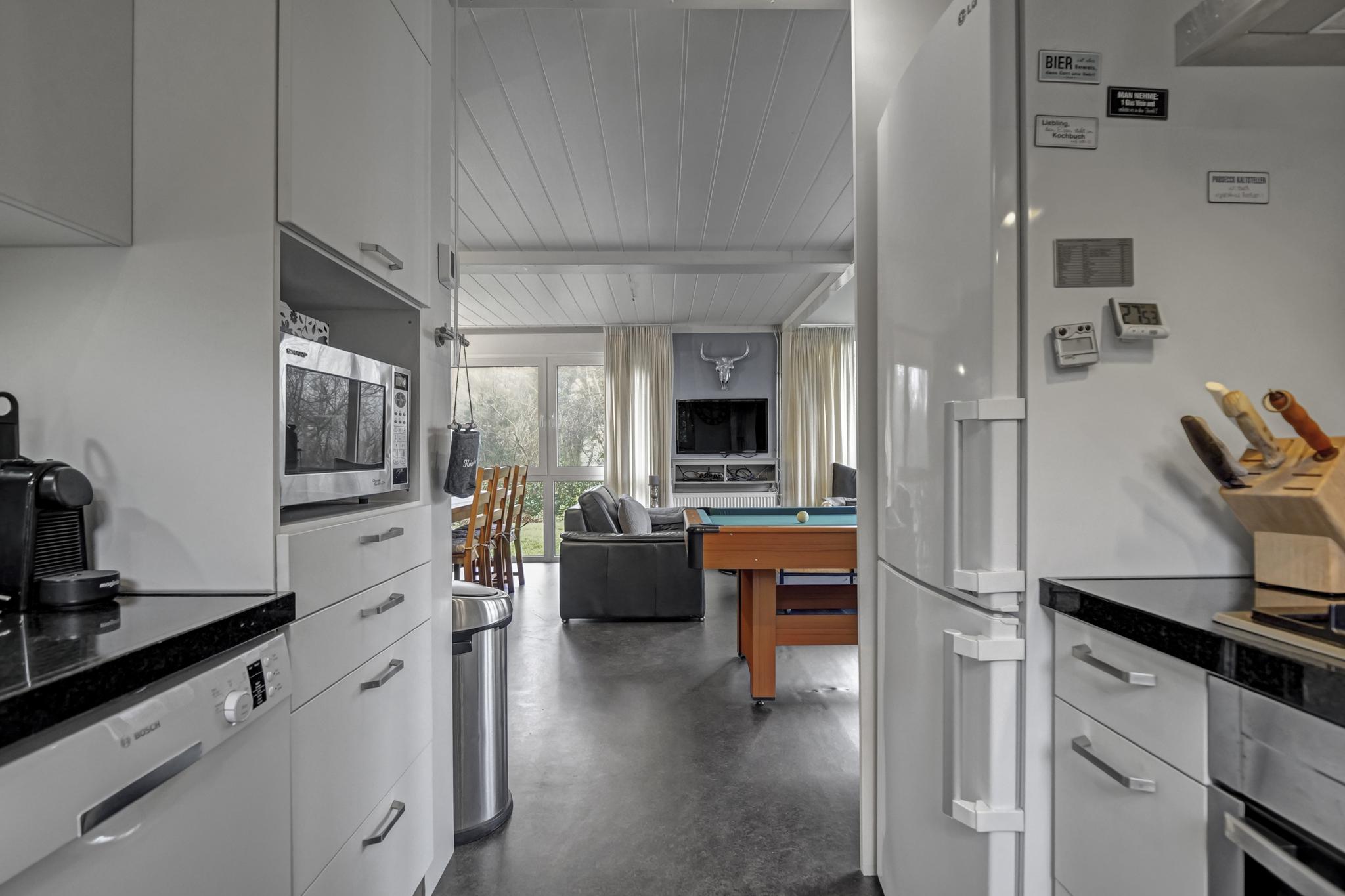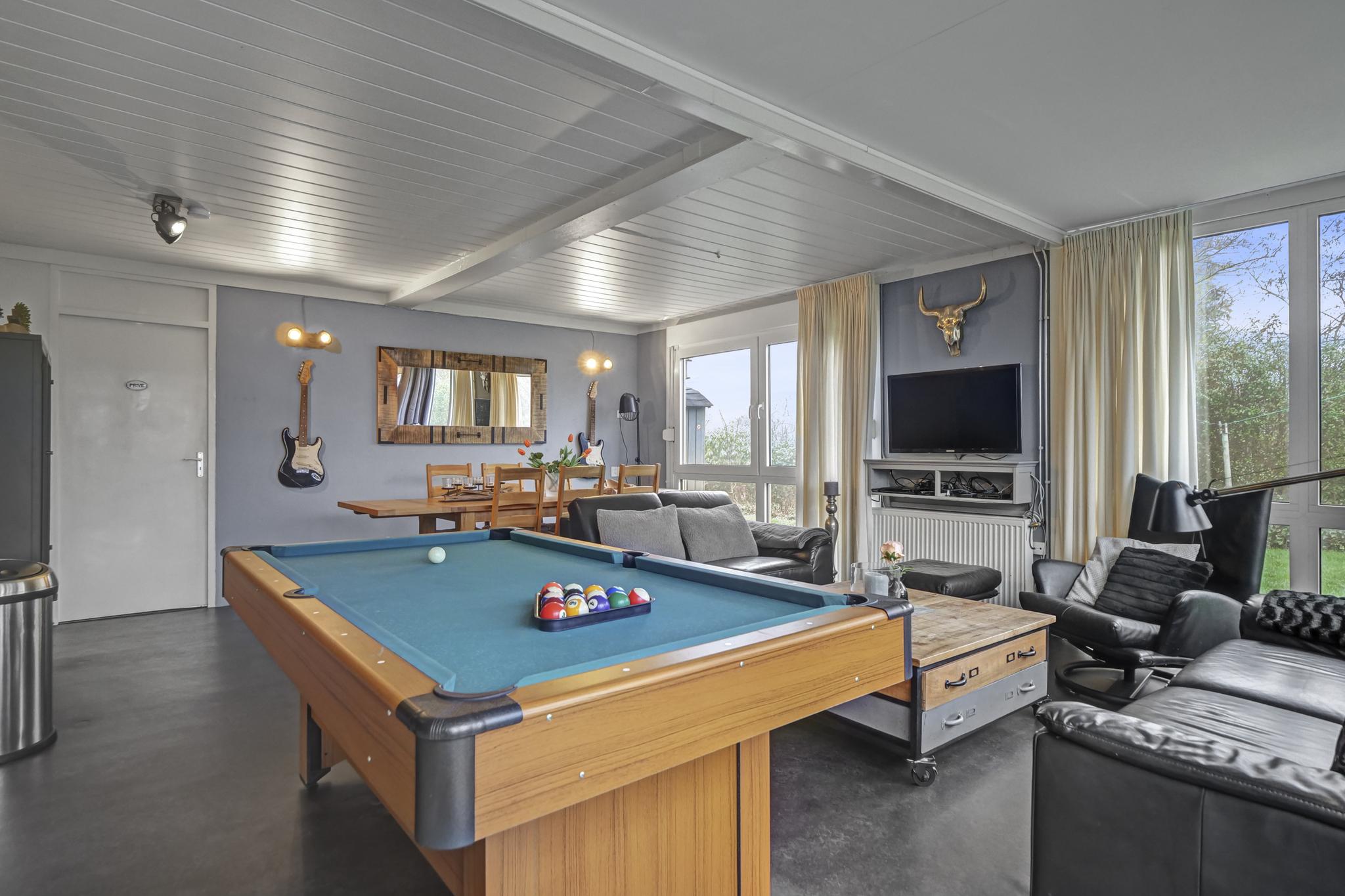 Im Erdgeschoss des Ferienhauses befindet sich ein großes Wohnzimmer mit bequemer Sitzecke, Billardtisch und Blick in den Garten. Hier können Sie gemeinsam entspannen, spielen oder den Abend in Ruhe ausklingen lassen. Der große Esstisch lädt zu ausgedehnten Mahlzeiten und gemütlichen Spieleabenden ein. Die offene Küche ist mit Geschirrspüler, Backofen, Mikrowelle, Gefrierschrank, 5-Flammen-Gasherd, Kaffeemaschine und Toaster ausgestattet. Ein separates WC mit Waschbecken liegt ebenfalls im Erdgeschoss.
