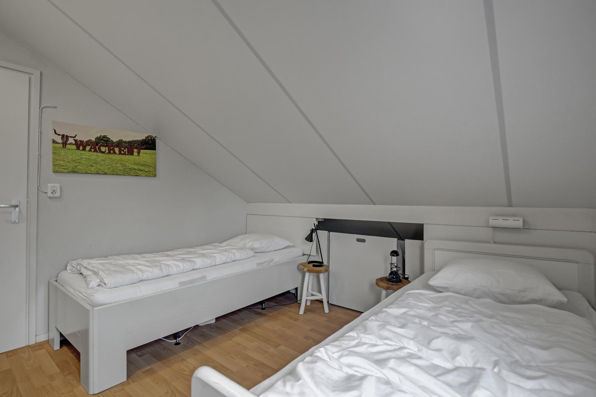 Im Obergeschoss stehen drei Schlafzimmer zur Verfügung: ein Schlafzimmer mit Doppelbett sowie zwei weitere Zimmer mit jeweils zwei Einzelbetten. Alle Zimmer sind mit Kleiderschränken ausgestattet und bieten ausreichend Stauraum. Das moderne Badezimmer im Obergeschoss verfügt über Dusche, Waschbecken und ein zweites WC. Auch Waschmaschine, Trockner, WLAN, Zentralheizung und Flachbildfernseher gehören zur Ausstattung des Hauses.
