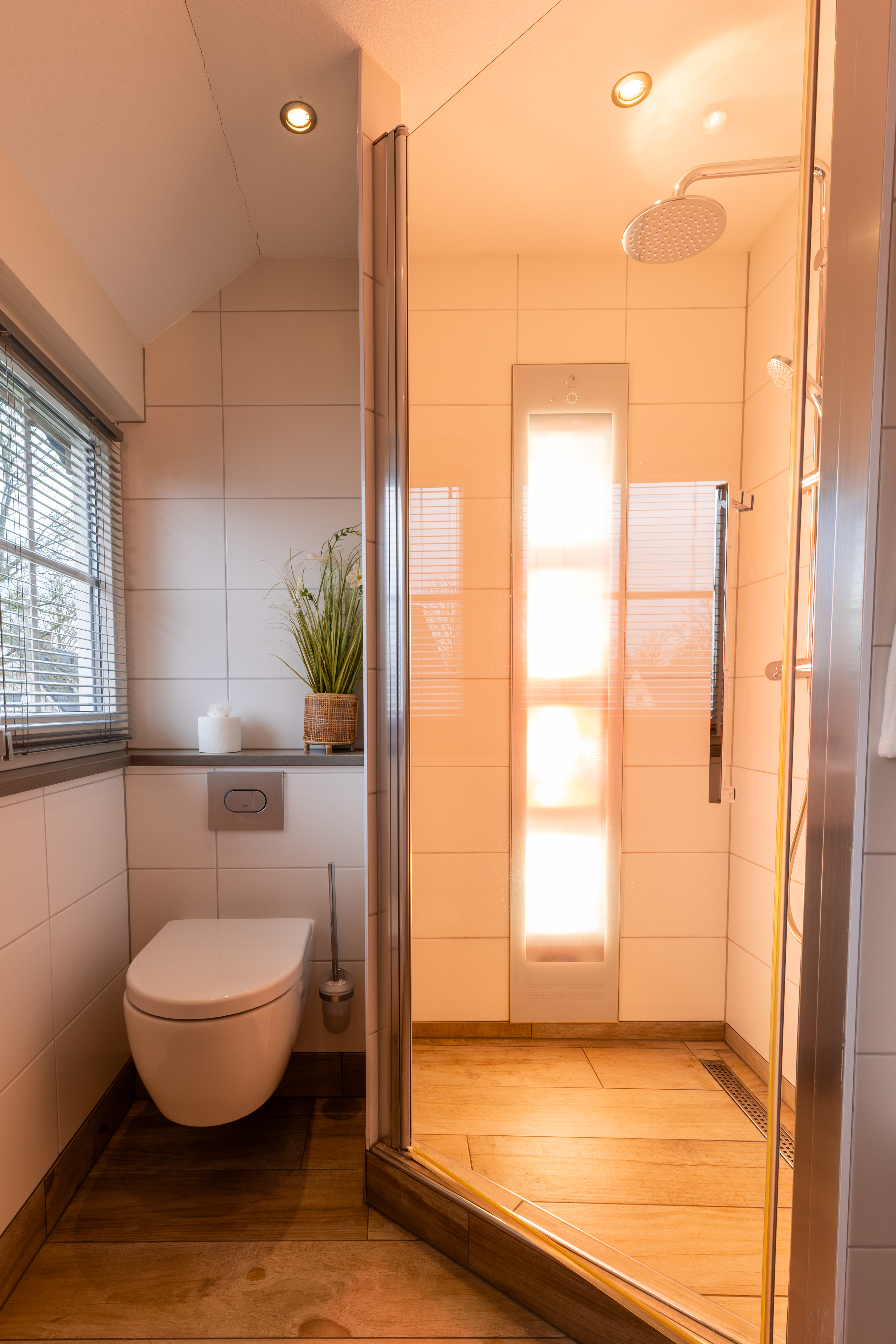 Im ersten Obergeschoss befinden sich zwei Schlafzimmer. Zusätzlich gibt es ein zweites Badezimmer mit Waschbecken, WC und Duschkabine, ausgestattet mit einer Sunshower für einen besonders entspannenden und sonnigen Moment.