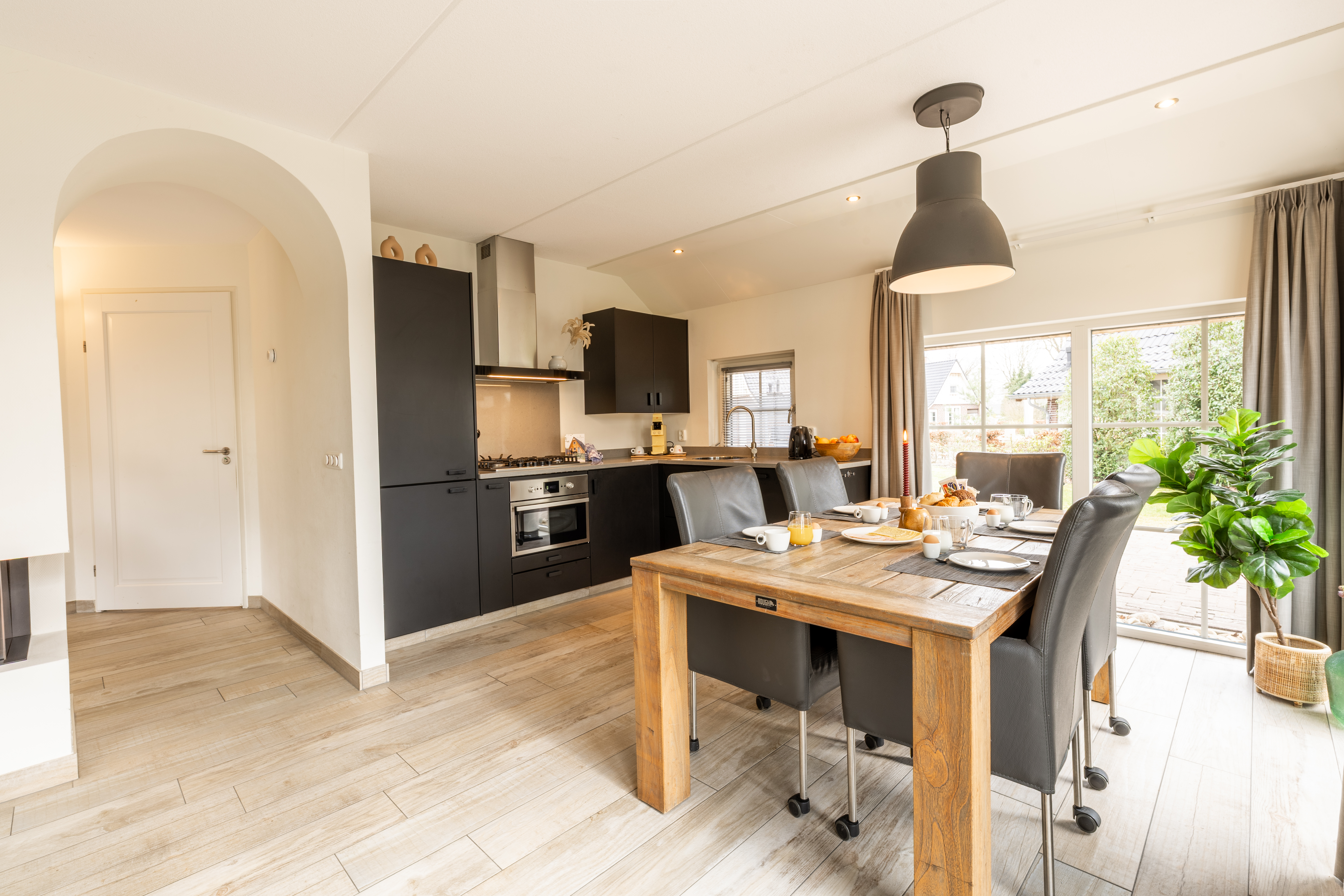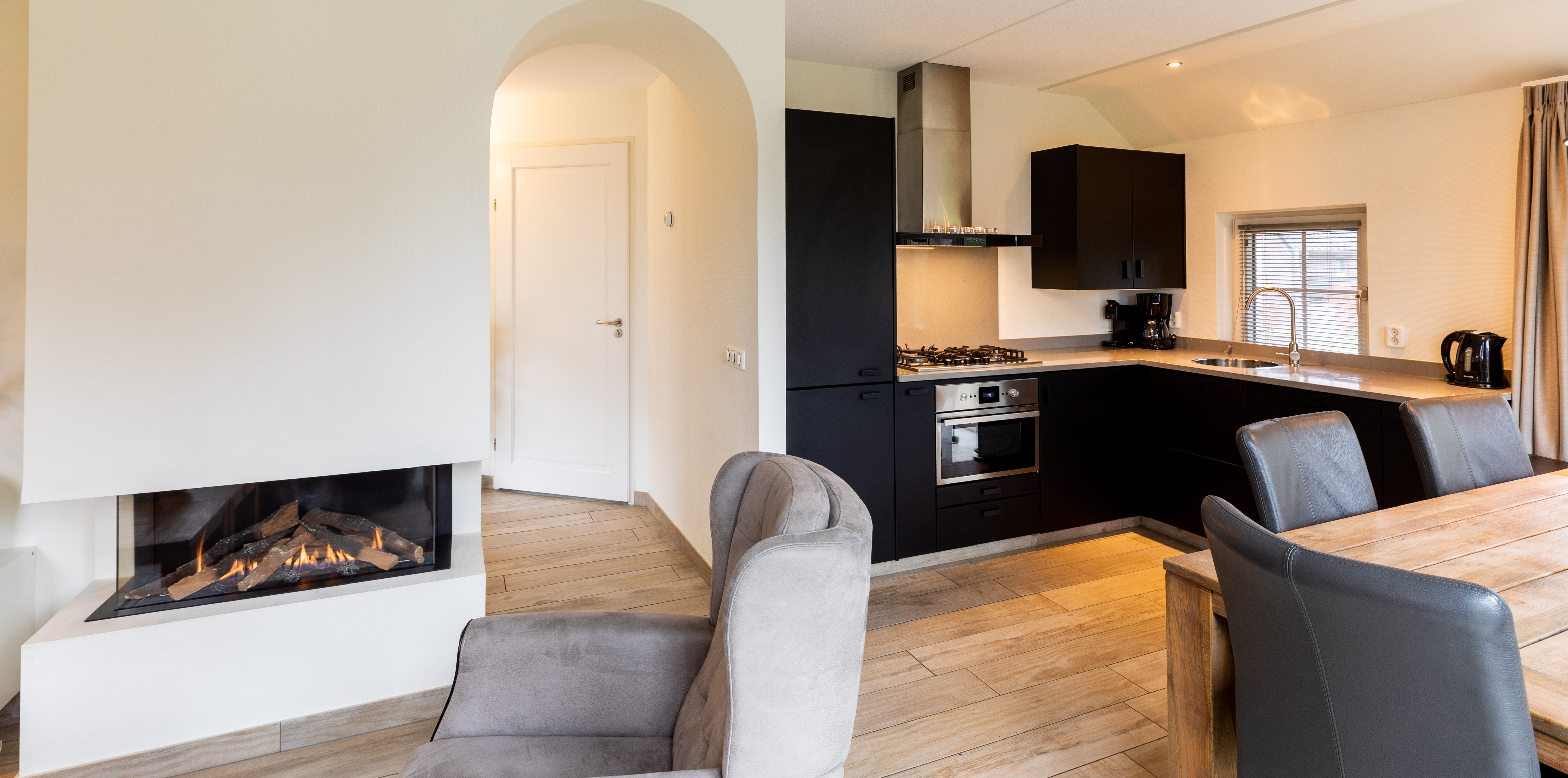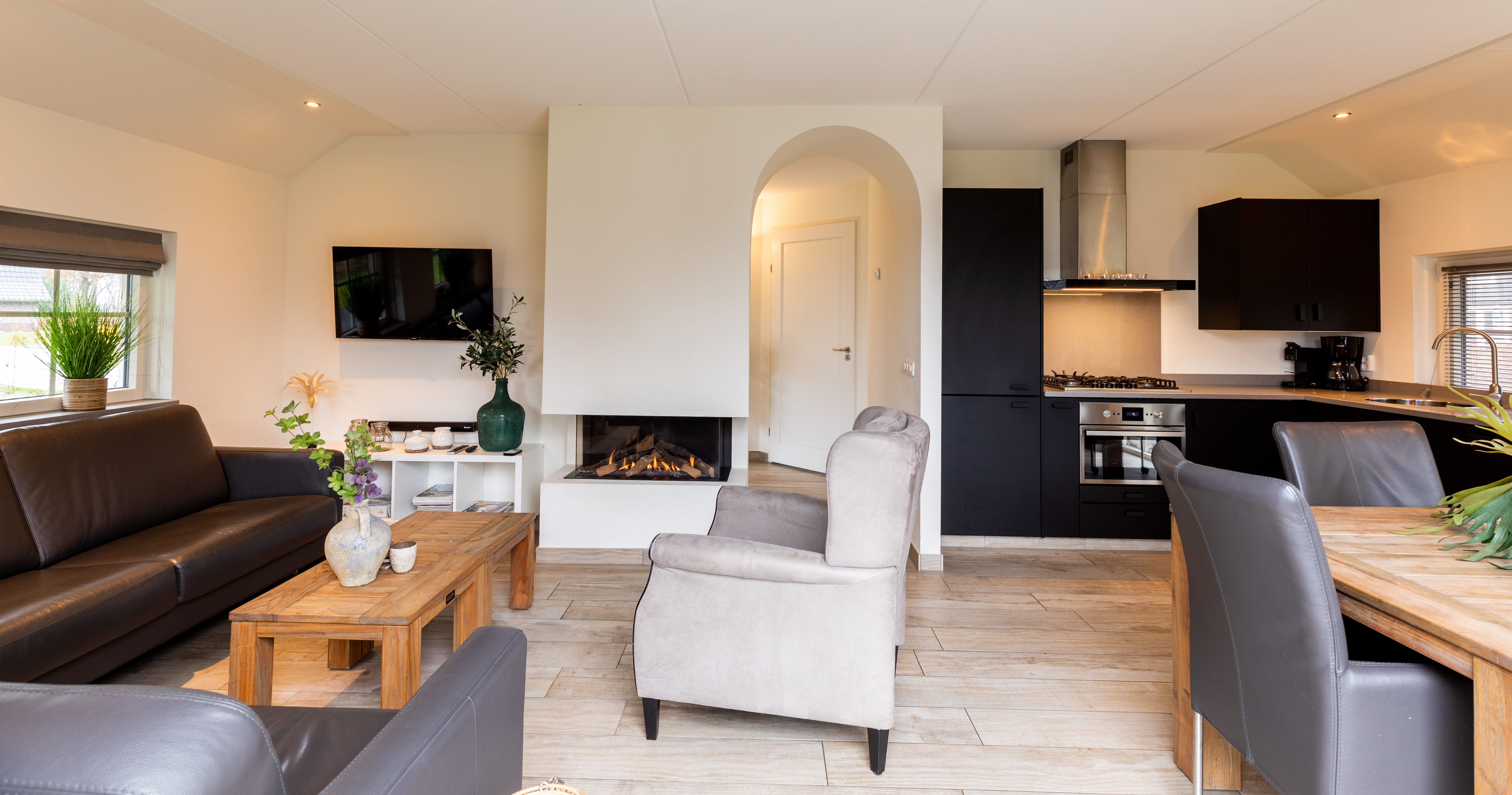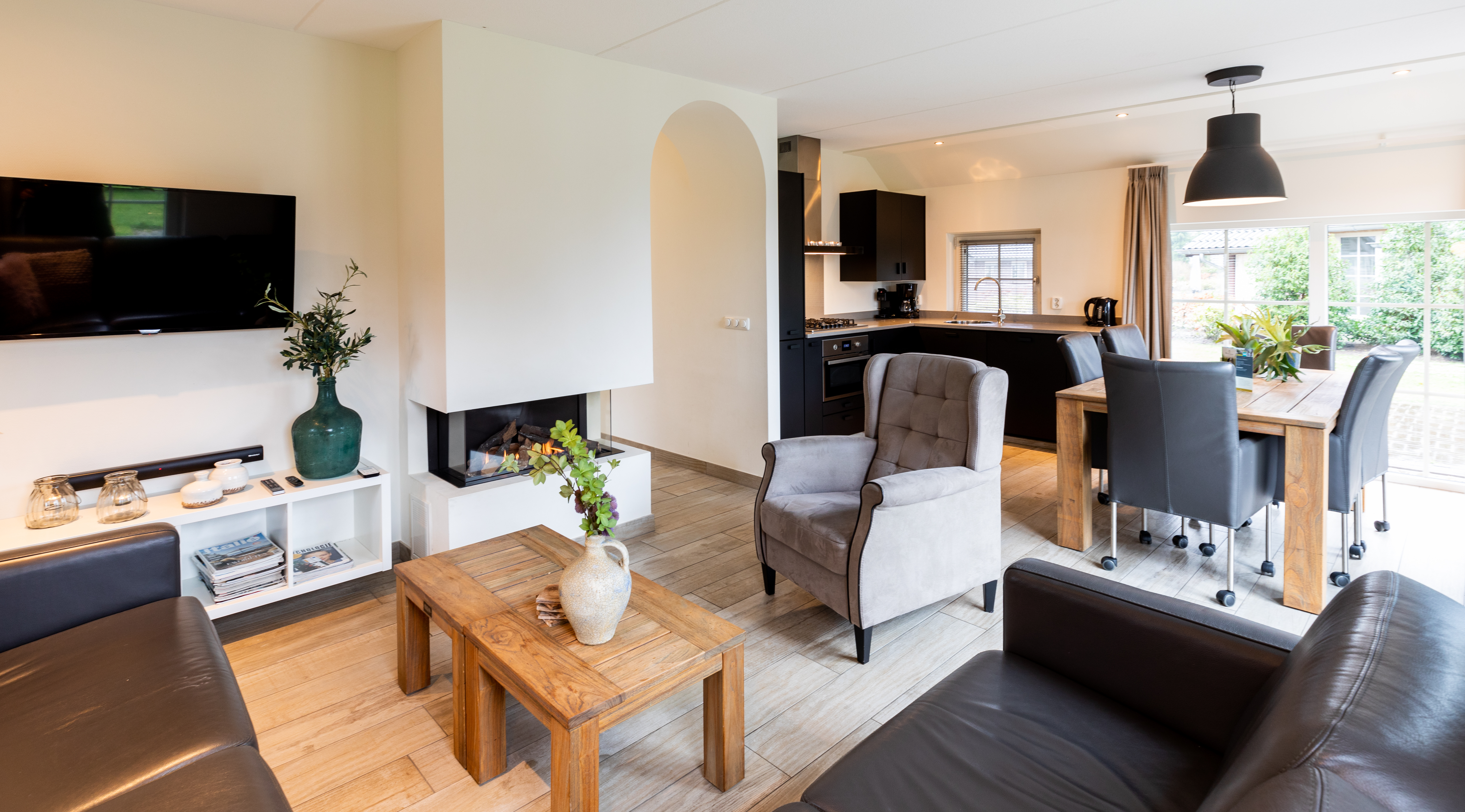 Das Erdgeschoss bildet das Herz des Hauses. Das stimmungsvolle Wohnzimmer ist komfortabel mit einer großzügigen Sitzecke, Smart-TV und Kamin eingerichtet, perfekt für gemütliche Abende zusammen. Große Fenster sorgen für viel Tageslicht und einen herrlichen Blick ins Grüne. Die offene Küche ist vollständig mit modernen Einbaugeräten ausgestattet, darunter ein 5-Flammen-Kochfeld mit Wokbrenner und ein Kombi-Backofen – alles, um ausgiebig zu kochen und gemeinsam zu genießen. Durch die Flügeltüren gelangen Sie auf die Terrasse mit Gartenmöbeln, wo das Leben im Freien in vollen Zügen genossen werden kann.