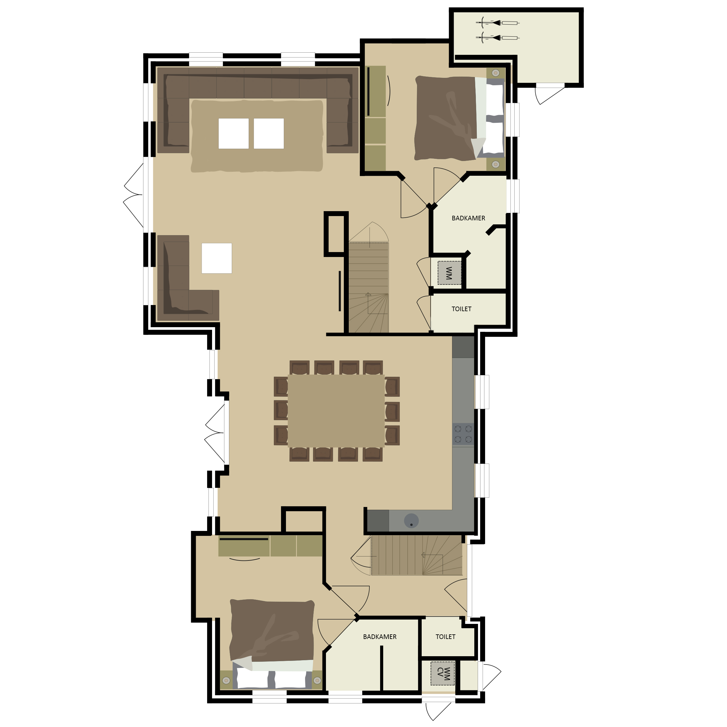 Im Erdgeschoss befinden sich zwei komfortable Schlafzimmer mit jeweils eigenem Bad en suite. Diese Zimmer bieten einen angenehmen Rückzugsort mit viel Privatsphäre und Komfort. Zusätzlich gibt es im Erdgeschoss zwei Toiletten: eine im Badezimmer und eine separate.