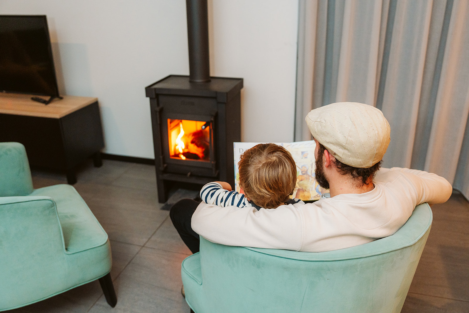 Flachbildschirm-Fernseher HolzkaminEsstischSofaTerrasse