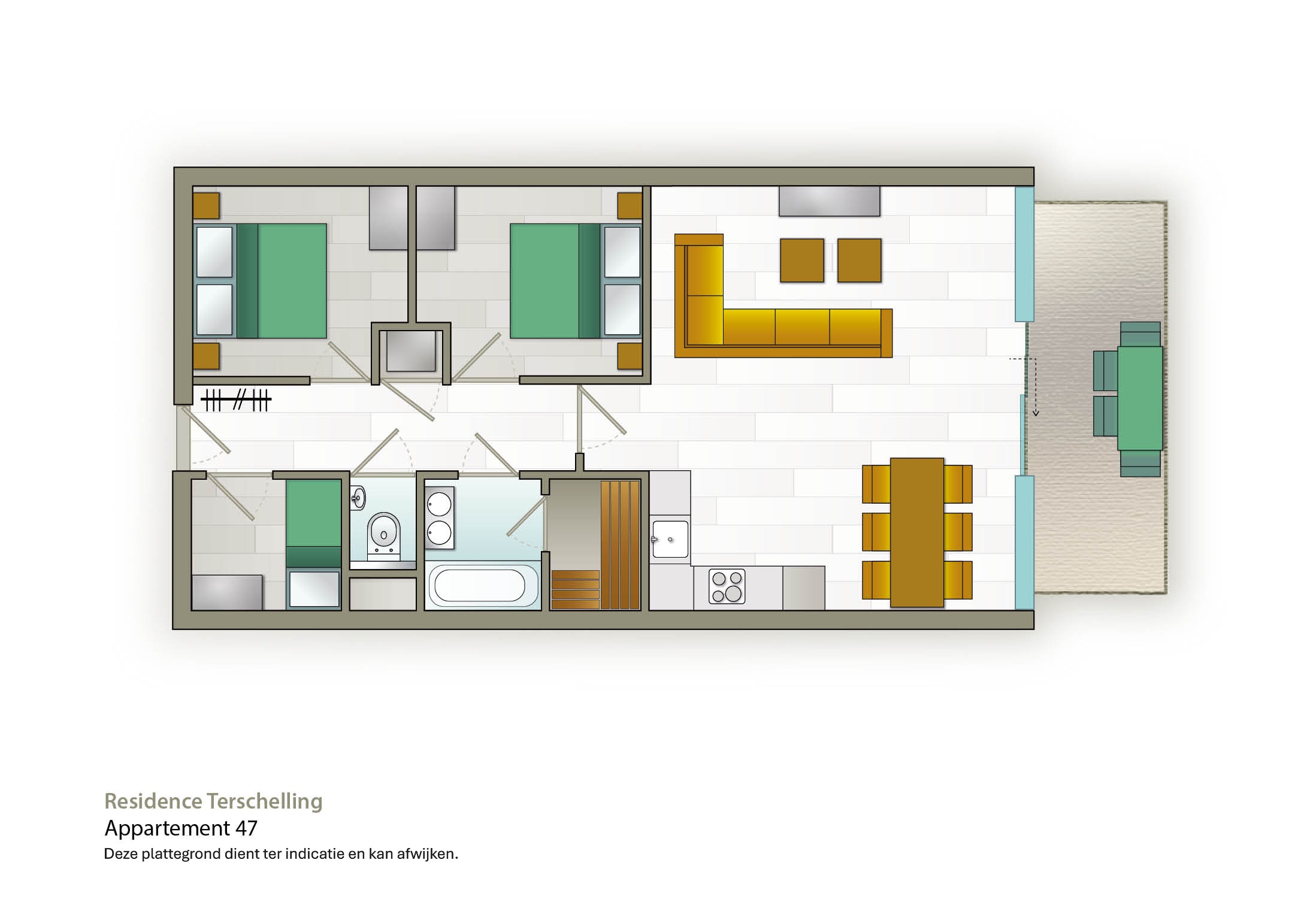 Die Wellness-Apartments für 5 Personen sind sehr modern eingerichtet und haben eine Größe von ca. 90 m². Diese Wellness-Apartments verfügen über zwei Schlafzimmer mit je zwei Einzel-Boxspringbetten und ein Schlafzimmer mit einem Einzel-Boxspringbett. Die geräumigen Wohnungen sind mit einem modischen Wohnzimmer mit luxuriösem Smart-TV ausgestattet. Es gibt auch ein geräumiges Badezimmer, in dem Sie die Dusche, Badewanne und Privatsauna genießen können. Sie erhalten einen Bademantel (pro Erwachsenen) und ein Handtuch-Set (bestehend aus einem großen und einem kleinen Handtuch) pro Person, sowie ein Wellness-Set pro Wohnung. Die Wellness-Apartments sind ideal, um einen schönen Urlaub mit der ganzen Familie zu verbringen.
