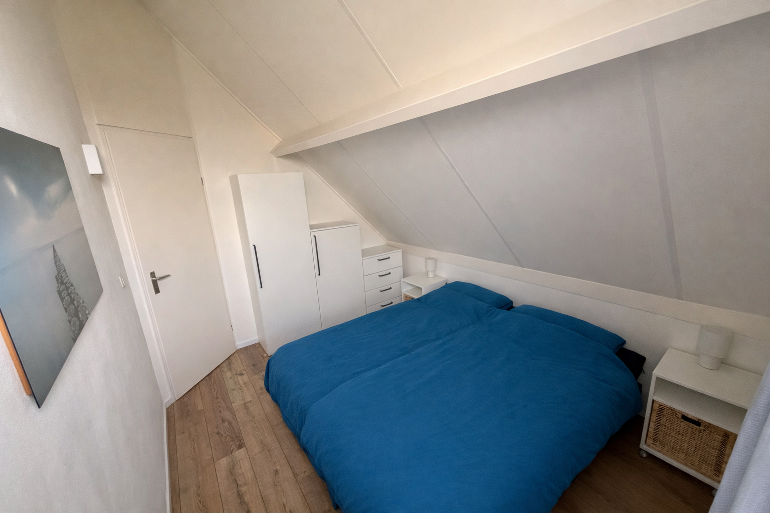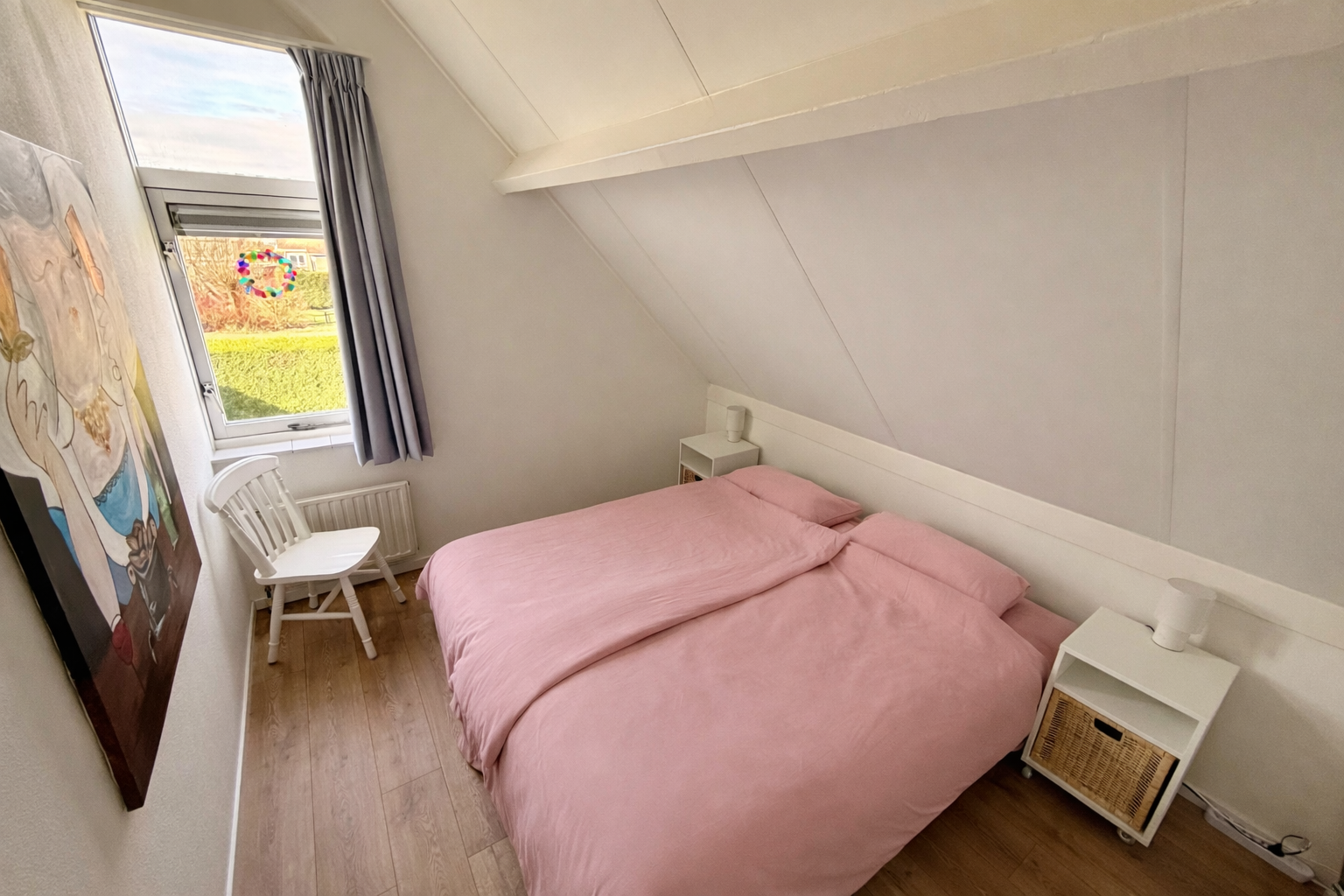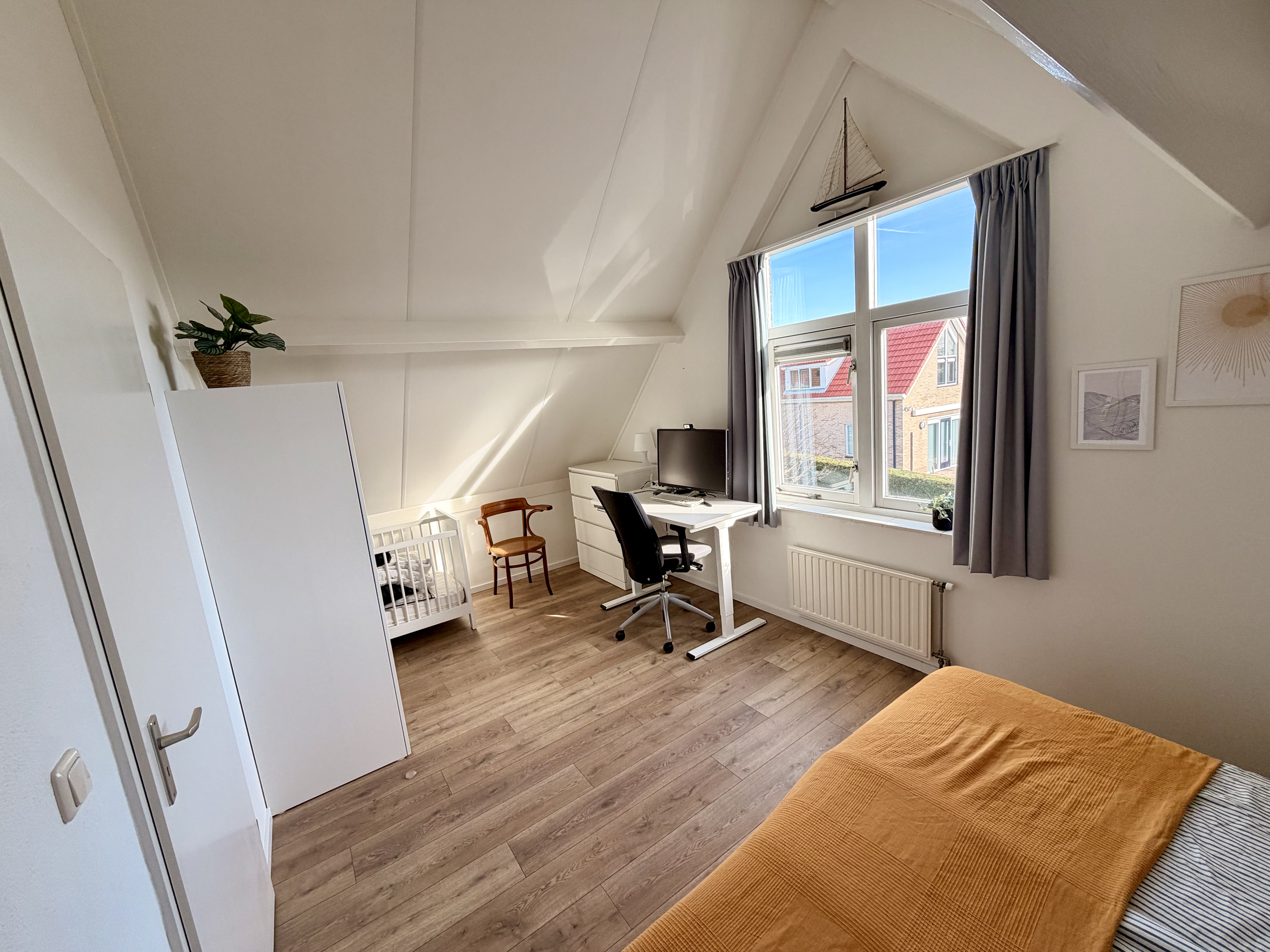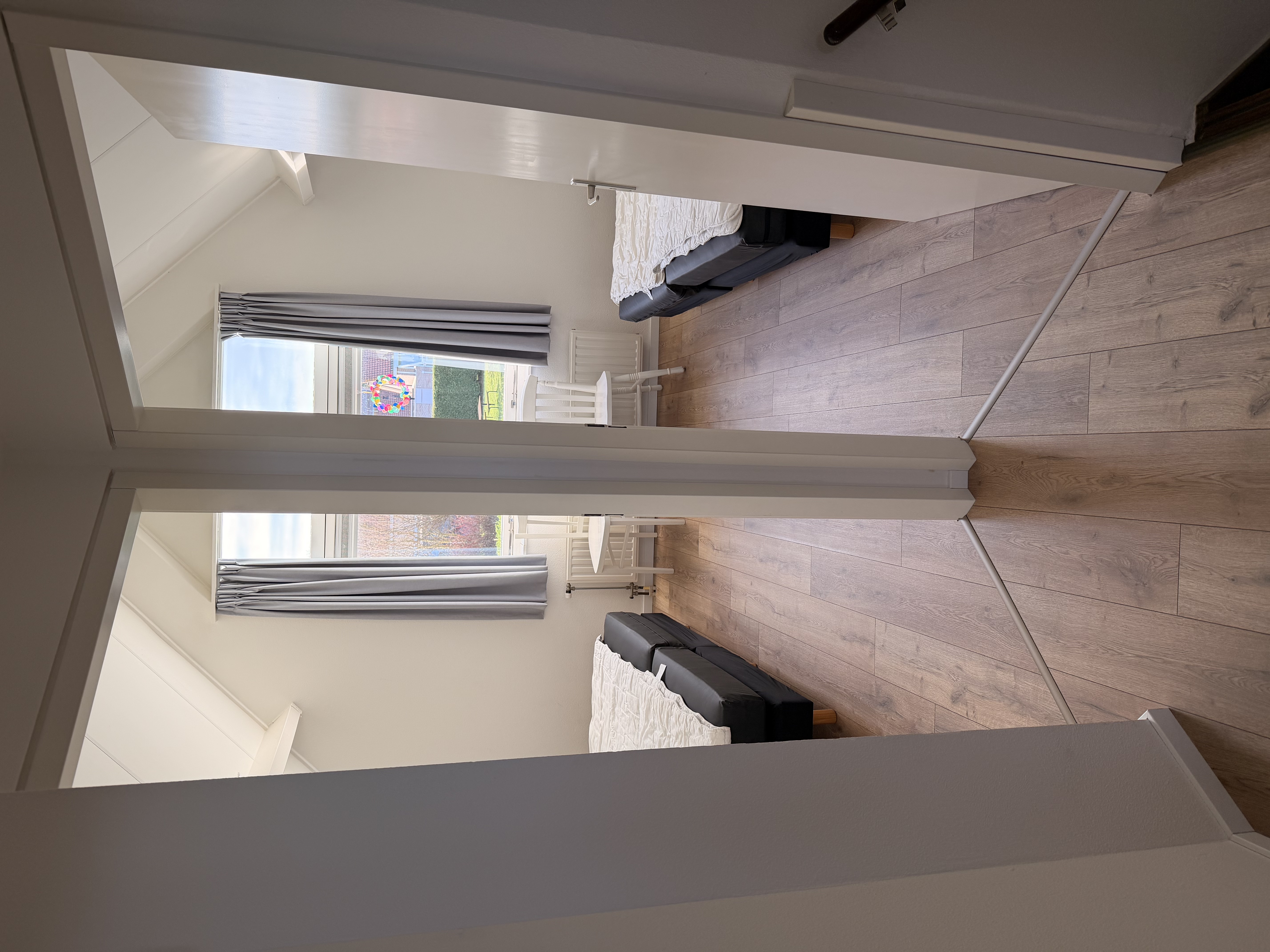 Im Obergeschoss befinden sich drei Schlafzimmer mit insgesamt sechs Einzelbetten. Außerdem gibt es auf dieser Etage ein Badezimmer mit Dusche, Waschbecken und zweiter Toilette.
