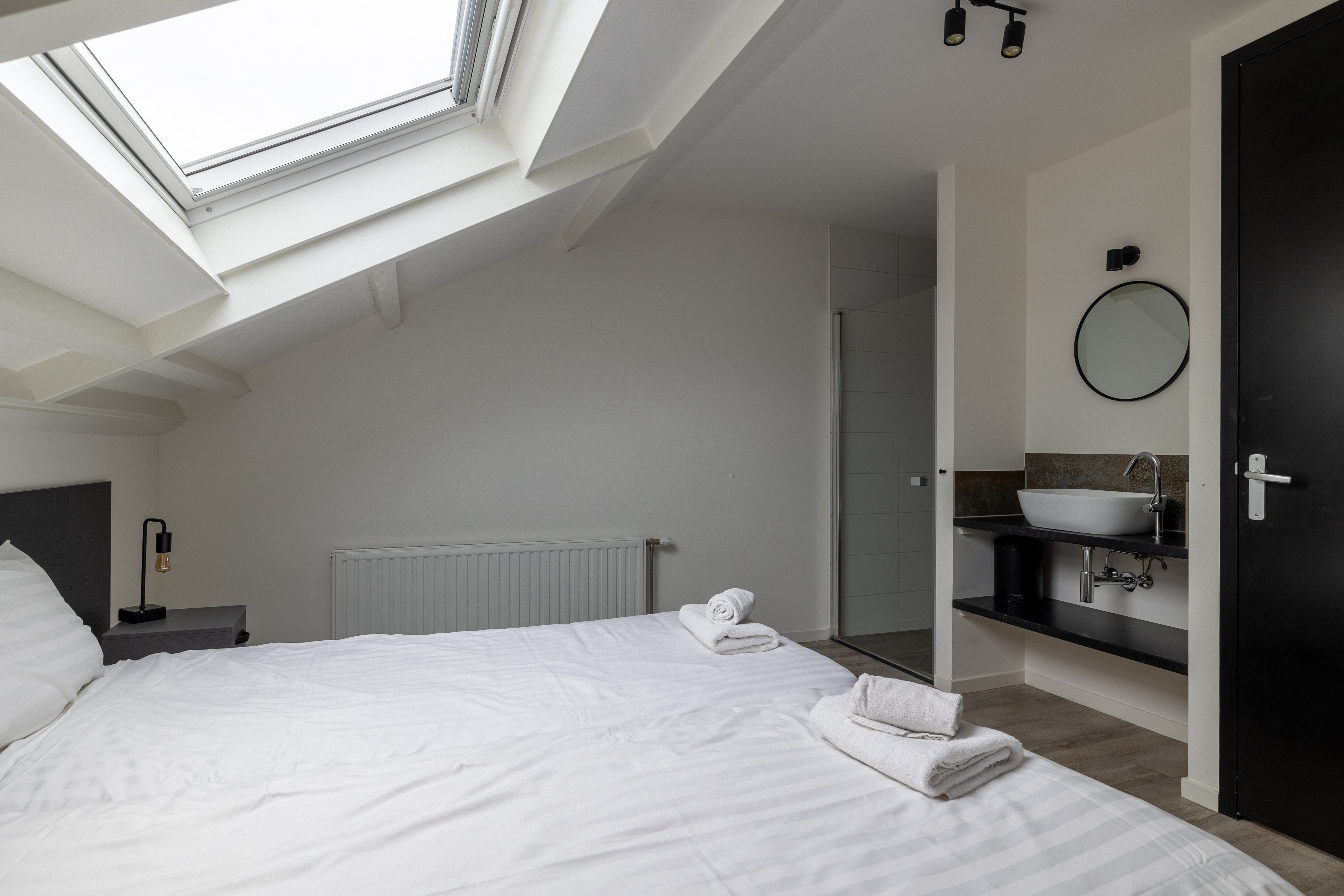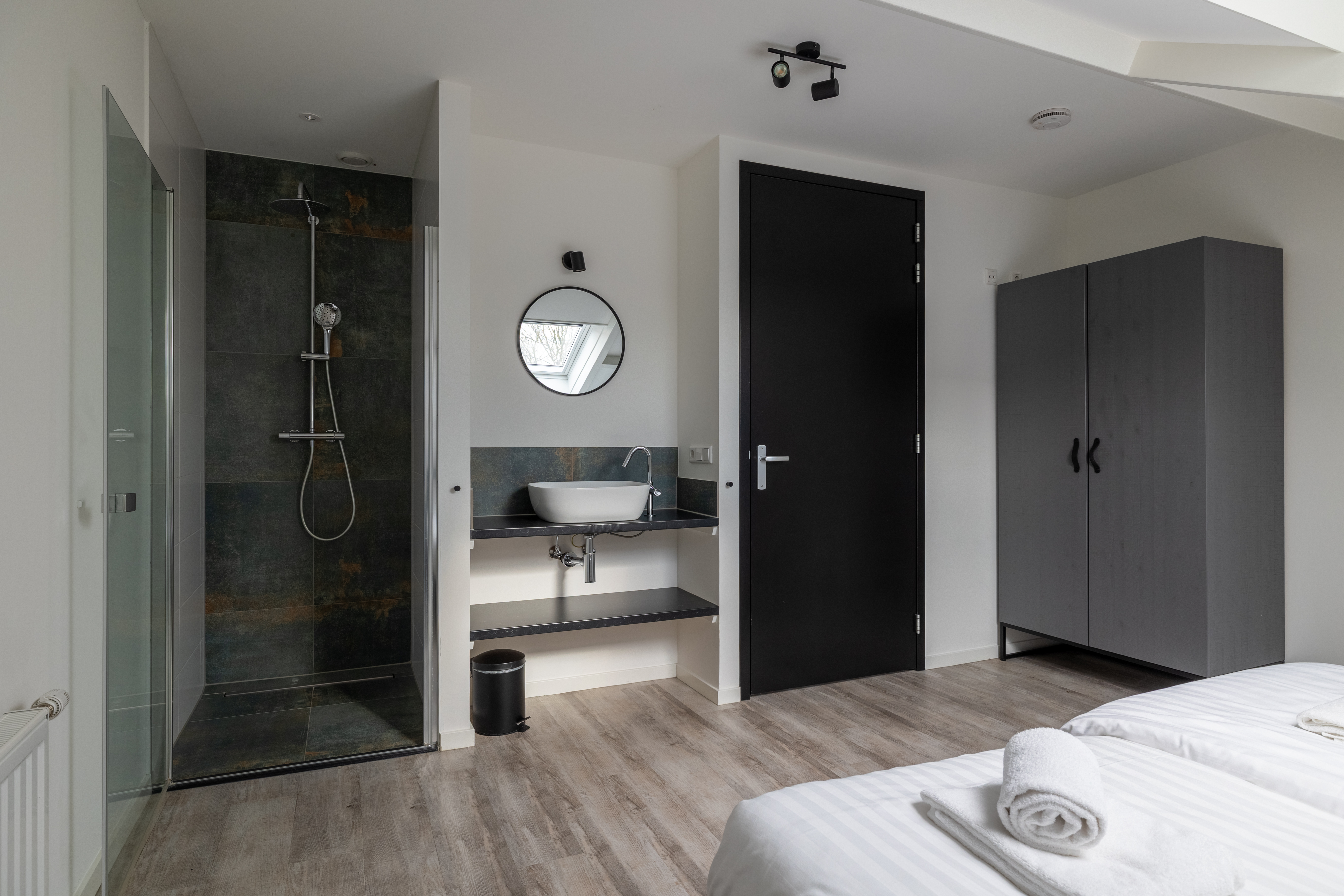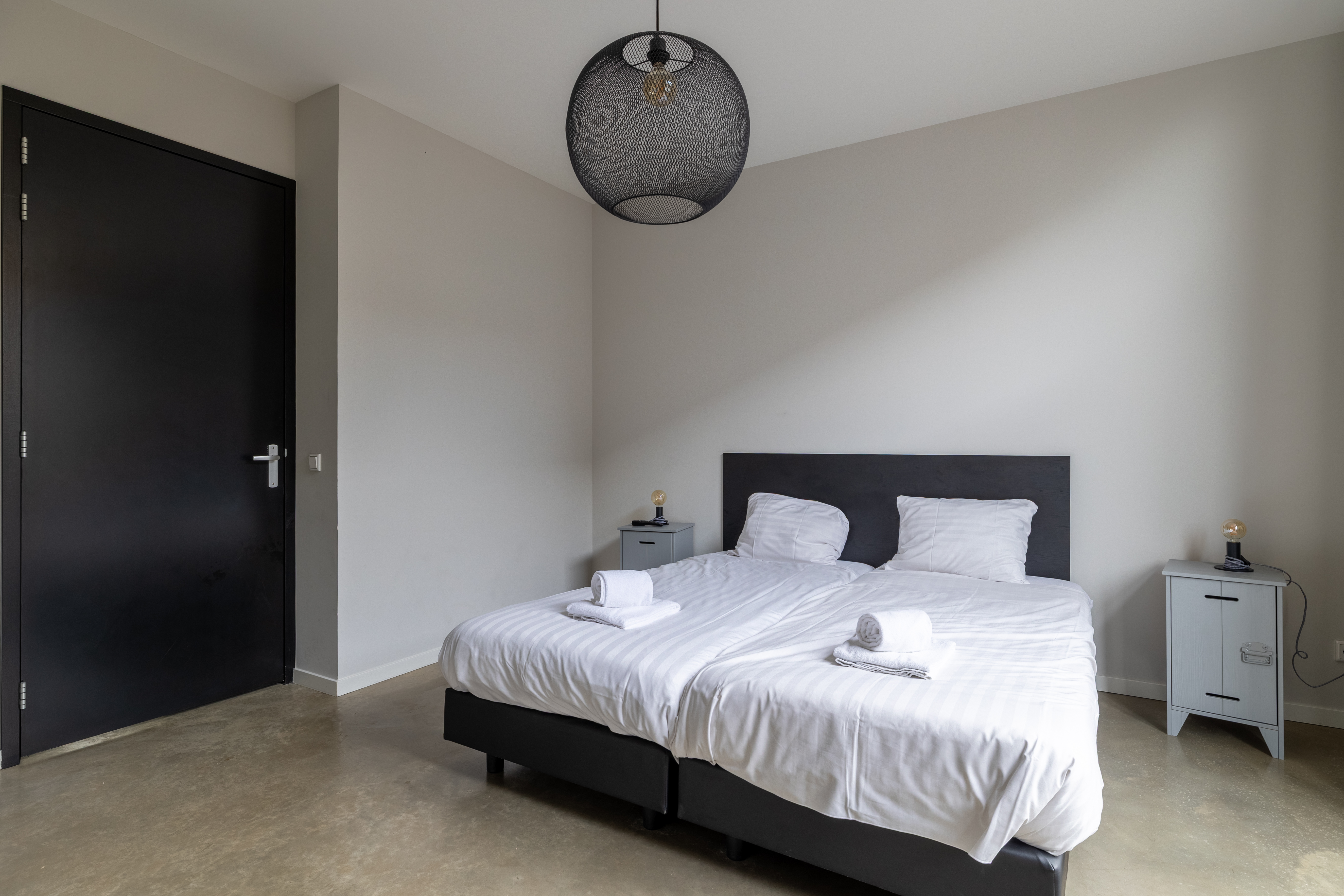 Im Erdgeschoss befindet sich ein Schlafzimmer mit zwei Einzelbetten, während im Obergeschoss zwei weitere Schlafzimmer mit jeweils zwei Einzelbetten liegen. Jede der drei Schlafräume verfügt über ein eigenes, modern eingerichtetes Bad mit Dusche und Waschbecken. Sowohl im Erdgeschoss als auch im Obergeschoss steht ein separates WC zur Verfügung. Kostenloses WLAN ist vorhanden, ebenso wie eine Waschmaschine und ein Trockner, die gemeinschaftlich genutzt werden können.