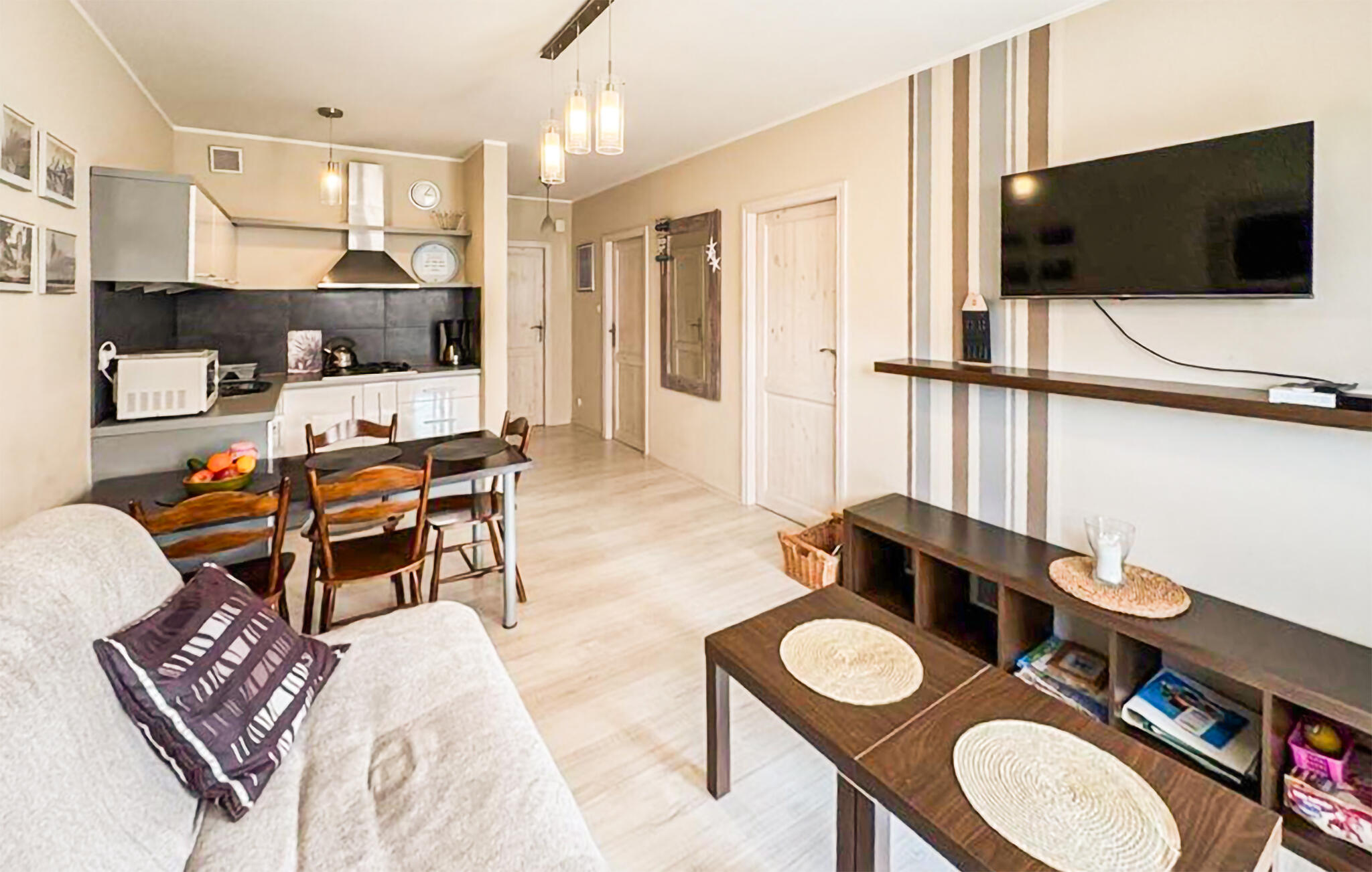 Ein Ferienapartment im Ort Darlowo. Es ist ein komfortables und praktisch möbliert Ferienapart-ment mit Zutritt zum Garten. In der Nahe (1.5 km entfernt) befinden sich ein Strand und viele Tou-ristenattraktionen, z.B. Wasserpark, architektonische Sehenswürdigkeiten, Fischfanggründe, Reitun-terricht und Touristenwege. Kinderfamilien können einen Seilgarten und Vergnügungspark oder ei-nen Spielplatz (nur 40 m entfernt gelegen) besuchen. Fast von der Wohnsiedlung führt eine Prome-nade entlang des Flusses Wieprza, wo ein Freiluft-Fitnessstudio installiert ist. Für Angler gibt es die Möglichkeit, sowohl am Fluss als auch auf offener See zu angeln. Es gibt auch einen Seilpark und ein Hallenbad vor Ort. Für die Personen, die Ruhe und Erholung brauchen, bieten wir einen Kurort 7 km entfernt von Darlowo. Hier findet jeder die geeignete Tätigkeit um den Urlaub erfolgreich zu gestalten.